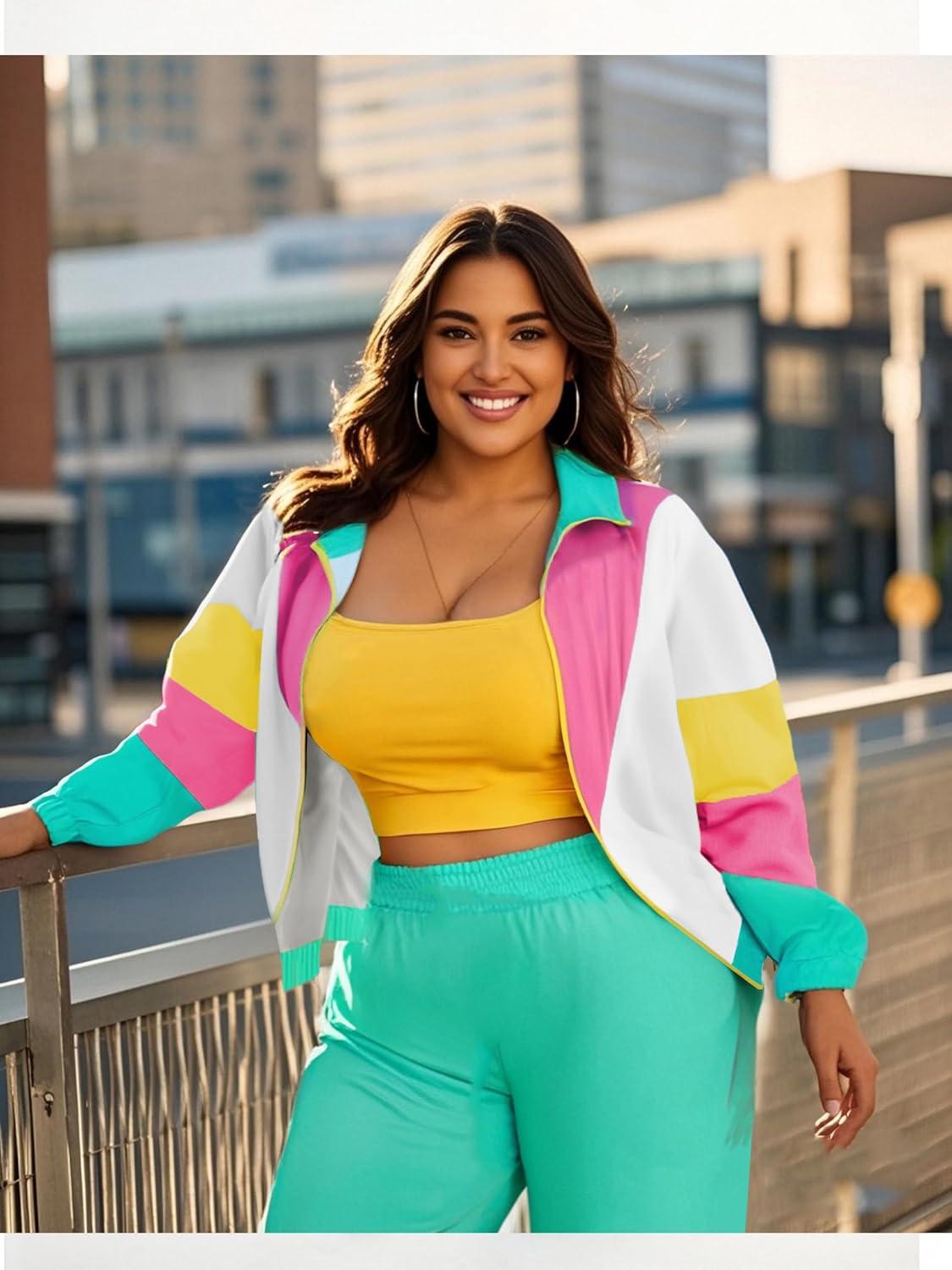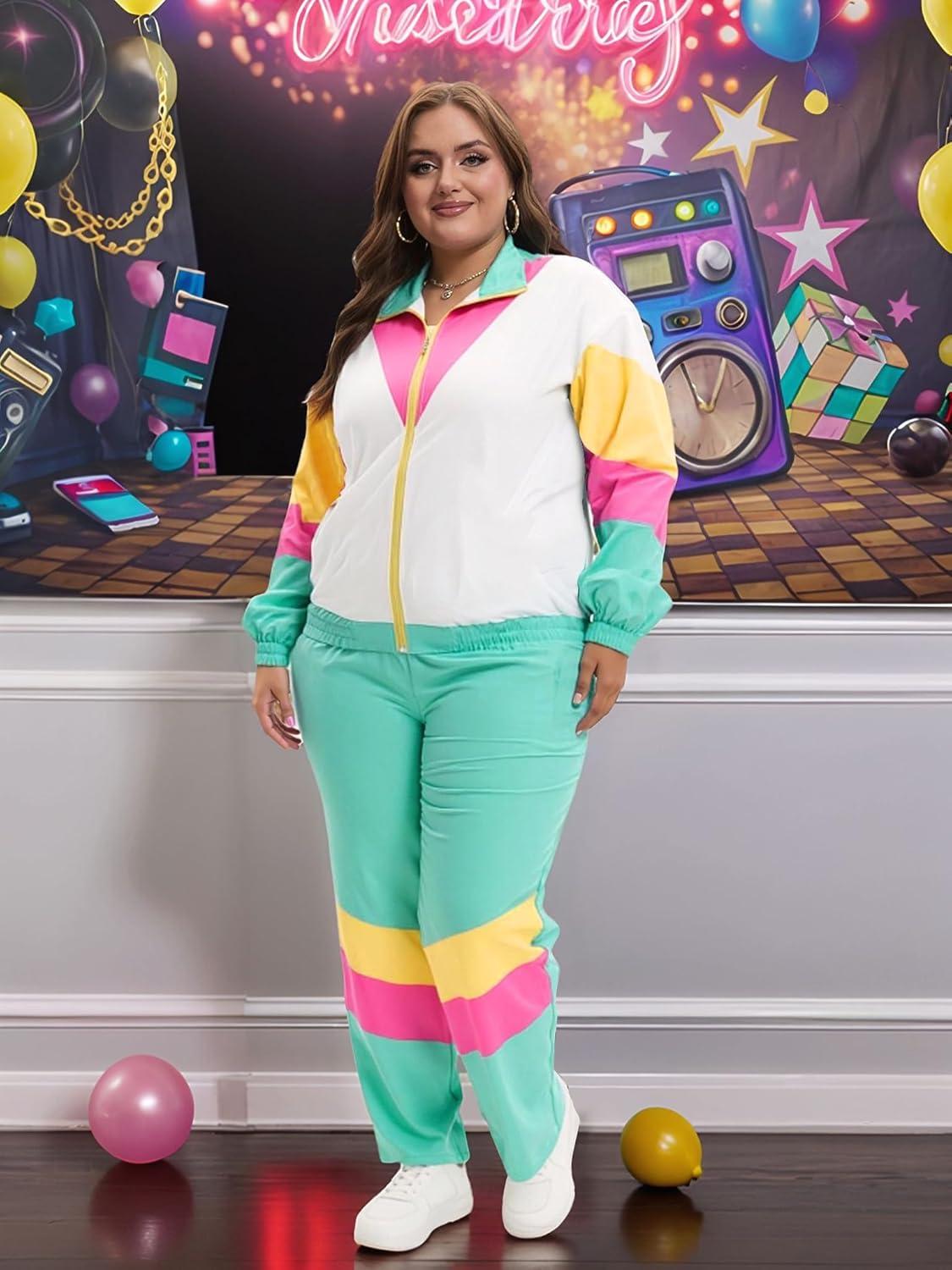 UOUA Plus Size 80s Outfit for Women 90s Costume Long Sleeves Windbreaker 2 Piece Party Tracksuit(Brown White)