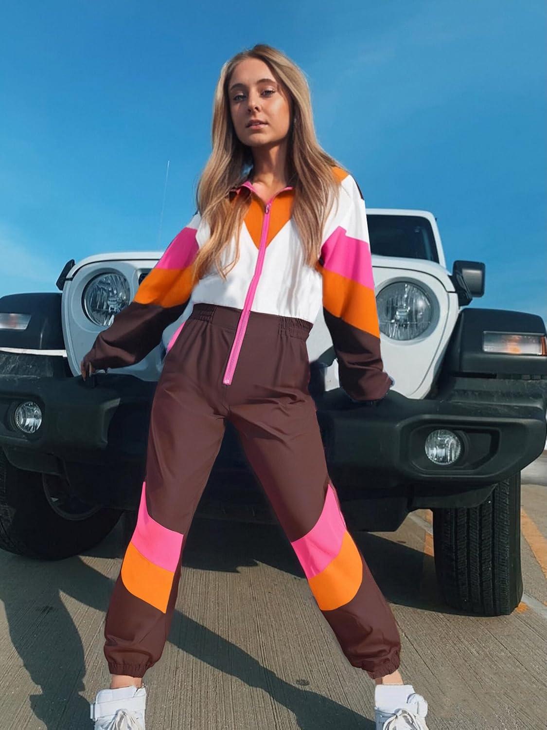 imageUOUA 80s Outfit for Women 90s Costume Jumpsuits Long Sleeves Windbreaker One Piece Party TracksuitBrown White