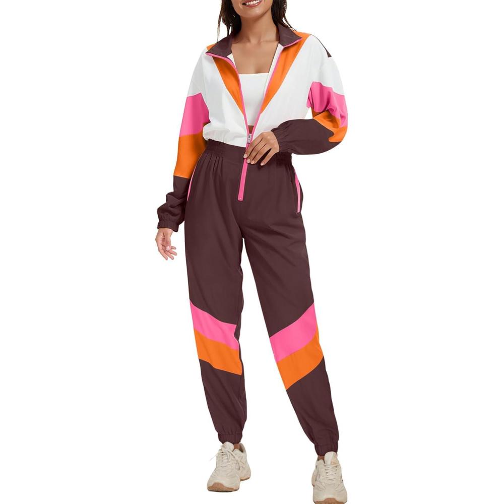 UOUA 80s Outfit for Women 90s Costume Jumpsuits Long Sleeves Windbreaker One Piece Party Tracksuit(Brown White)