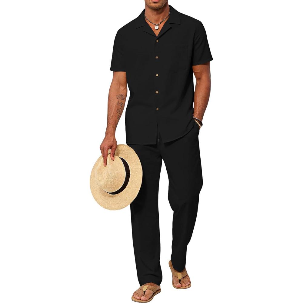 Men's Two-piece Casual Cotton Linen Set Short Sleeve Beach Shirts and Long Pants. Mens 2-Piece short sleeve outfits set made of linen fabric, durable enough for your daily wearing.The men guayabera button up shirts with camp collar, a chest pocket, untuck design provide retro and cool style on vacation days.