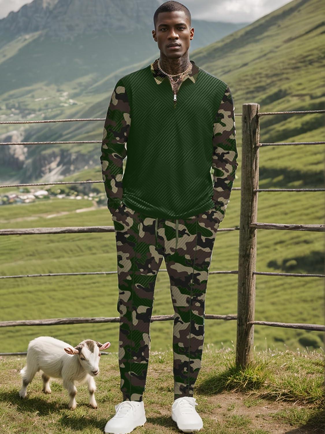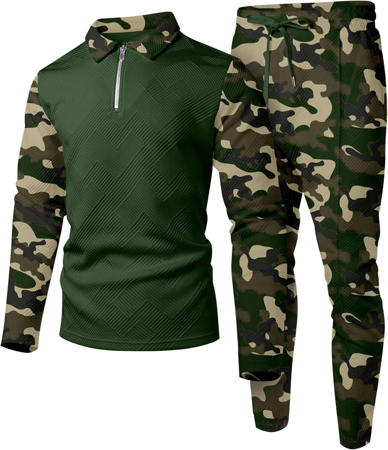 UOUA Mens 2 Piece Set Casual Outfits 1/4 Zip Polo Long Sleeve Shirt & Pants Track Suit Loungewear Athletic Sweatsuit(Green Camouflage)