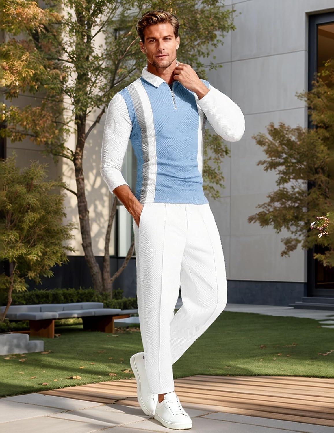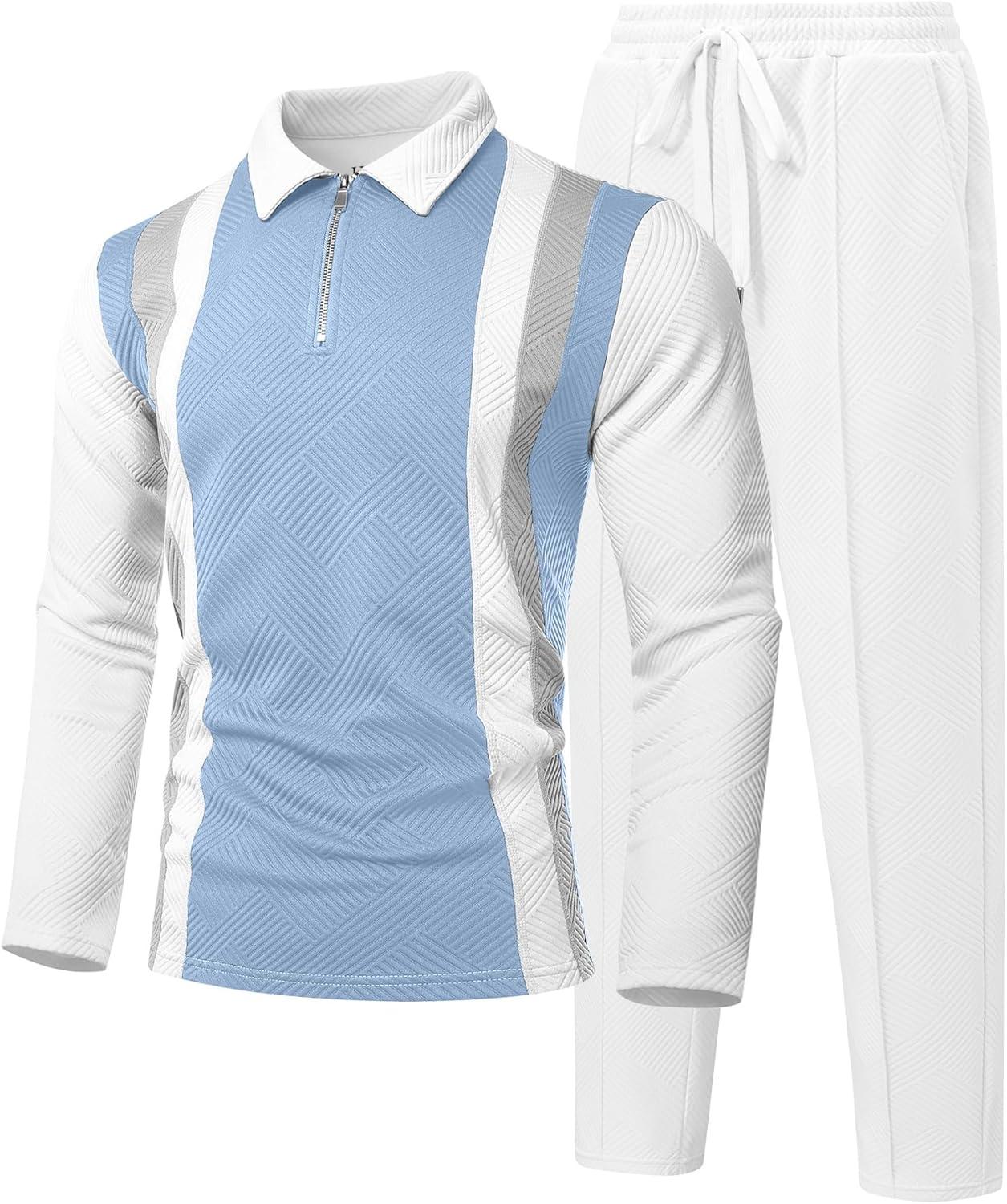UOUA Mens 2 Piece Set Casual Outfits 1/4 Zip Polo Long Sleeve Shirt & Pants Track Suit Loungewear Athletic Sweatsuit(White Blue Block)