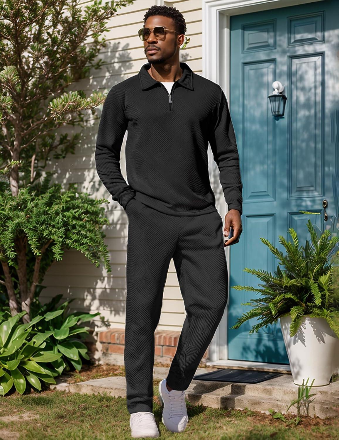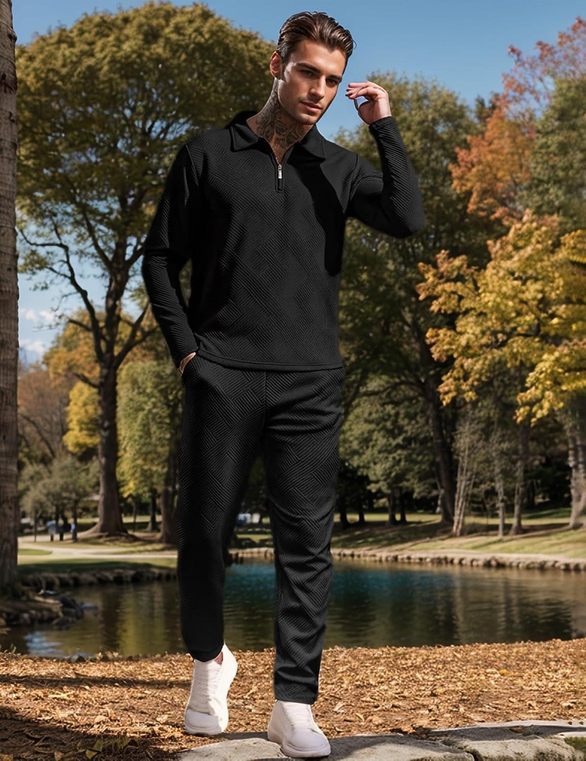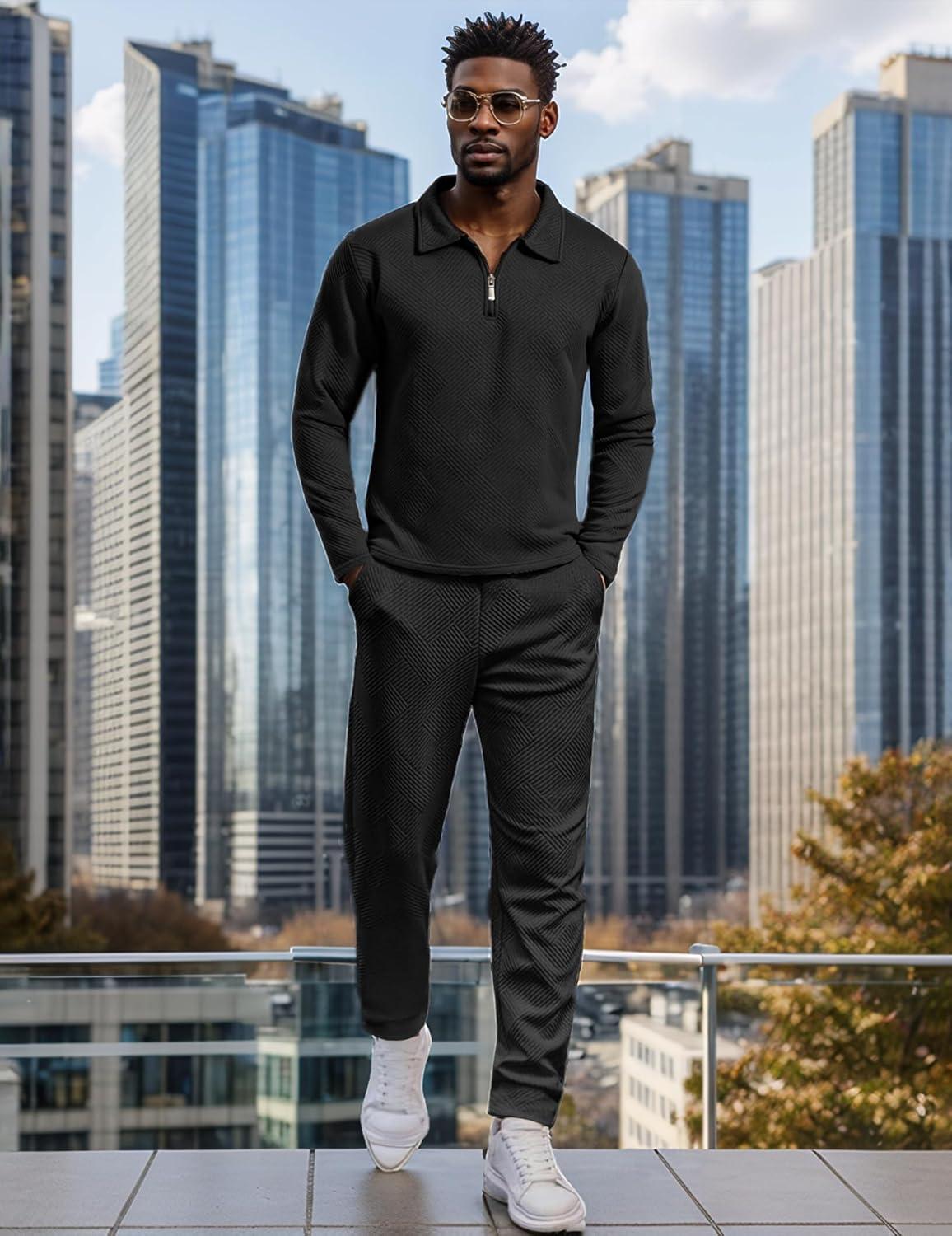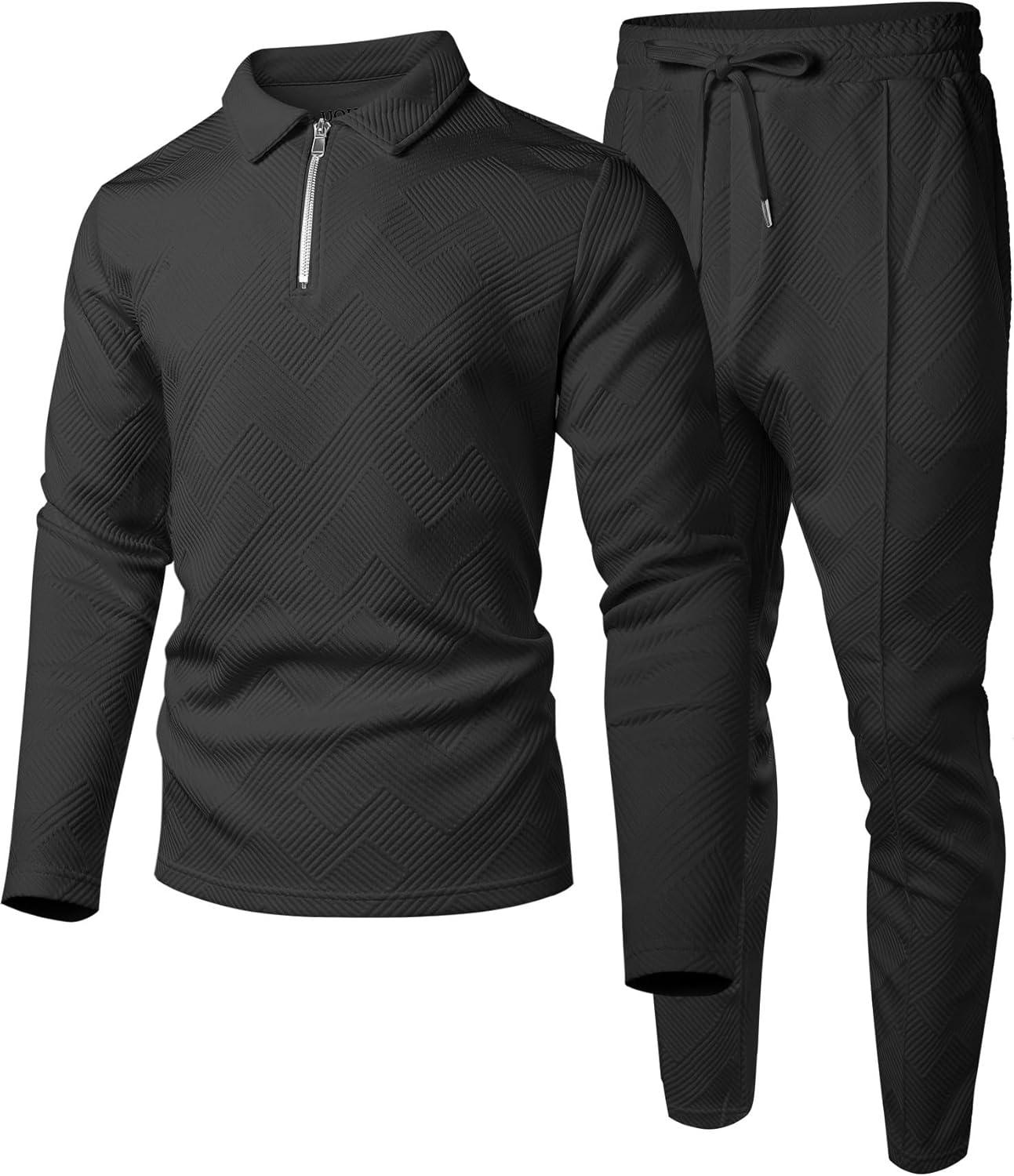 UOUA Mens 2 Piece Set Casual Outfits Polo Long Sleeve Shirt & Pants Tracksuit Loungewear Athletic Jogger Sweatsuit(Black)
