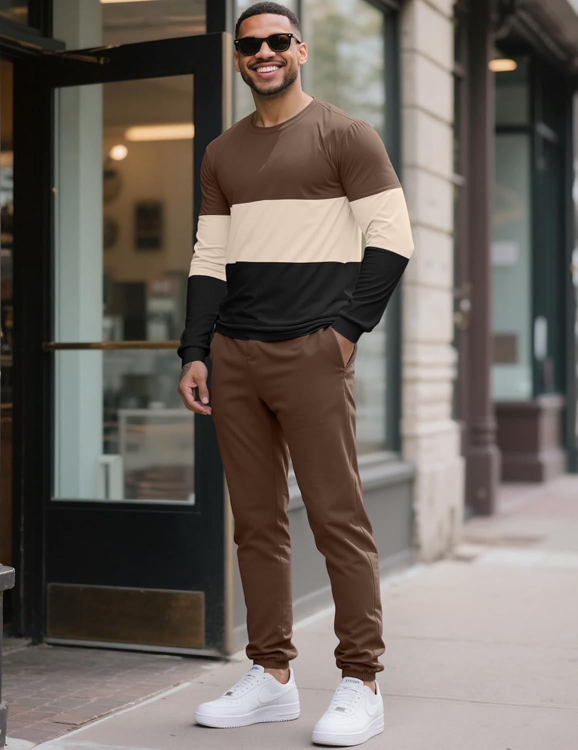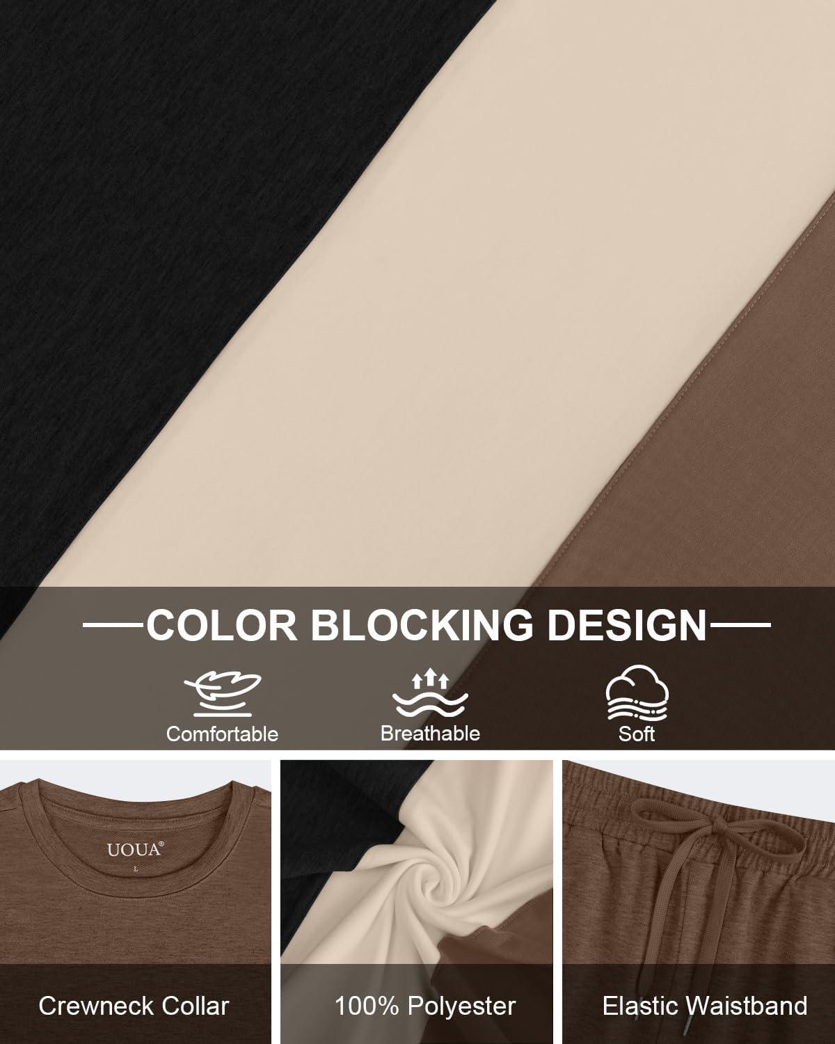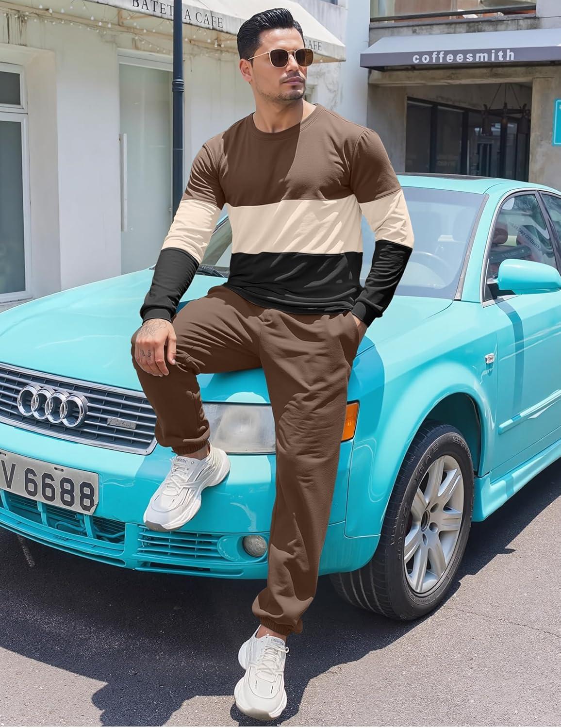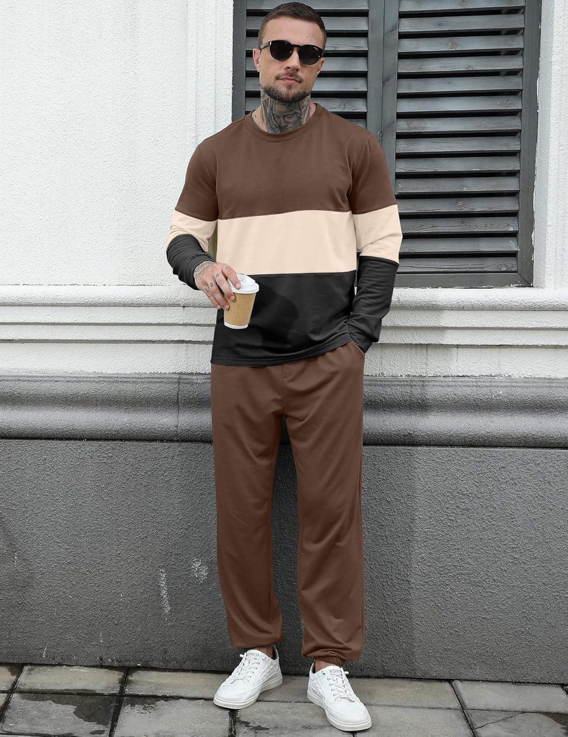 UOUA Mens 2 Piece Sweatsuits Outfits Color Block Loungewear & Joggers Sweatpants Casual Track Suits Set(Brownblockbeige)