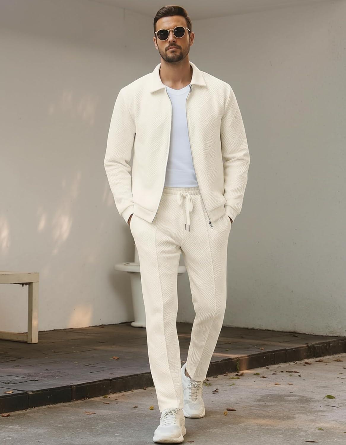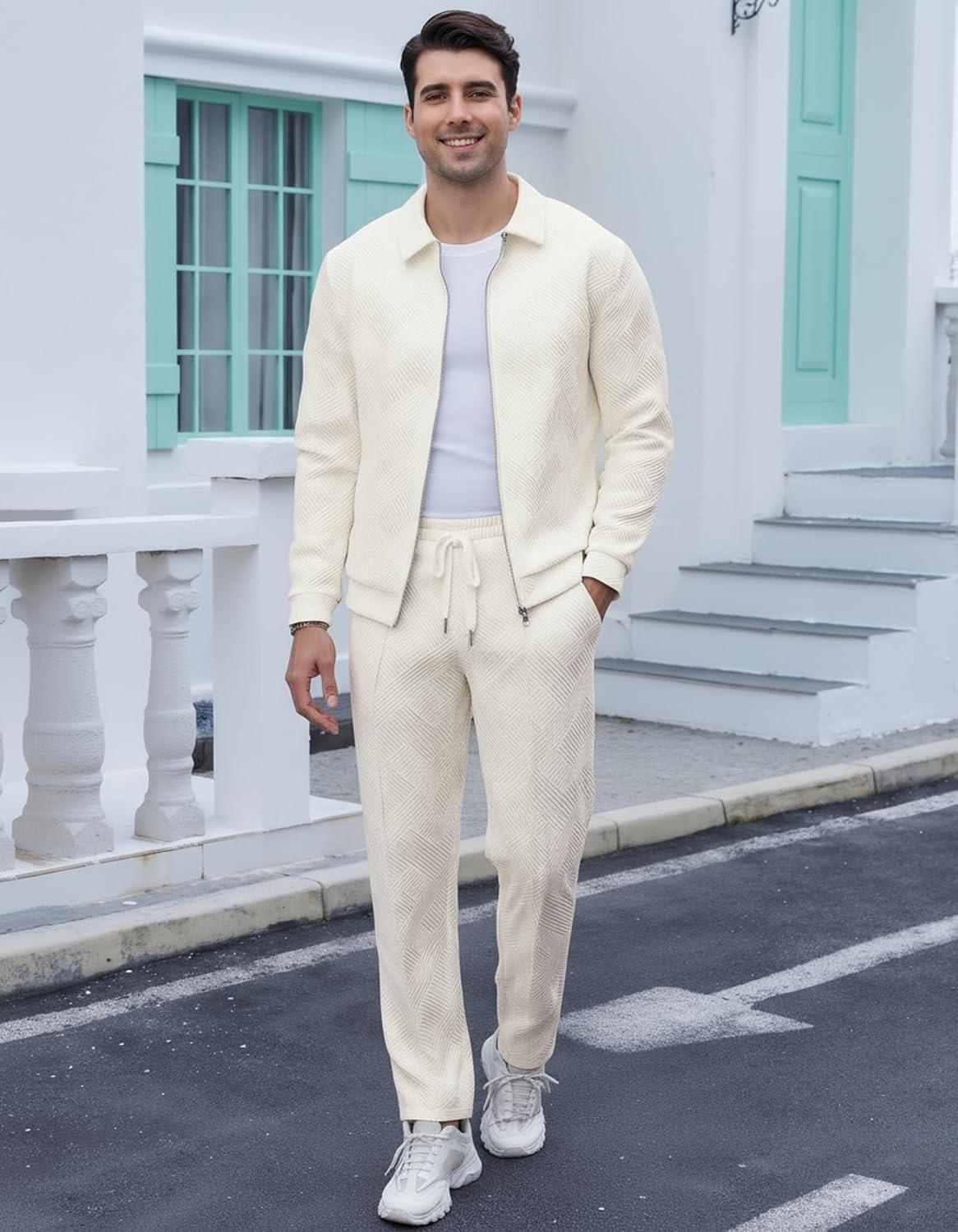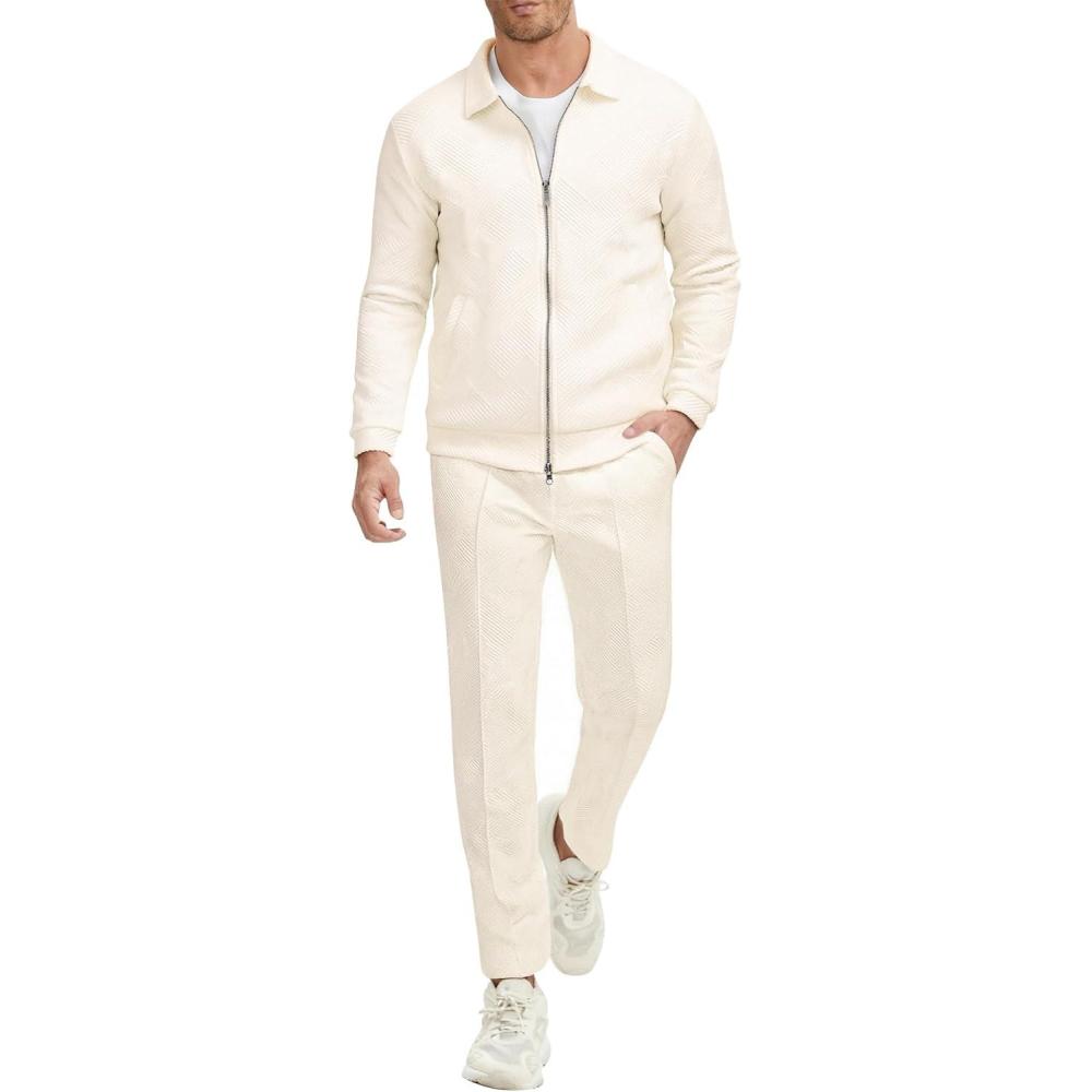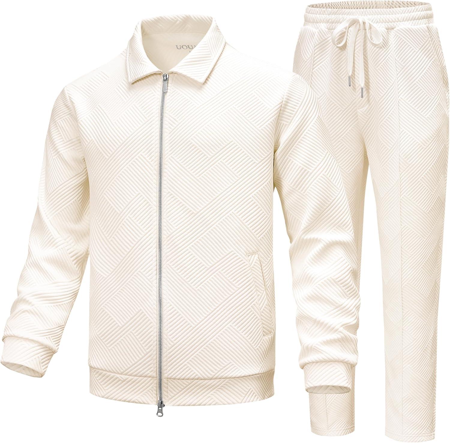UOUA Mens 2 Piece Tracksuits Set Casual Jacquard Sweatsuits Outfits Full-Zip Jakcet & Loose Jogging Pants(Beige)