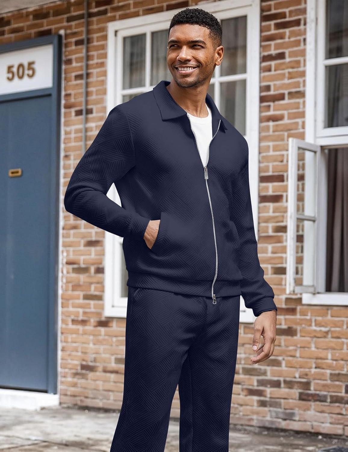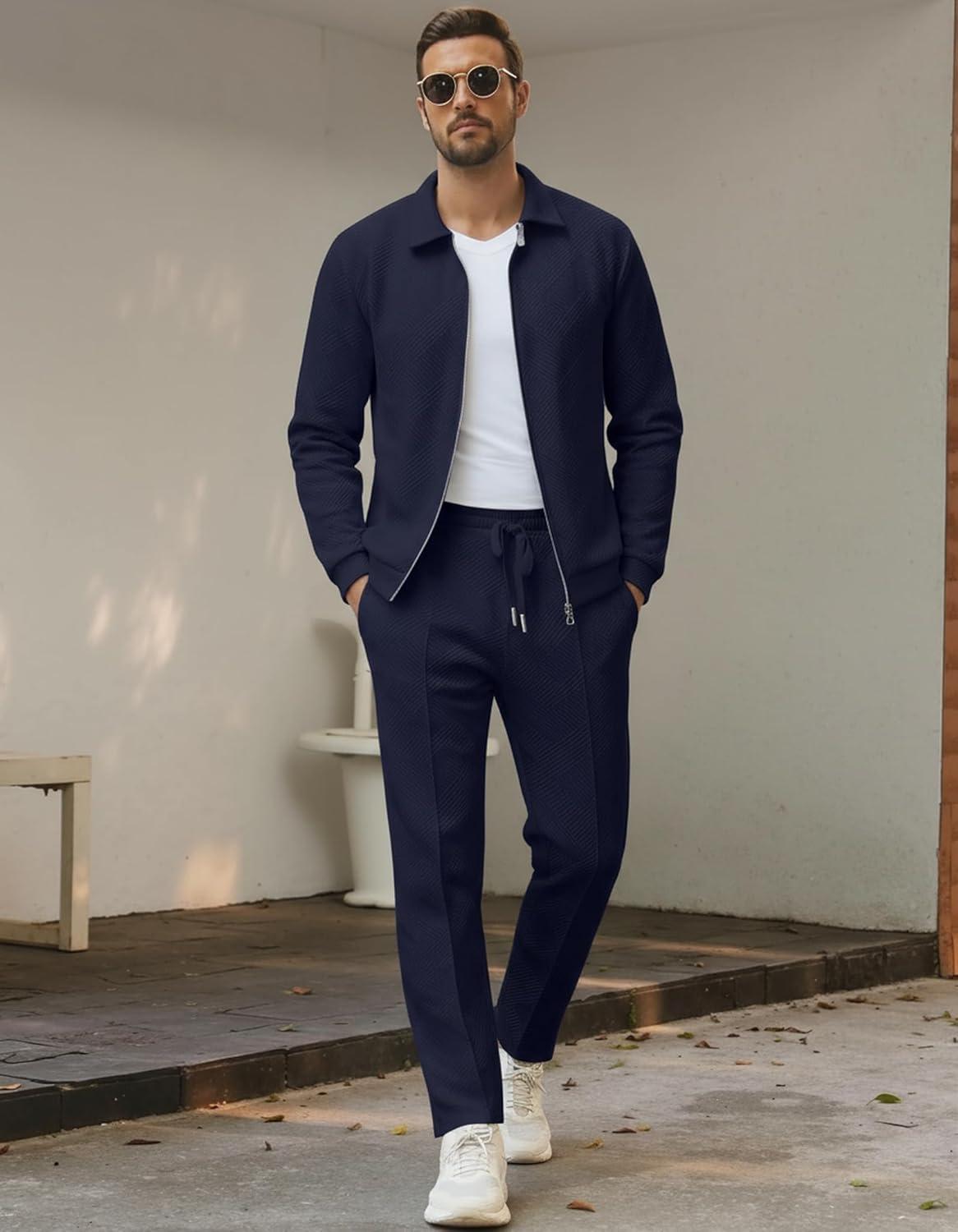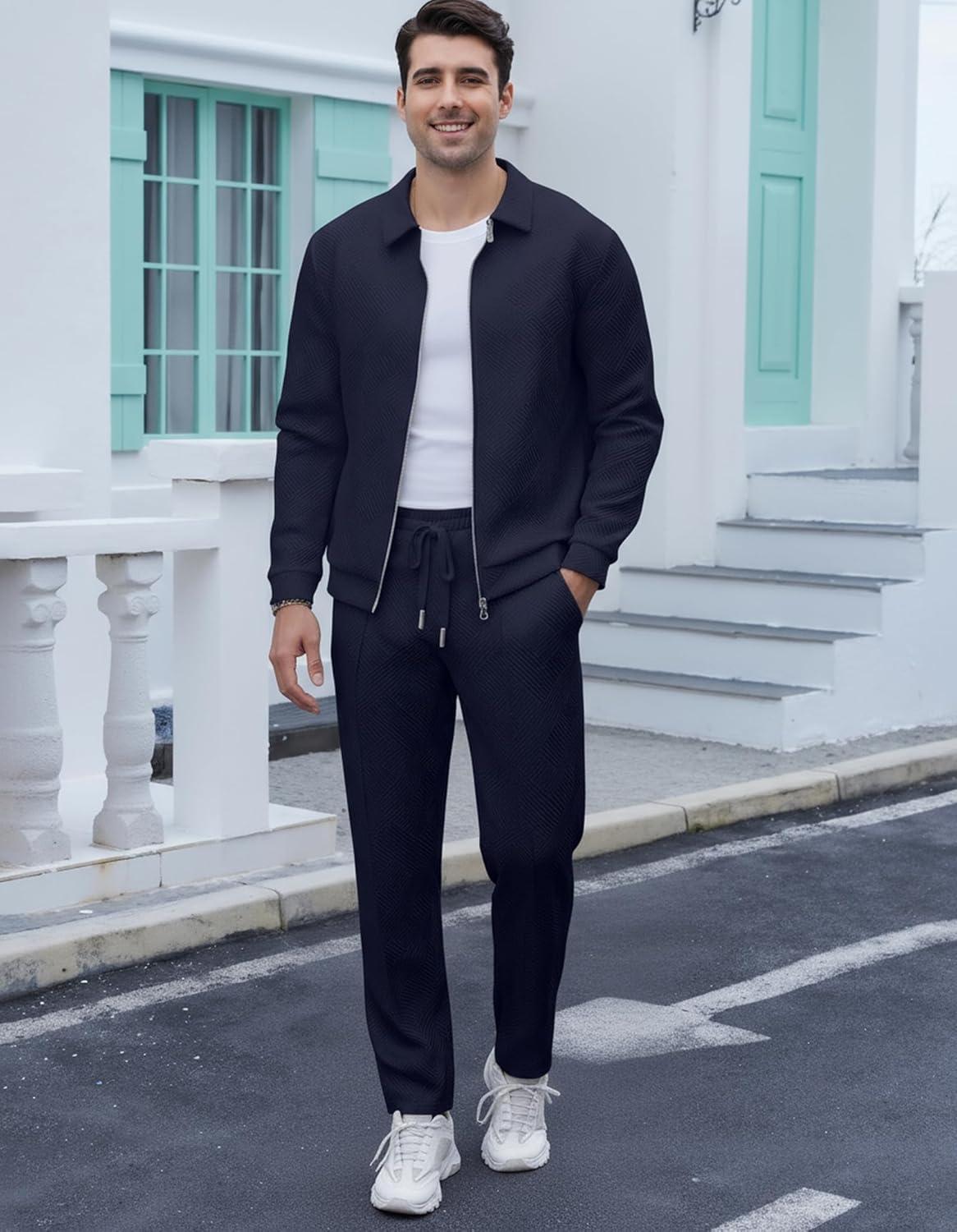 UOUA Mens 2 Piece Tracksuits Set Casual Jacquard Sweatsuits Outfits Full-Zip Jakcet & Loose Jogging Pants(Navy Blue)