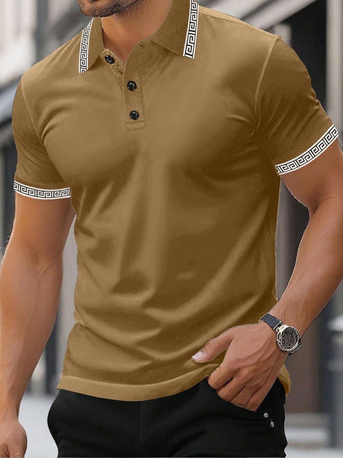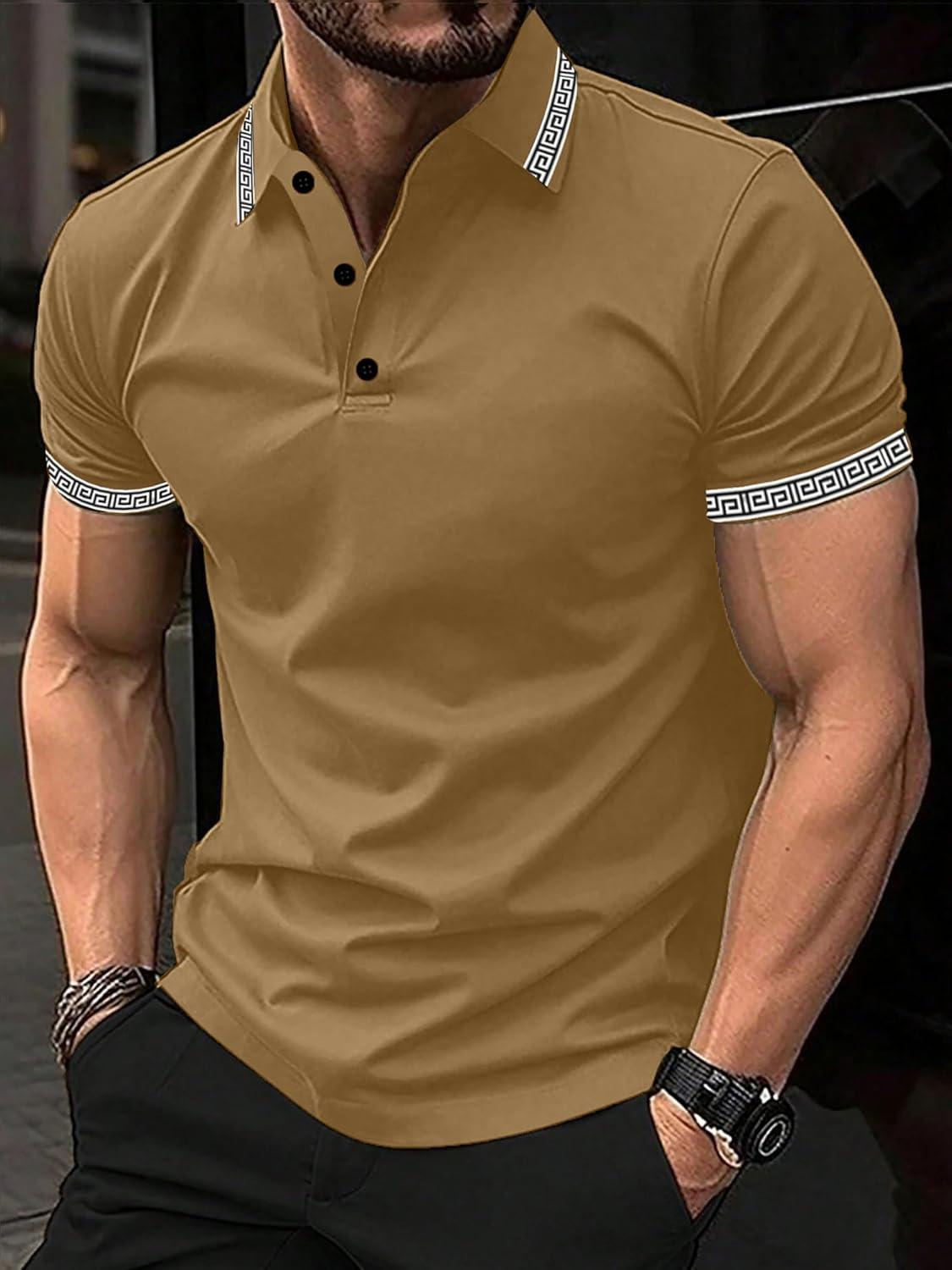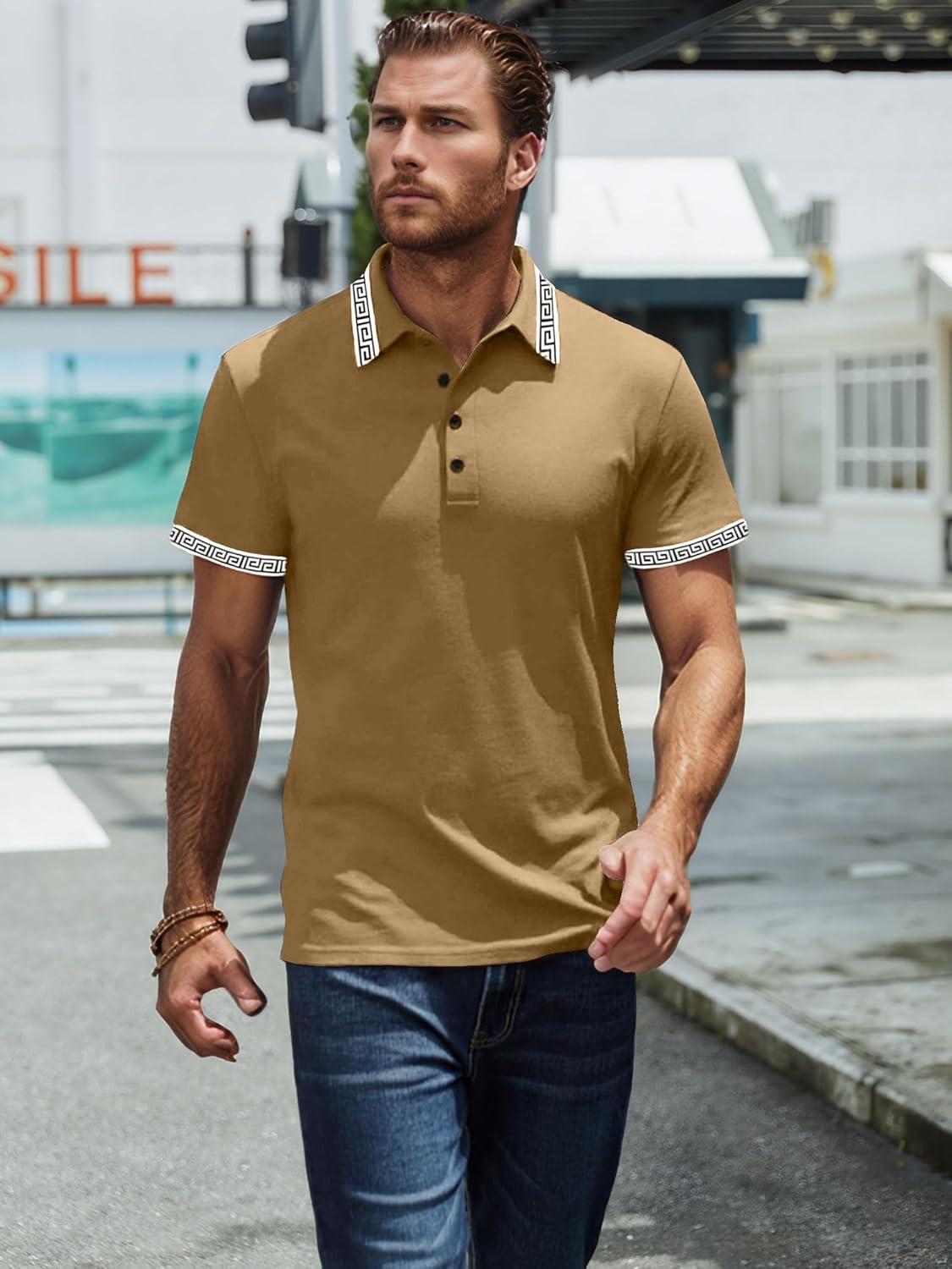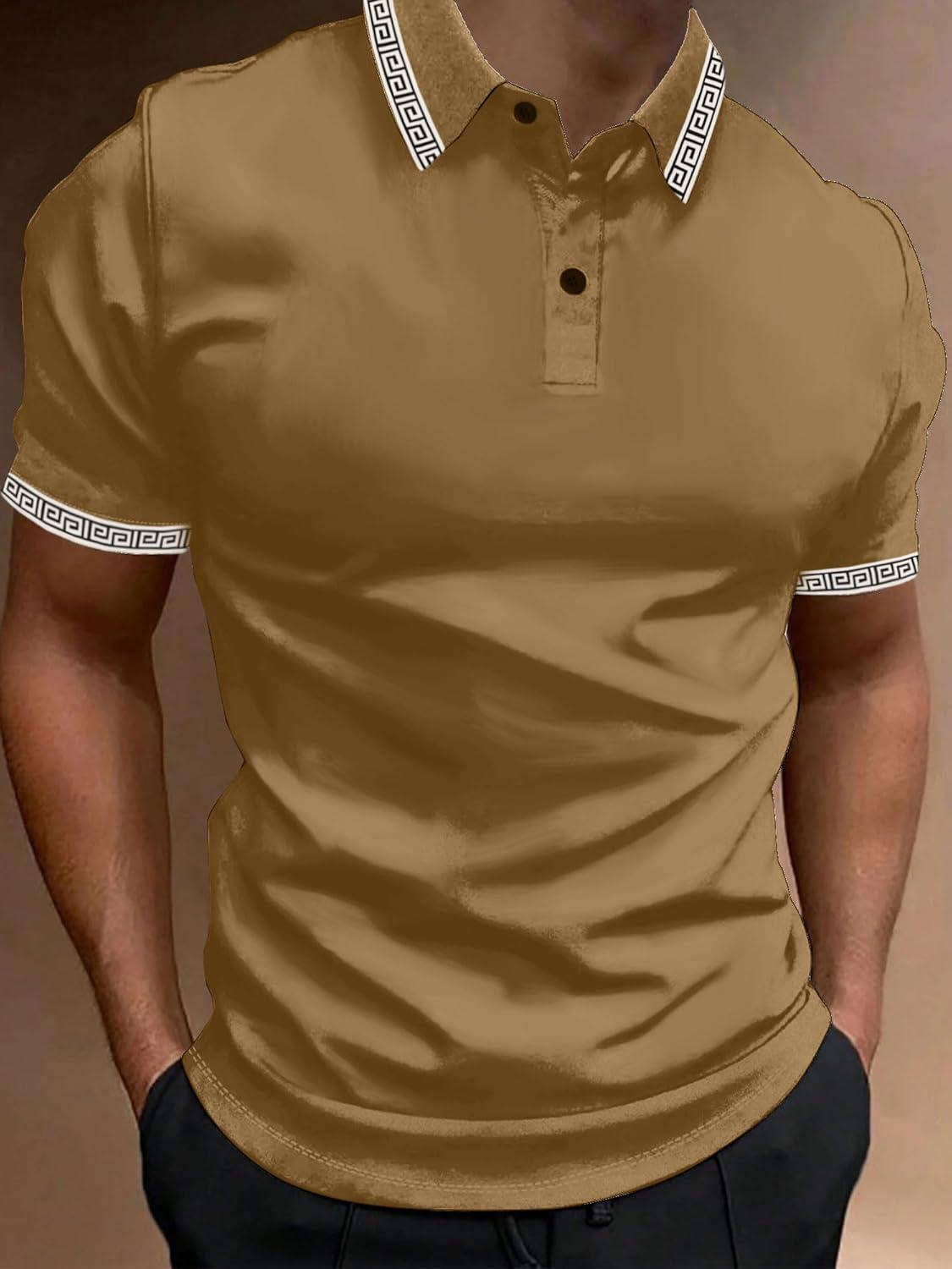 UOUA Mens Casual Polo Shirts Classic Short Sleeve Collared T Shirt Button Golf Slim Fit Tee Tops(01 Brown)