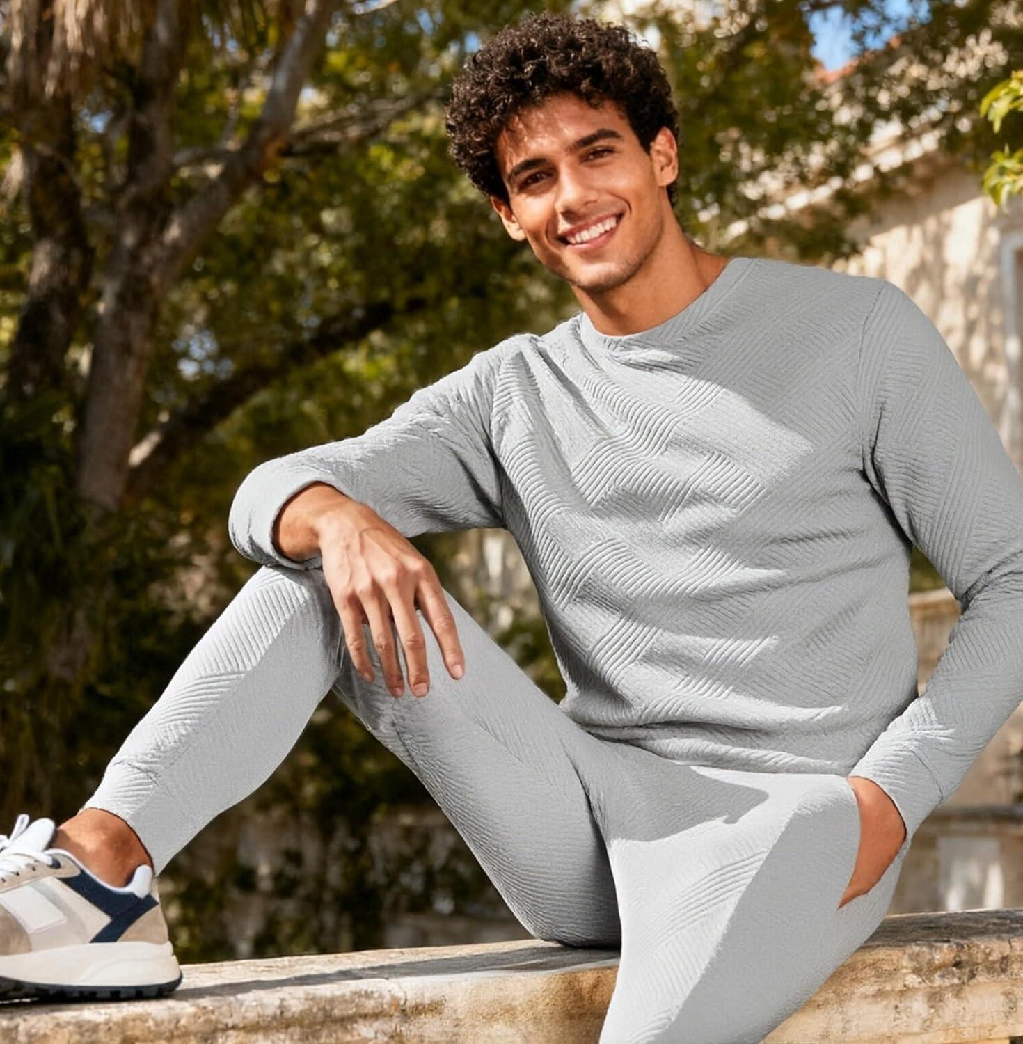 UOUA Men’s Crewneck Sweatshirt Jacquard Texture Pullover Casual Long Sleeve Shirt for Fall Winter(Mottle Grey)