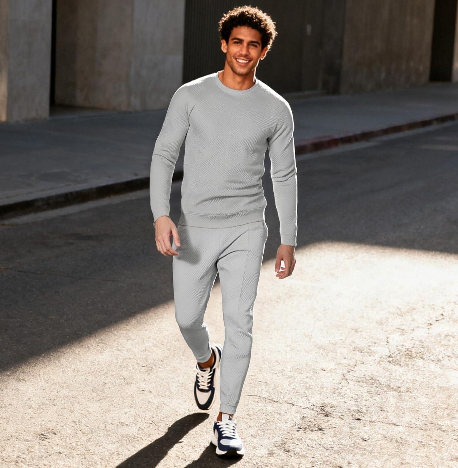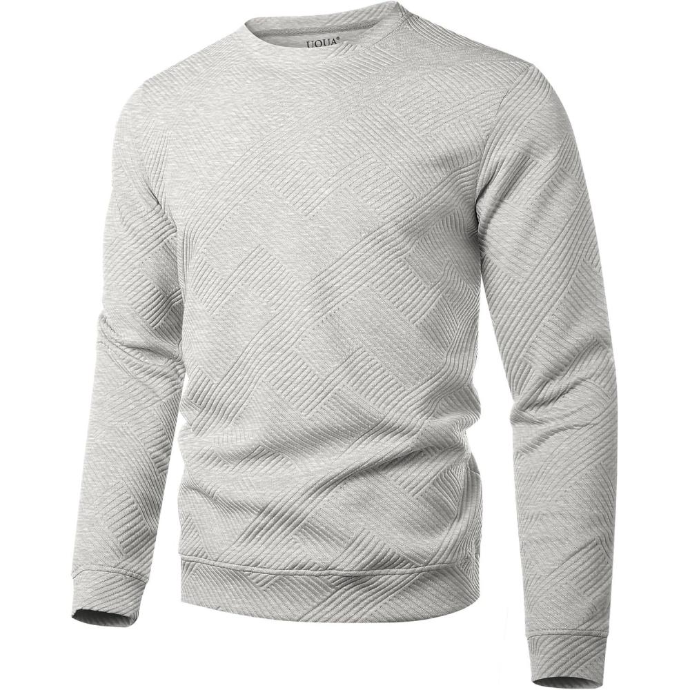UOUA Men's Crewneck Sweatshirt Jacquard Texture Pullover Casual Long Sleeve Shirt for Fall Winter(Mottle Grey)