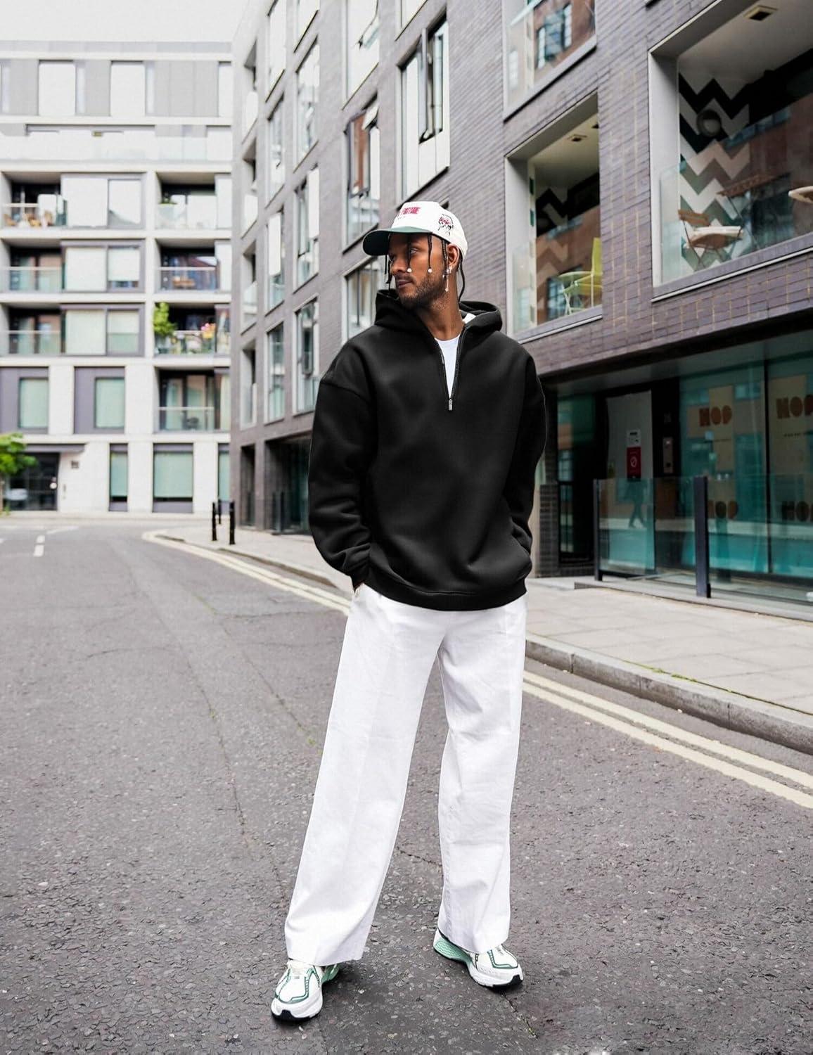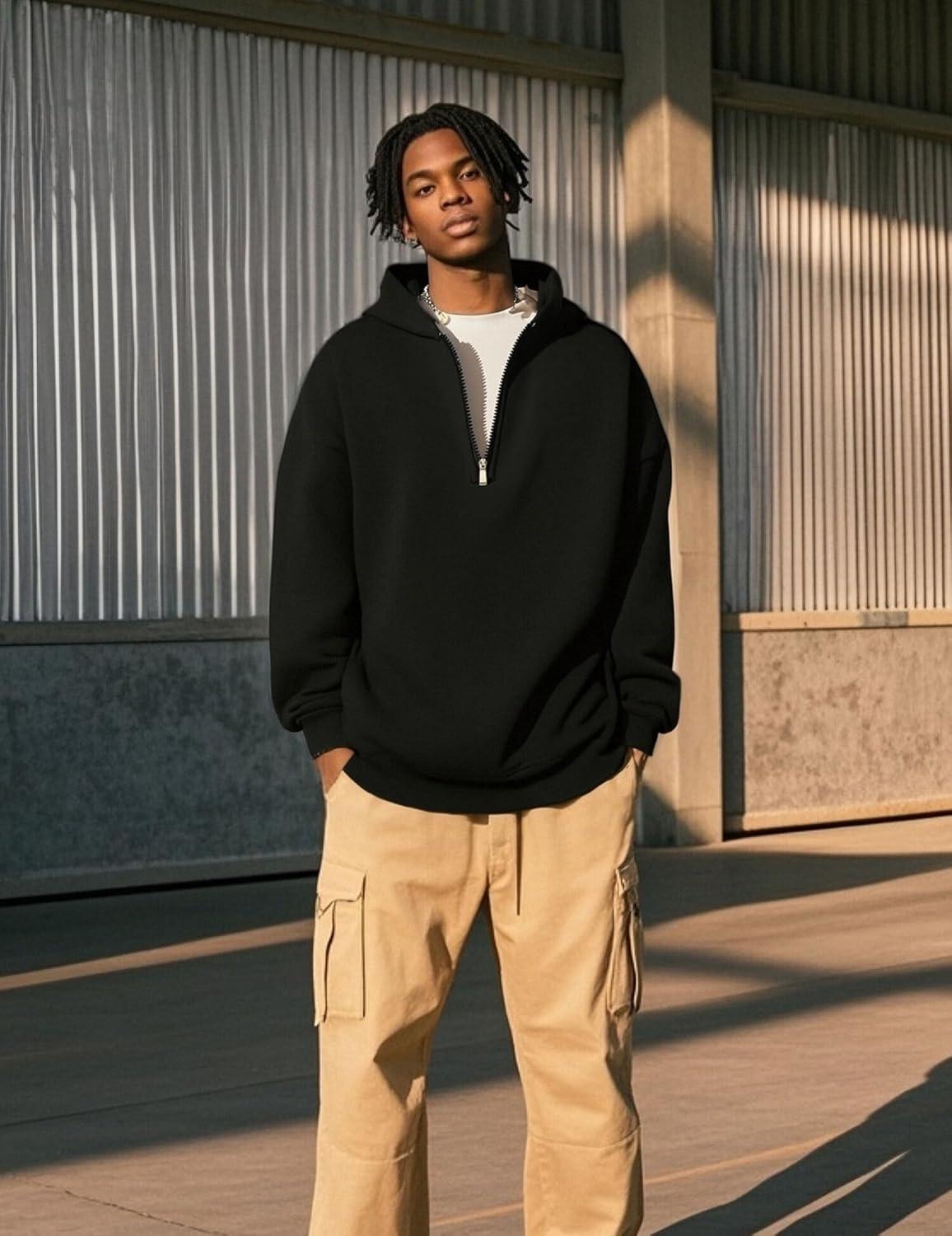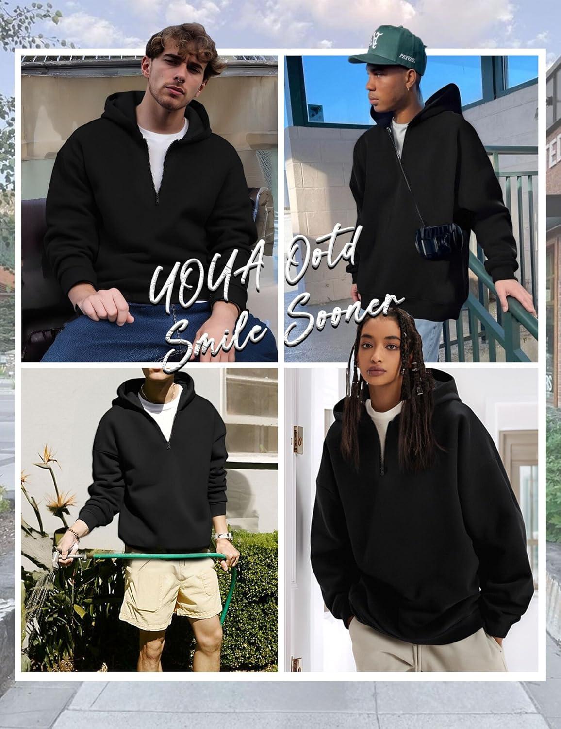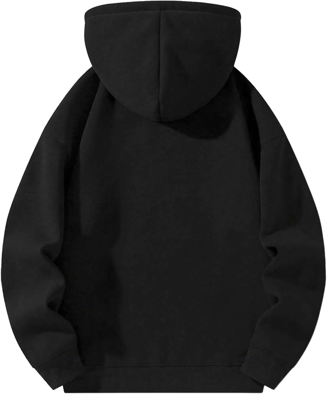 UOUA Men’s Graphic Quarter Zip Hoodies Casual Long Sleeve Drop Shoulder Sweatshirt Pullover Streetwear Top(Black)