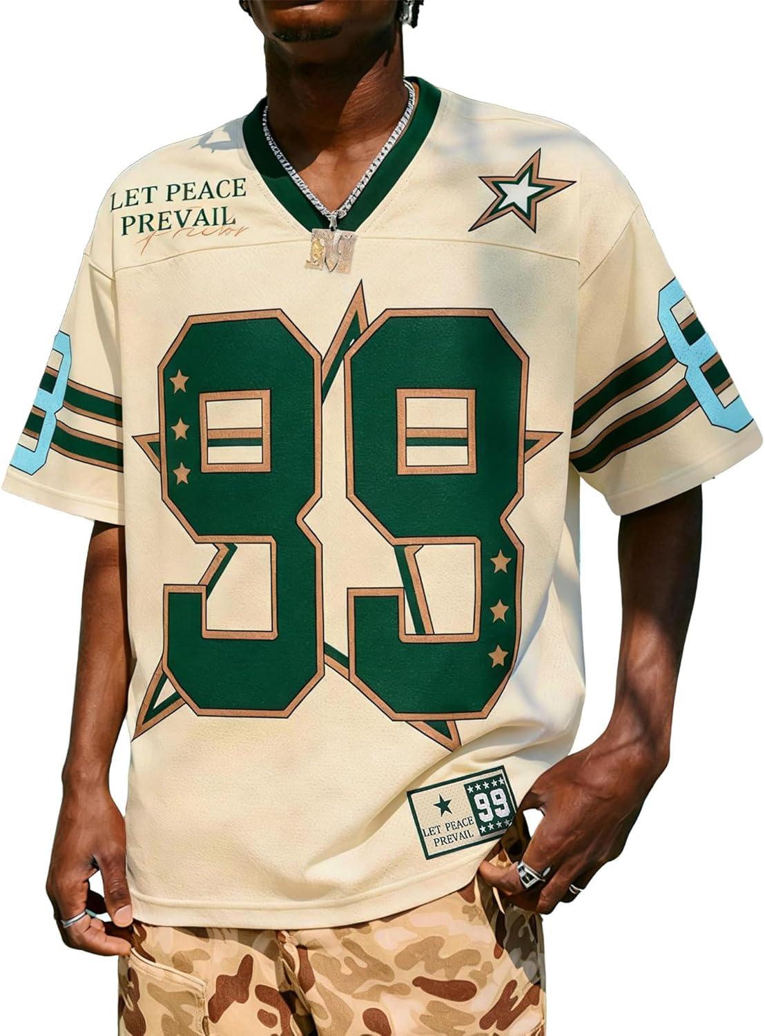 UOUA Mens Jersey Y2k Baggy Shirts Number Graphic Tees Oversized V Neck Tshirts Streetwear Tops(Beige)