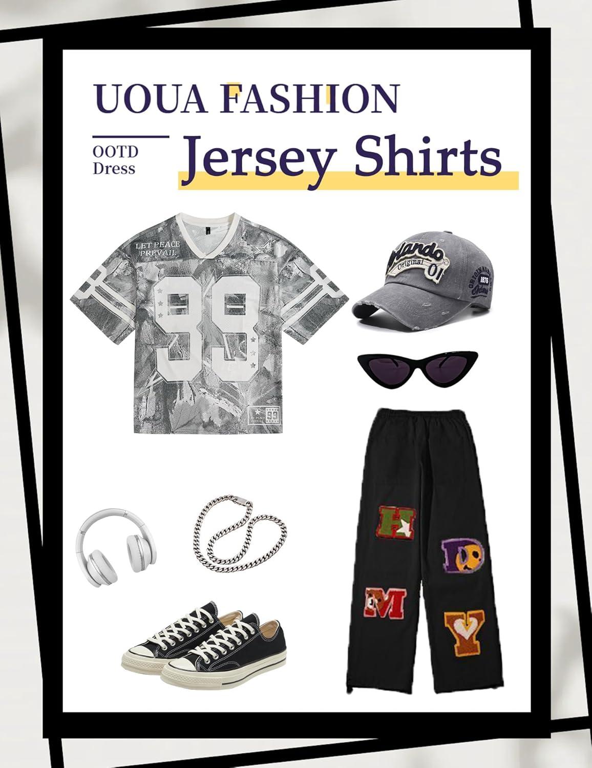 UOUA Mens Jersey Y2k Baggy Shirts Number Graphic Tees Oversized V Neck Tshirts Streetwear Tops(White)
