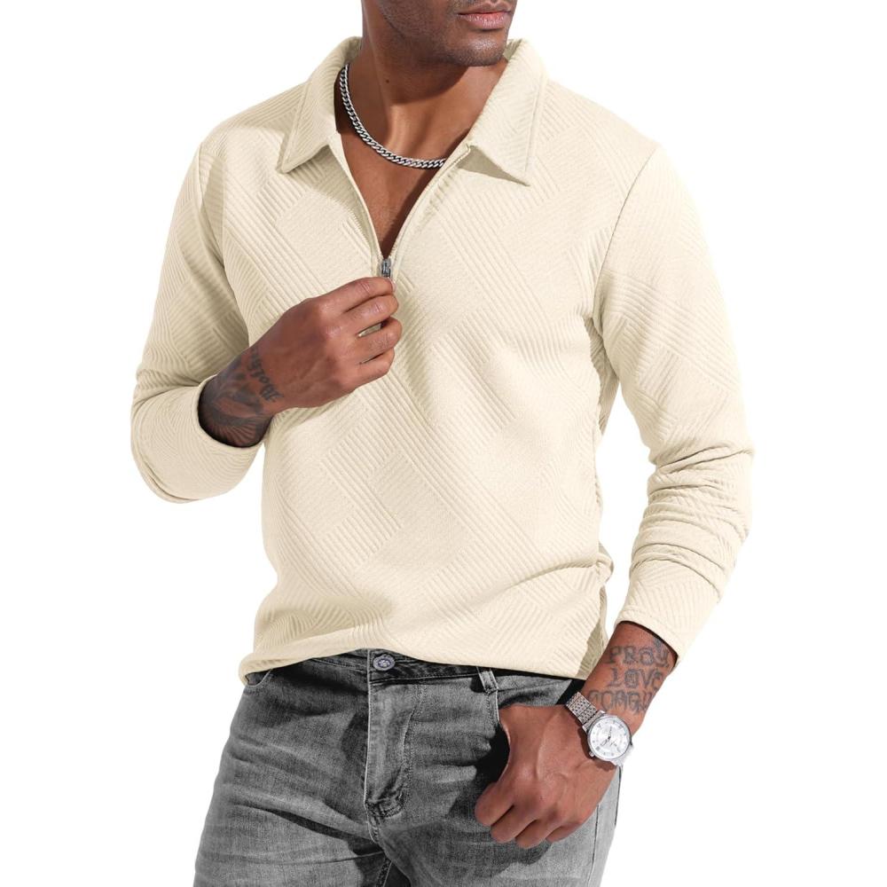 UOUA Men's Polo Shirt Quarter Zip Tops Soild Casual Geometric Texture Long Sleeve Sweaters Pullover Golf Sweatshirts(Apricot)
