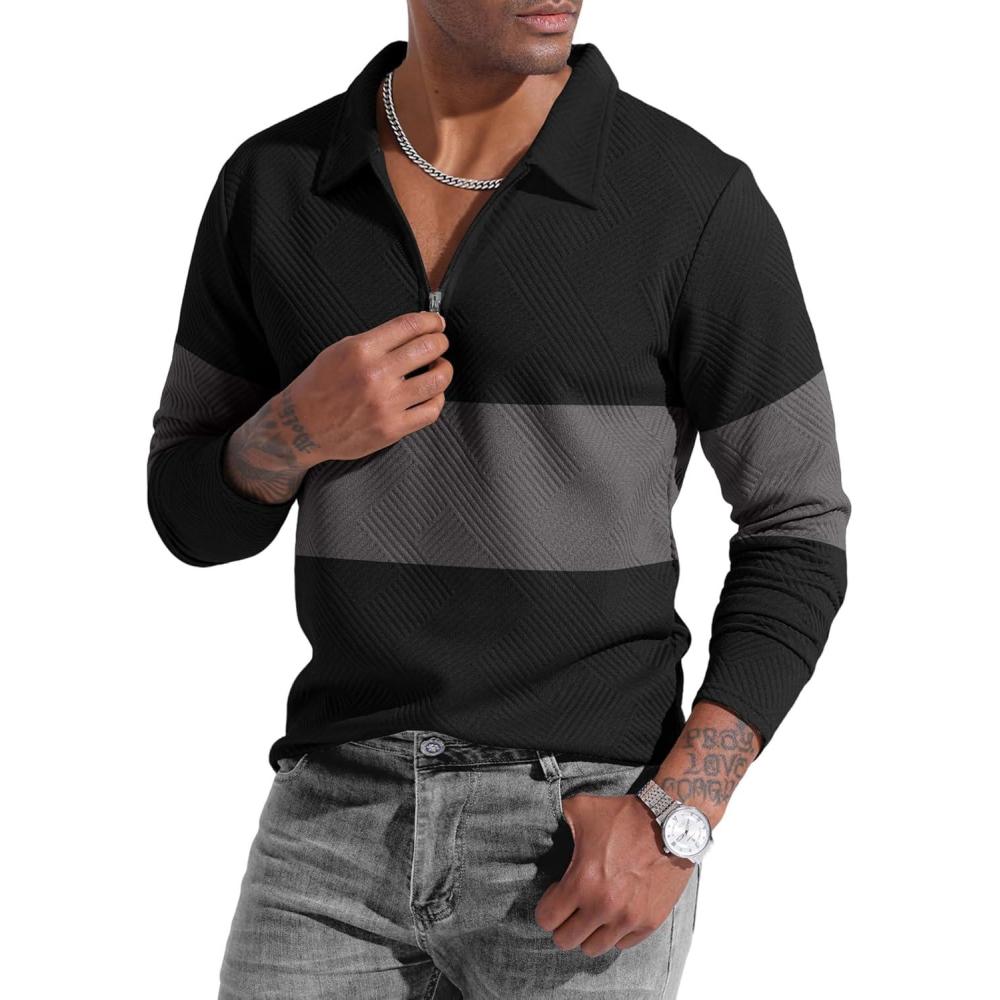 UOUA Men's Polo Shirt Quarter Zip Tops Soild Casual Geometric Texture Long Sleeve Sweaters Pullover Golf Sweatshirts(Black Block)