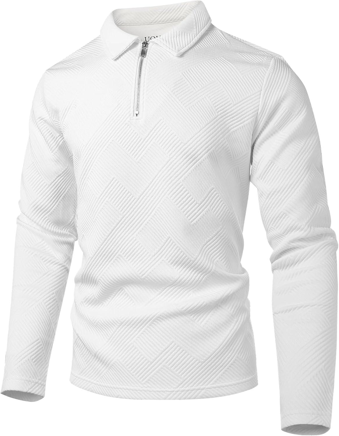 UOUA Men's Polo Shirt Quarter Zip Tops Soild Casual Geometric Texture Long Sleeve Sweaters Pullover Golf Sweatshirts(White)