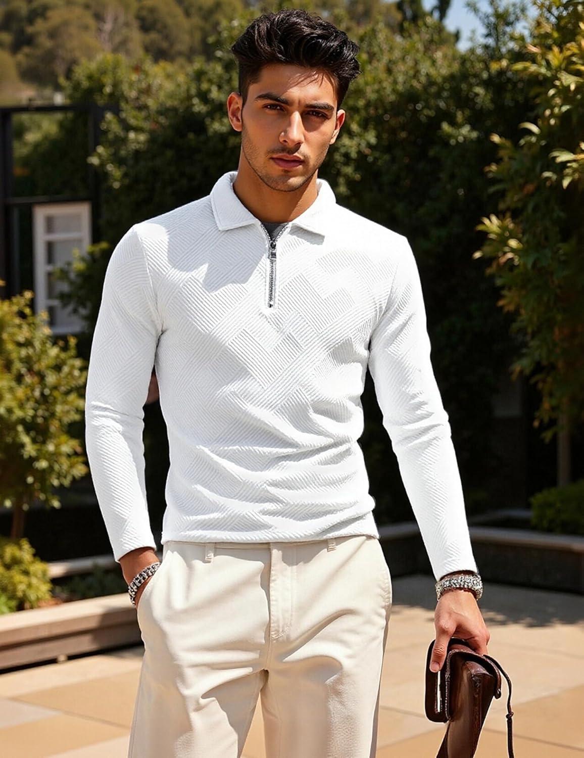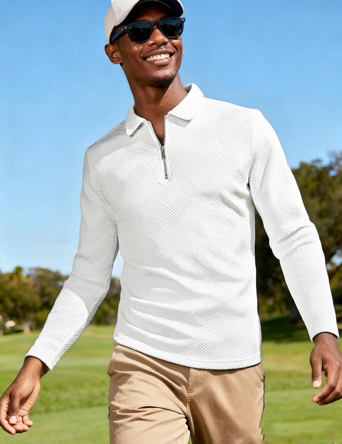 UOUA Men’s Polo Shirt Quarter Zip Tops Soild Casual Geometric Texture Long Sleeve Sweaters Pullover Golf Sweatshirts(White)