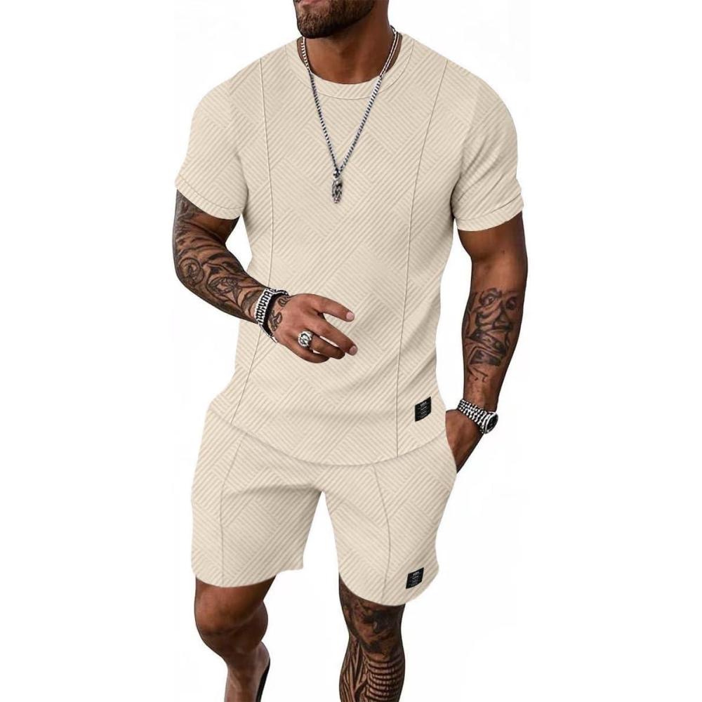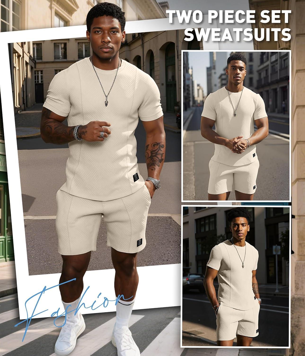 UOUA Mens Short Sets Summer 2 Piece Outfits Casual Short Sleeve Jogging Tracksuits(Beige)