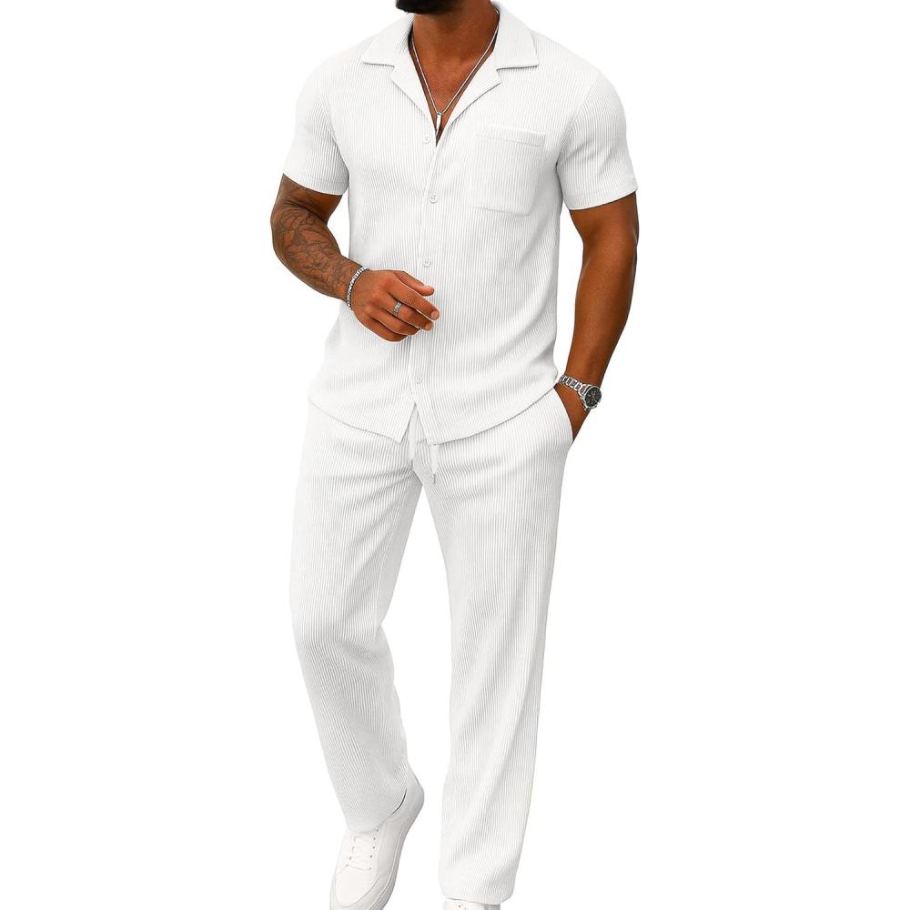 UOUA Mens Summer 2 Piece Set Casual Outfits Button Short Sleeve Shirt & Loose Pants Textured Striped Tracksuit Walking Suits(Classicwhite)