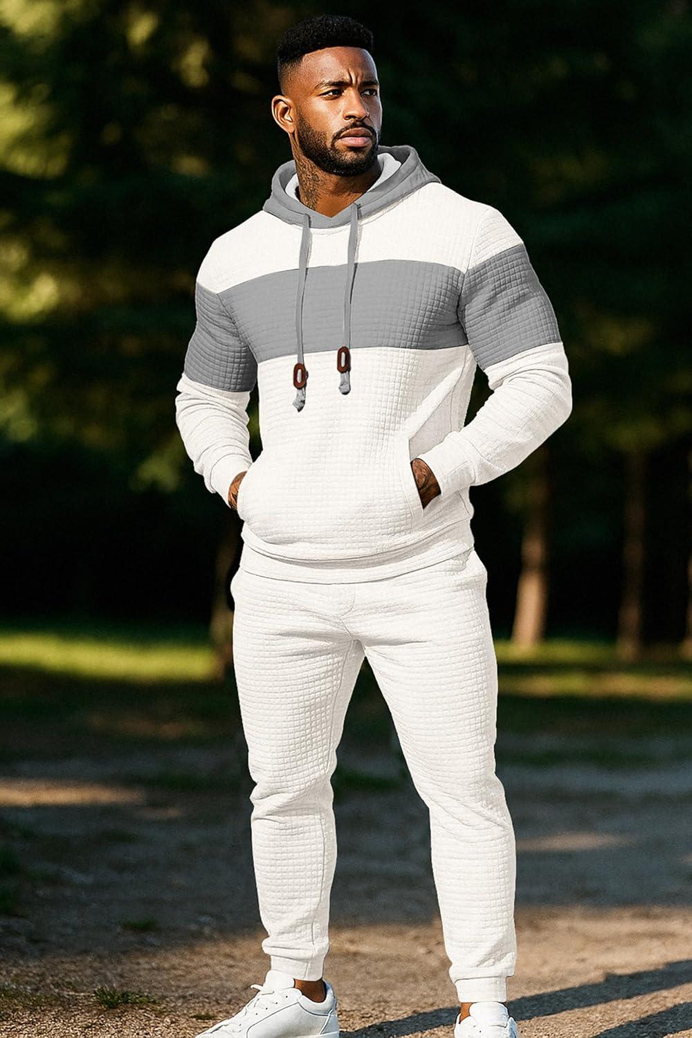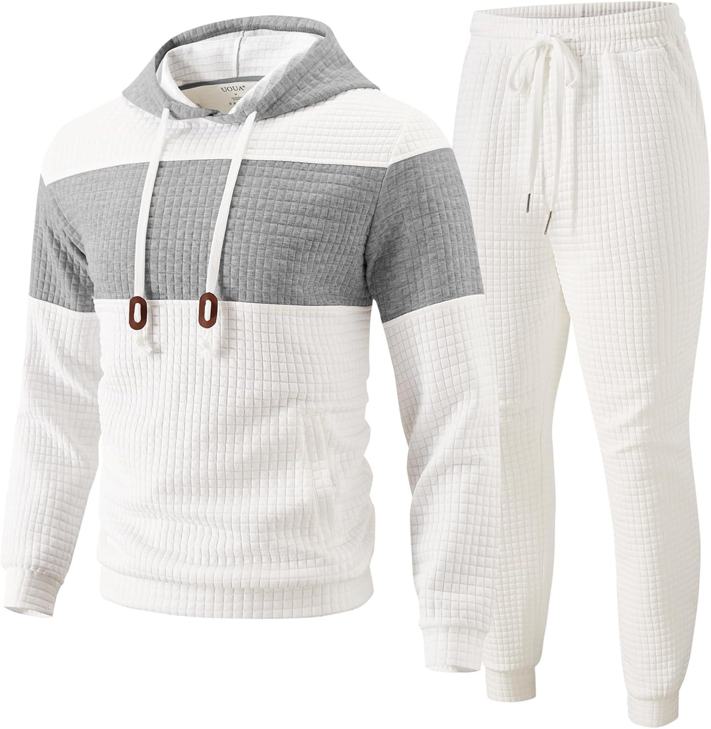 UOUA Mens Tracksuit 2 Piece Hoodie Sweatsuit Sets Casual Athletic Jogging Suits Waffle Jacquard Outfits(White)
