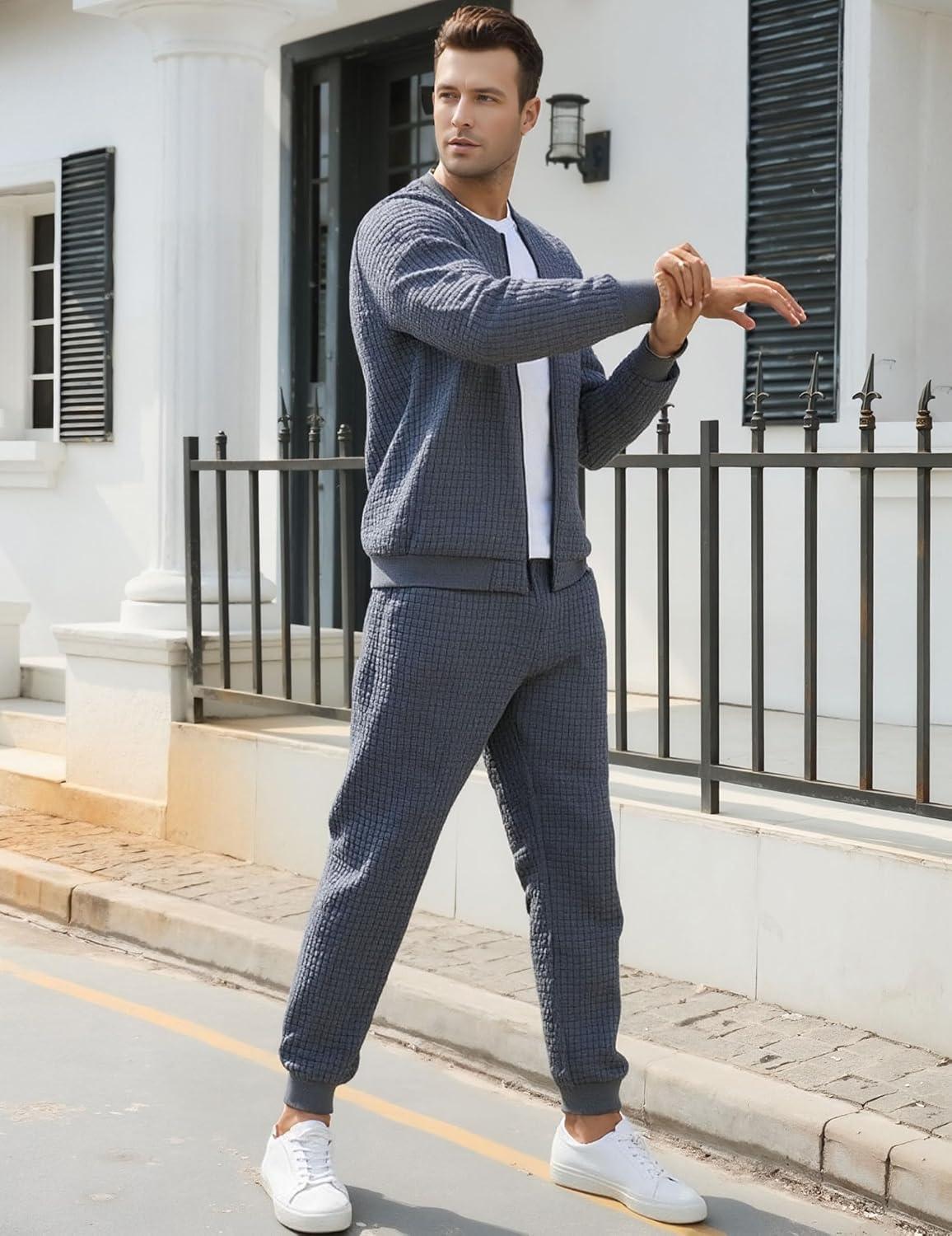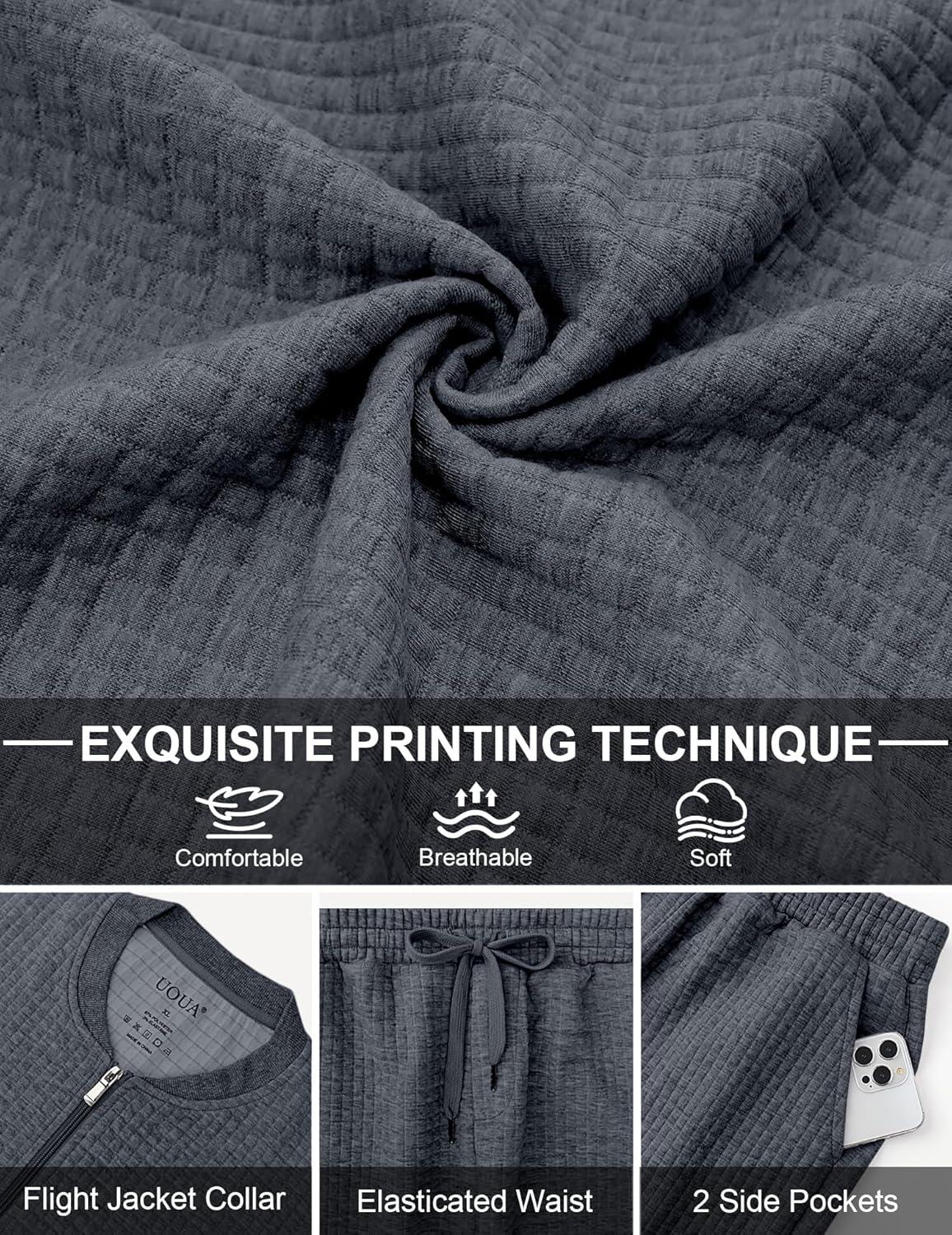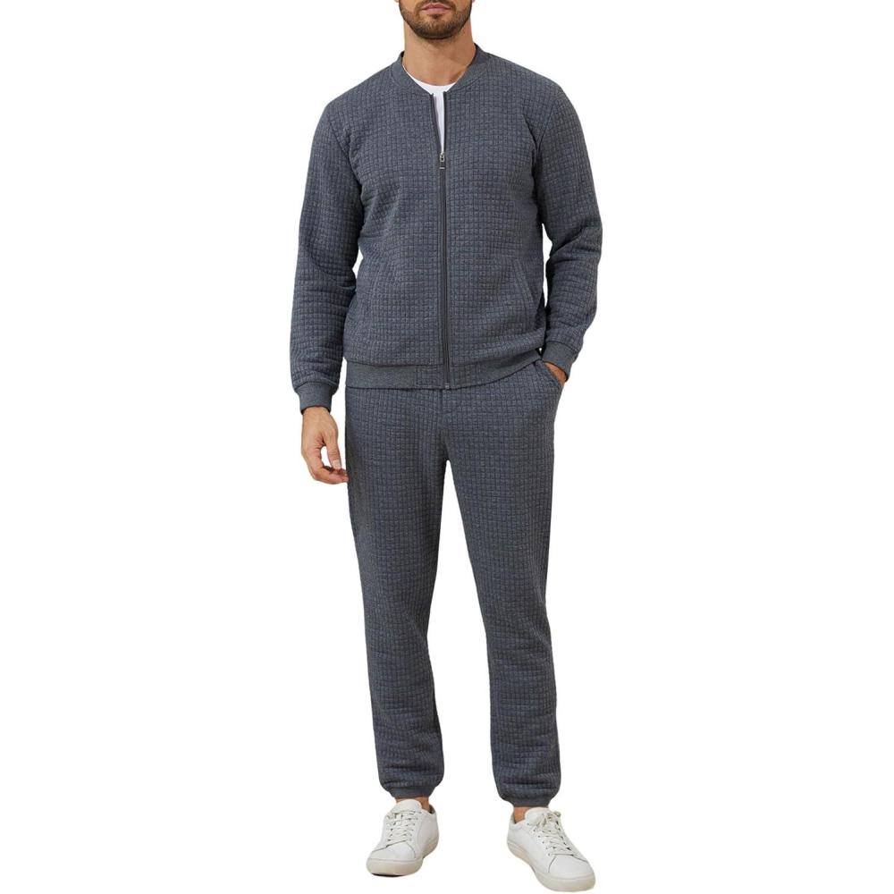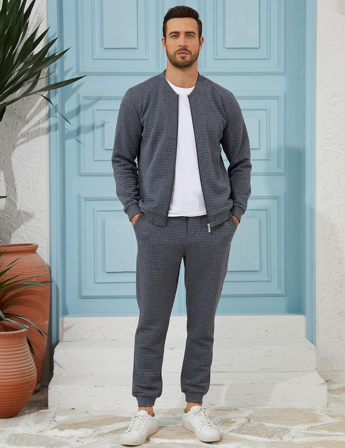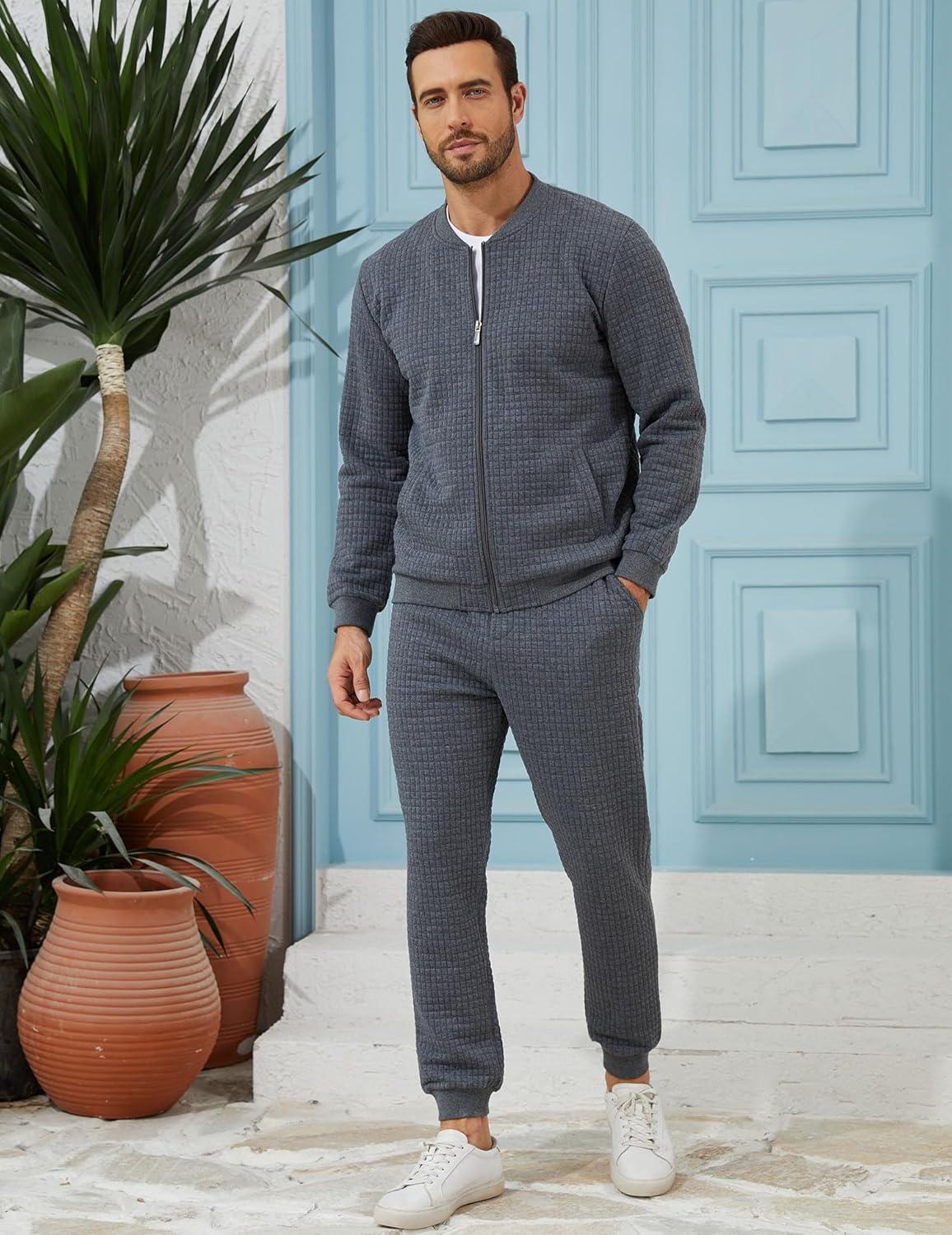 UOUA Men's Tracksuit 2 Piece Sets Casual Sweatsuit with Full Zip Athletic Jogging Suits Waffle Plaid Jacquard Outfits(Darkgrey)