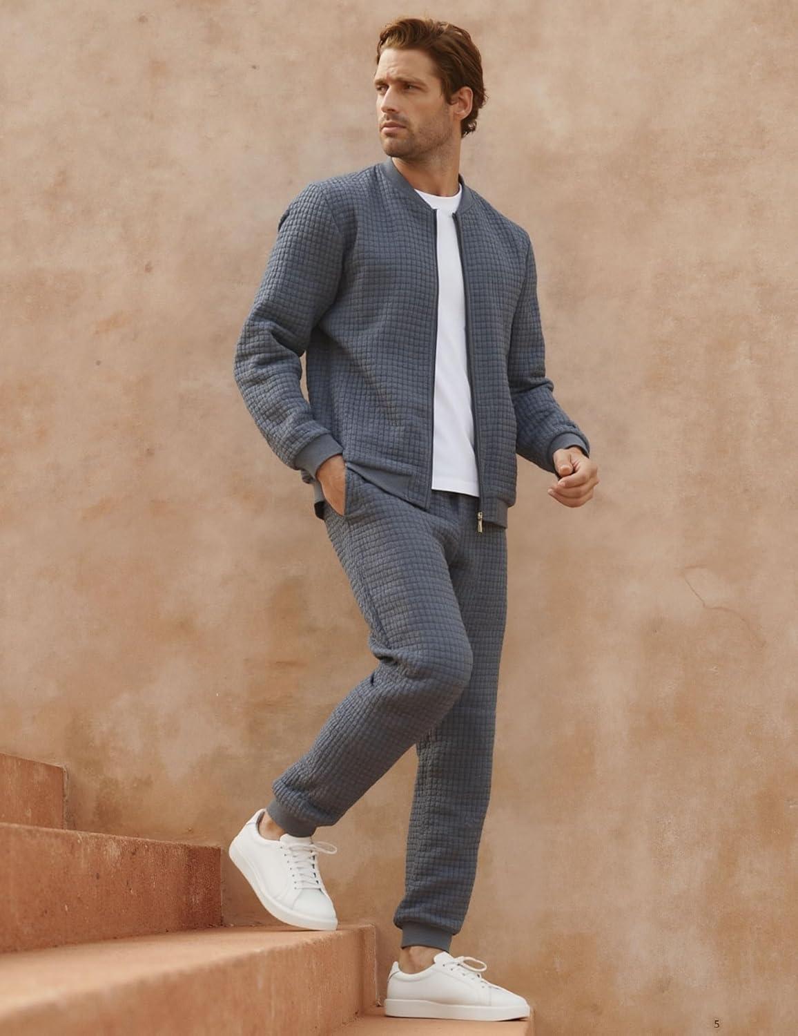 UOUA Men’s Tracksuit 2 Piece Sets Casual Sweatsuit with Full Zip Athletic Jogging Suits Waffle Plaid Jacquard Outfits(Lightgrey)