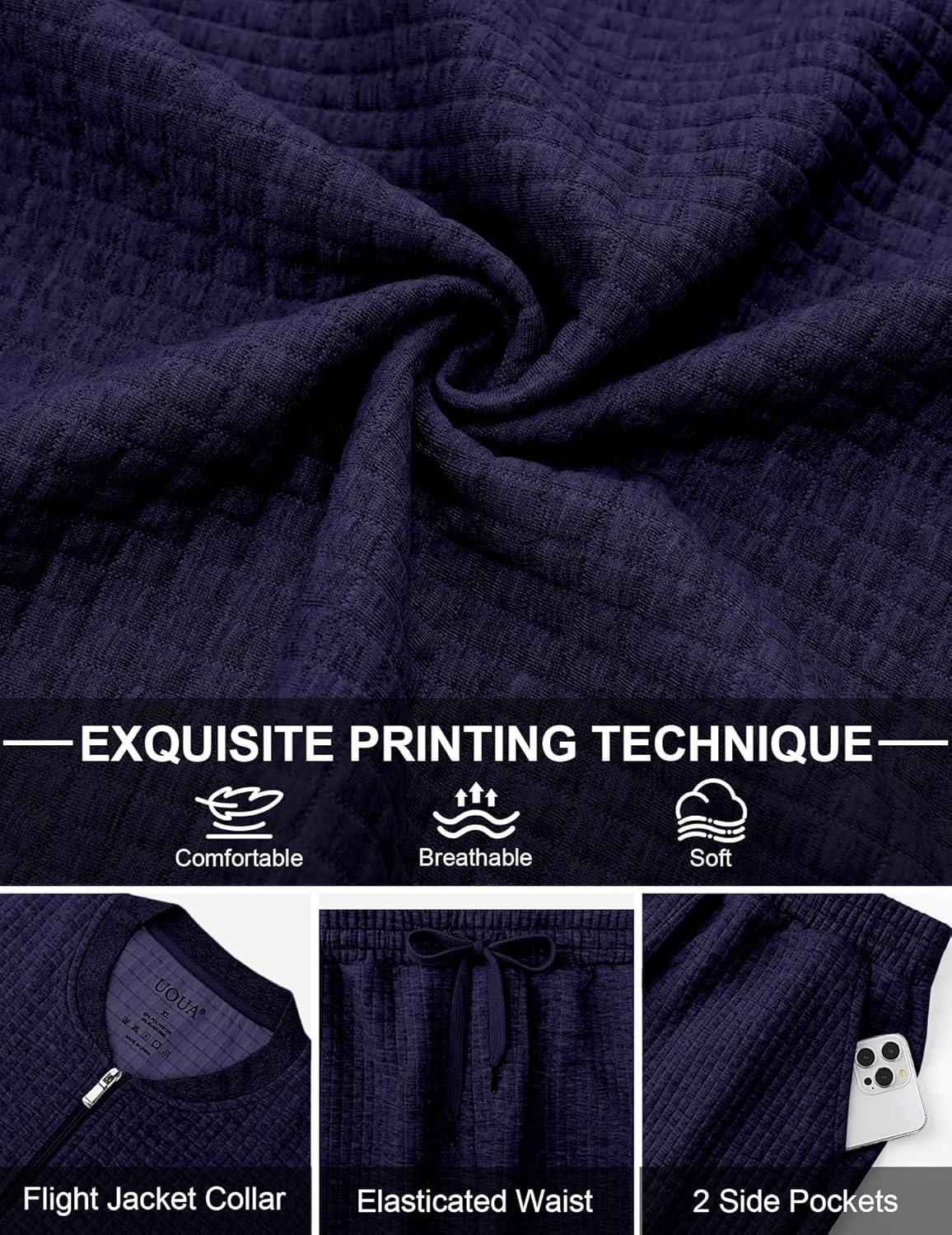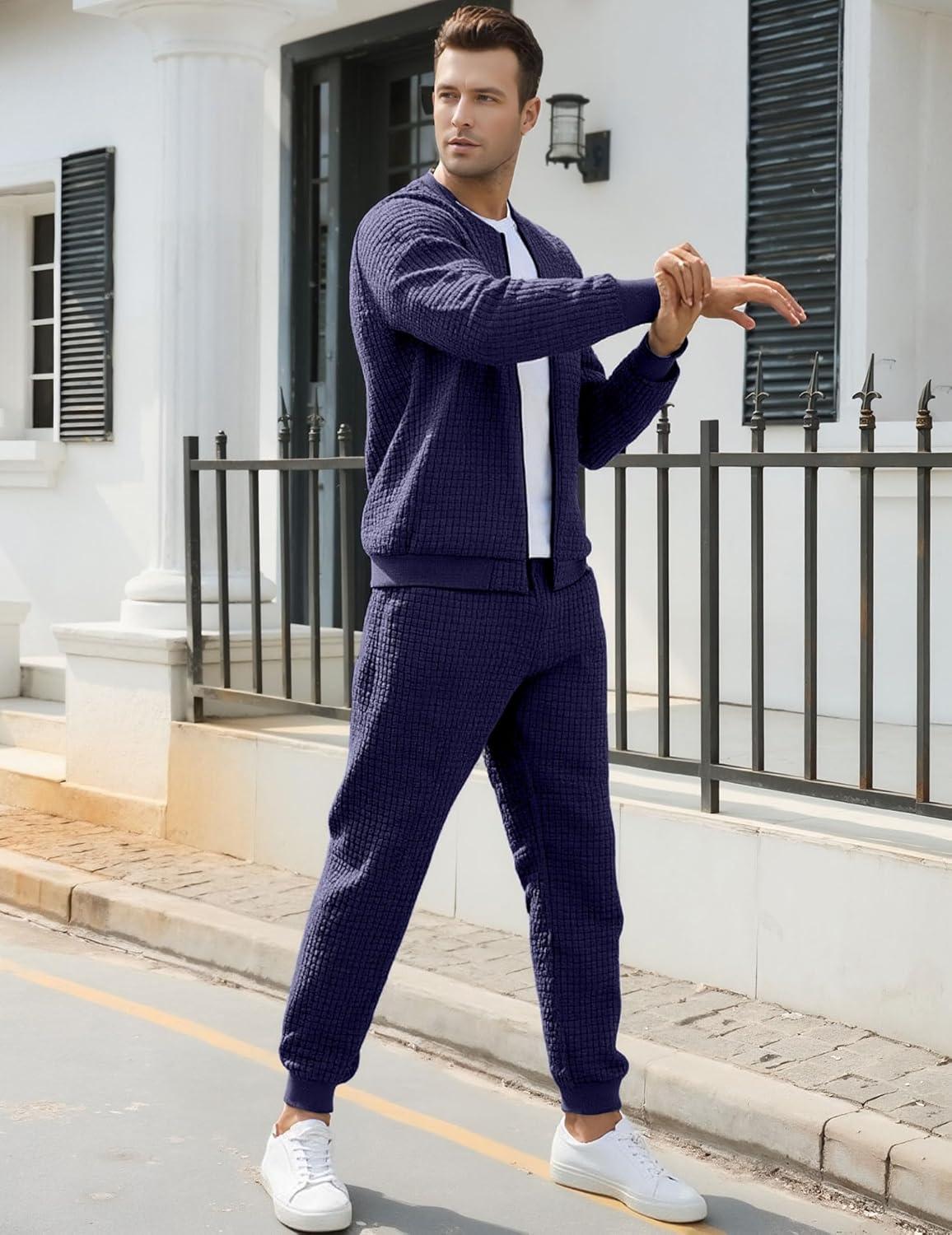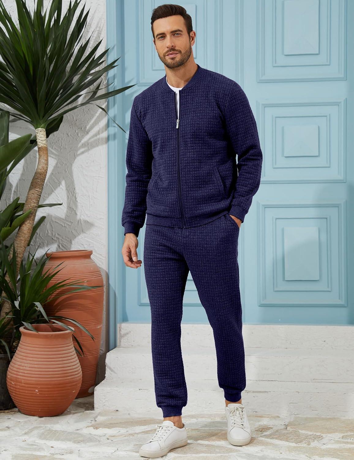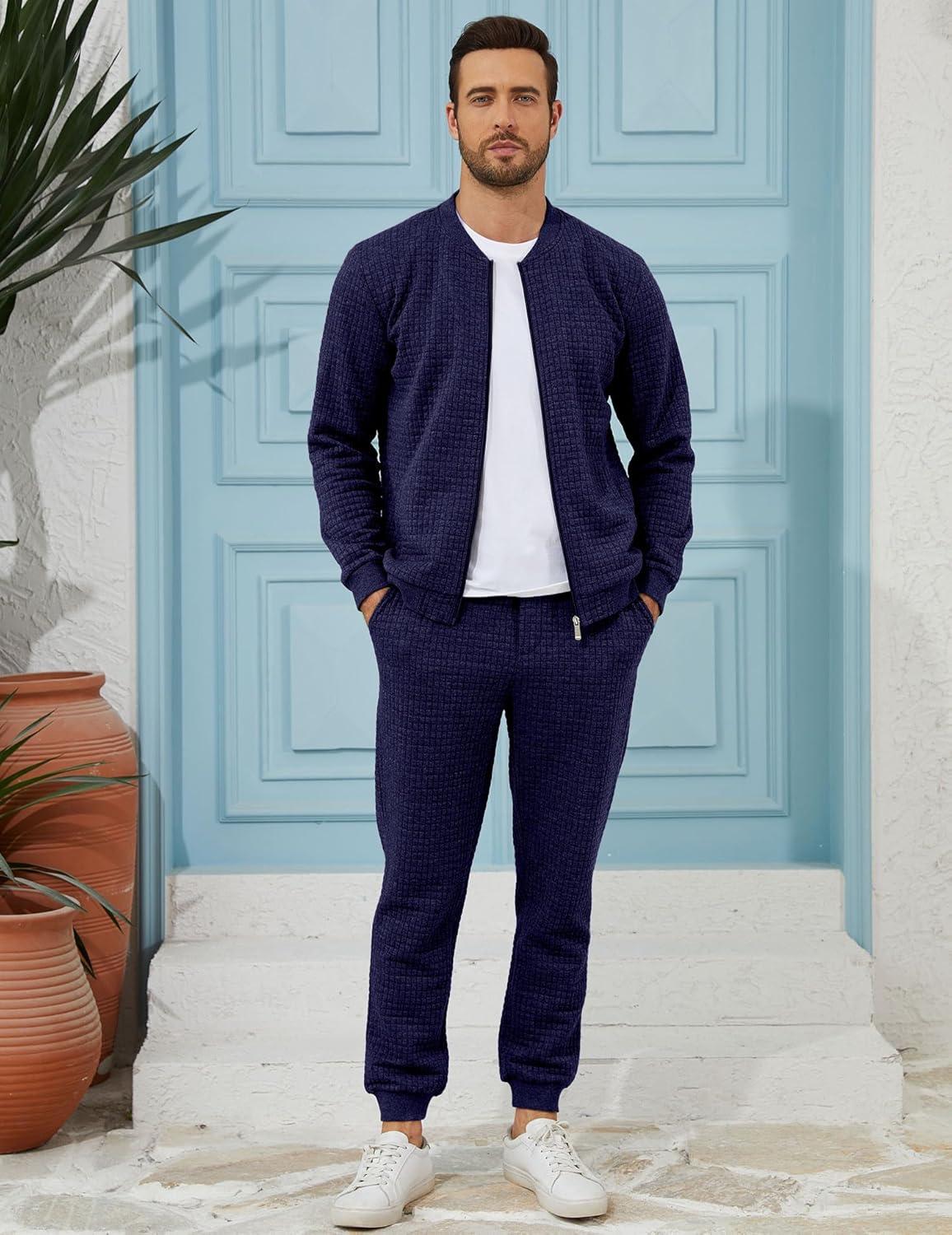 UOUA Men’s Tracksuit 2 Piece Sets Casual Sweatsuit with Full Zip Athletic Jogging Suits Waffle Plaid Jacquard Outfits(Navy)