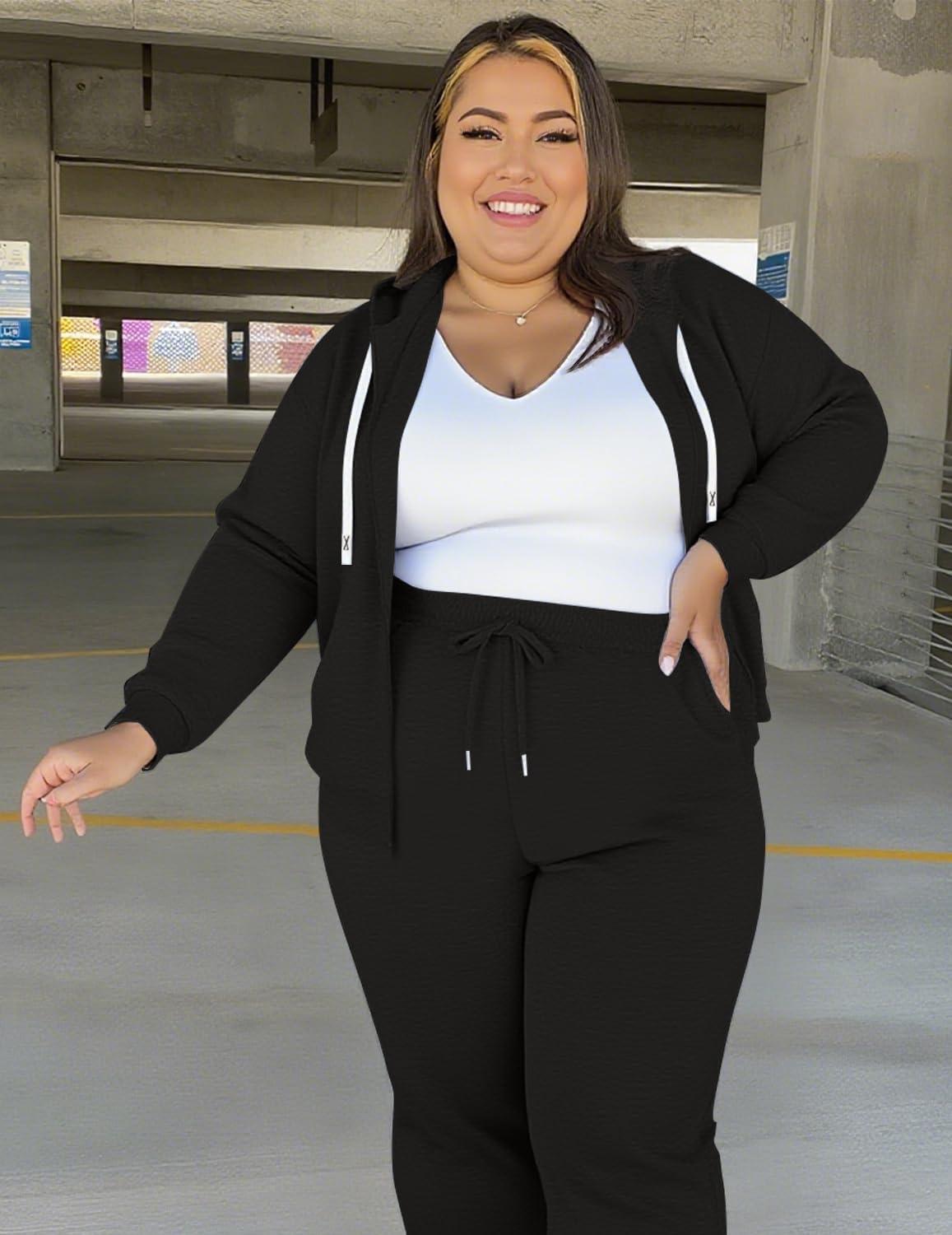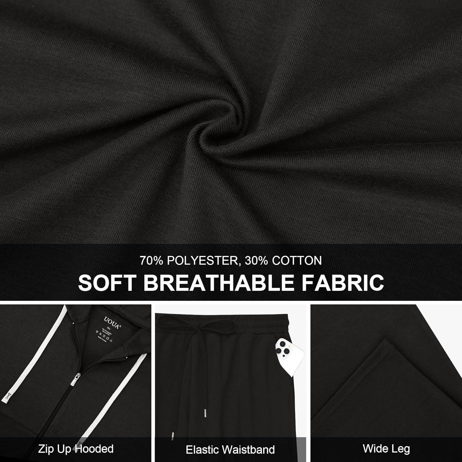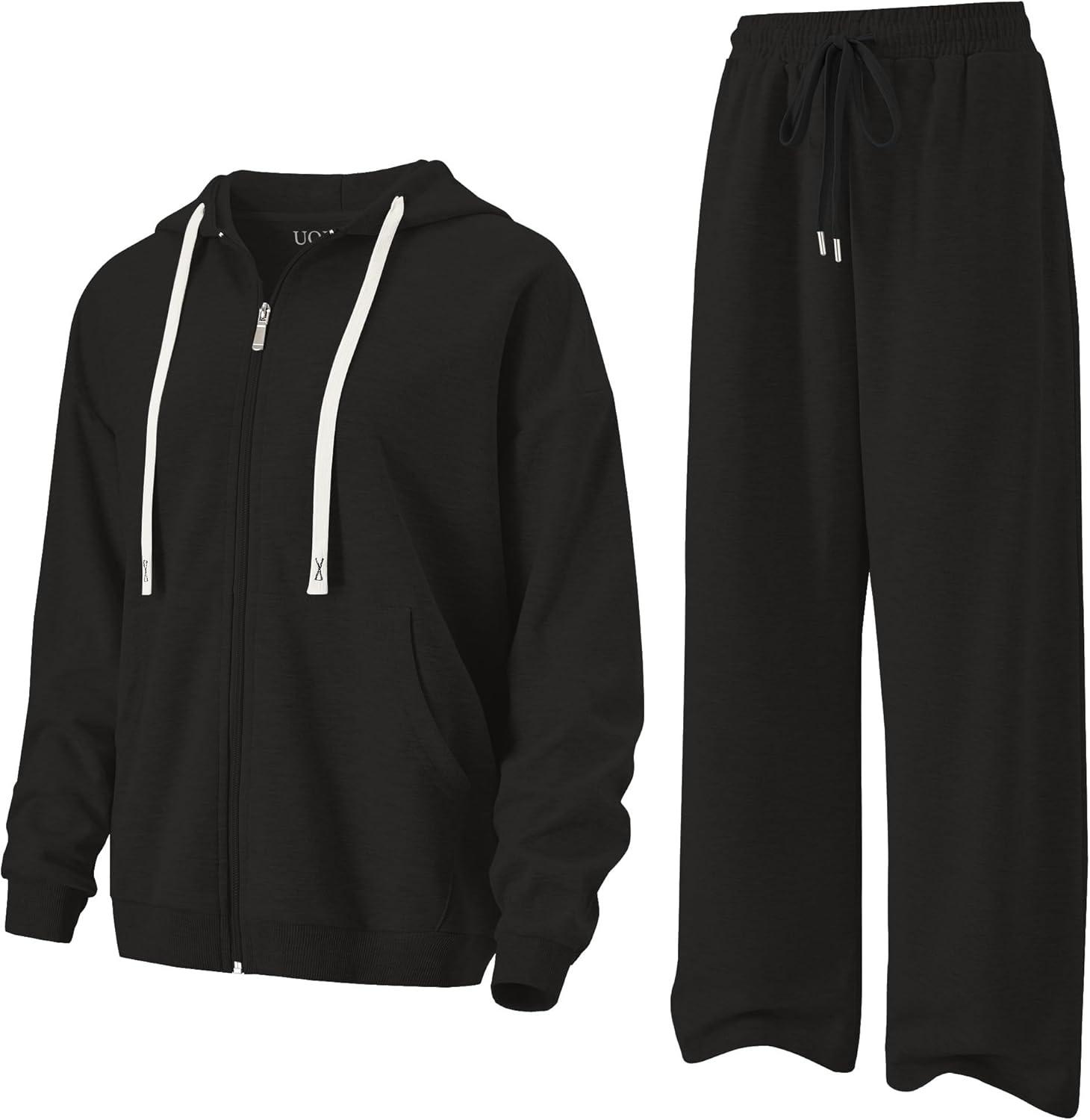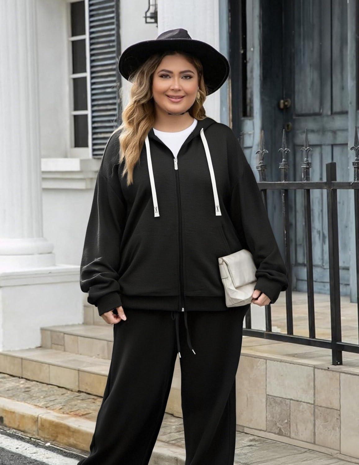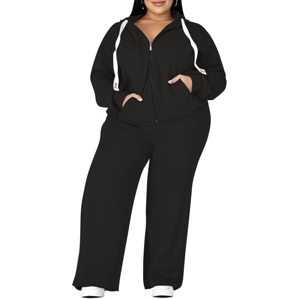 UOUA Plus Size Womens 2 Piece Sweatsuits Outfits Zip Up Jackets & Wide Leg Sweatpants Casual Loungewear Tracksuit Sets(Black)