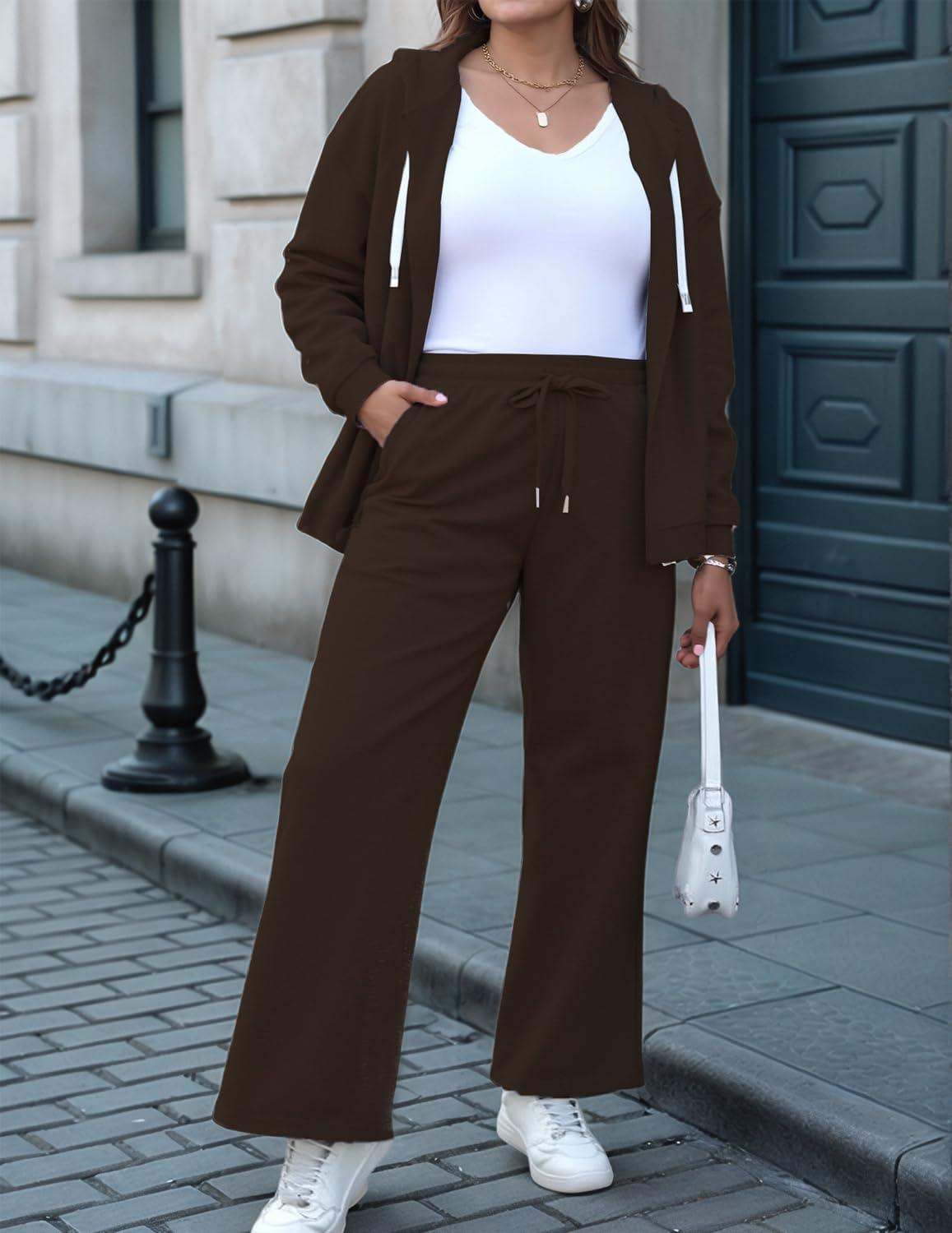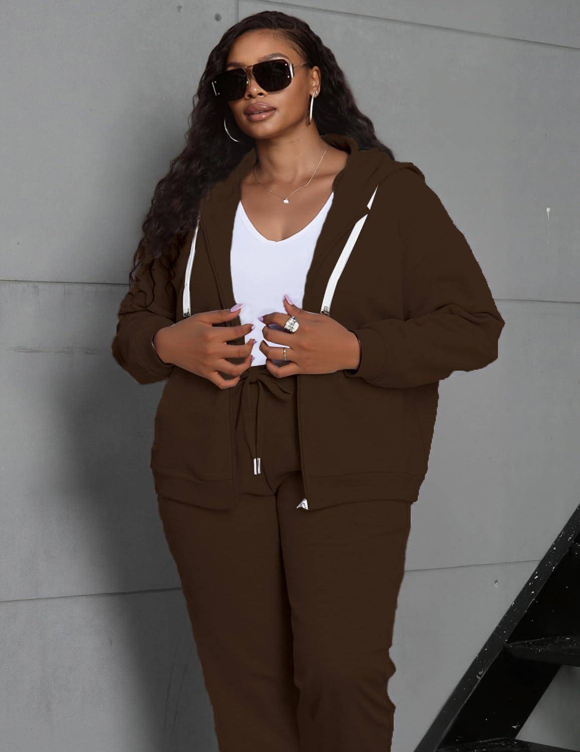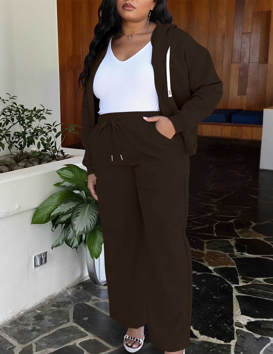 UOUA Plus Size Womens 2 Piece Sweatsuits Outfits Zip Up Jackets & Wide Leg Sweatpants Casual Loungewear Tracksuit Sets(Brown)