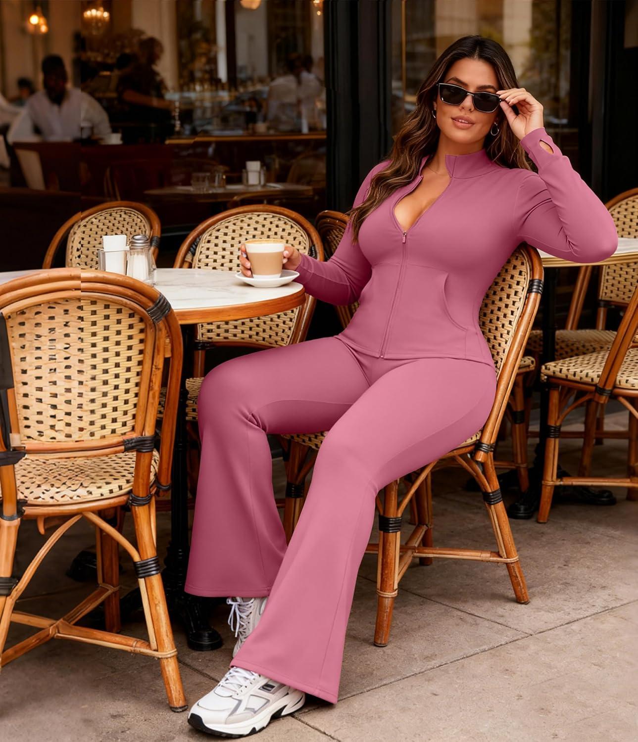 UOUA Women’s 2 Piece Set Long Sleeve Jacket & Ankle Length Workout Flare Leggings Casual Matching Outfit Tracksuit Sweatsuit(Pink)