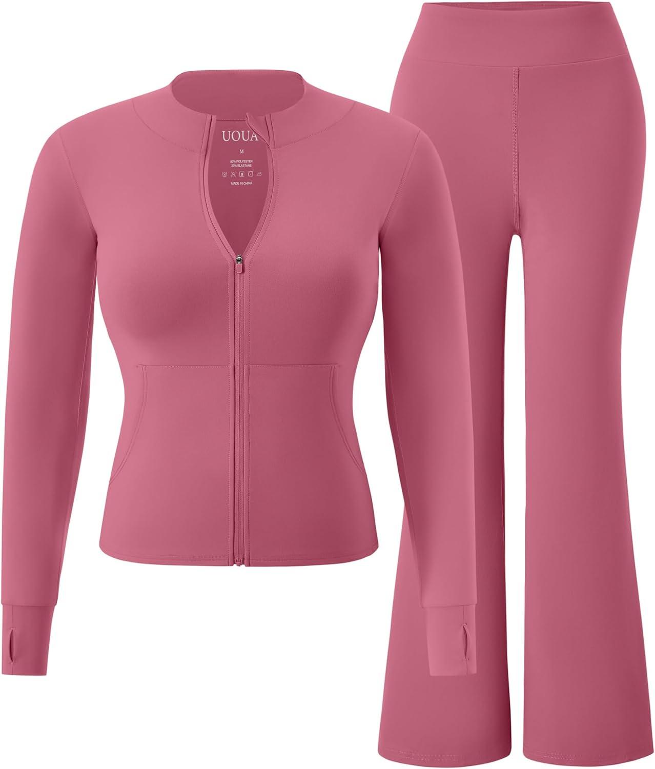 UOUA Women's 2 Piece Set Long Sleeve Jacket & Ankle Length Workout Flare Leggings Casual Matching Outfit Tracksuit Sweatsuit(Pink)