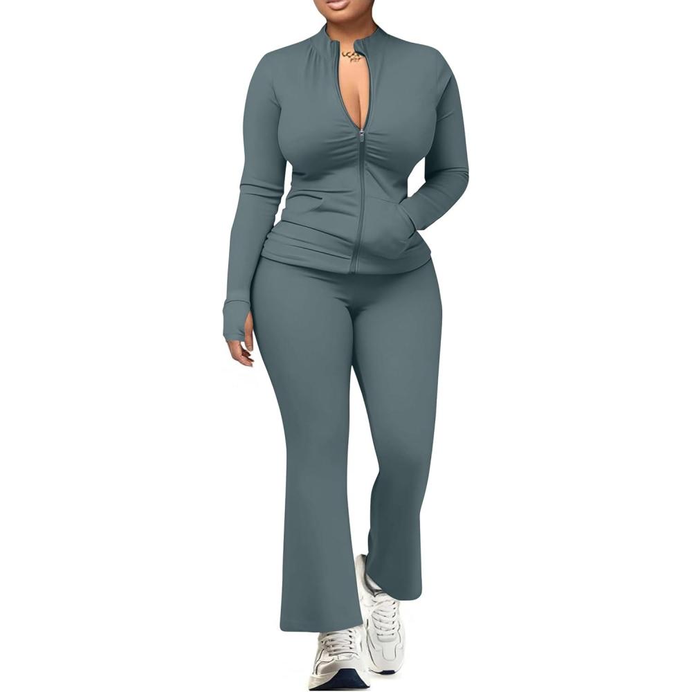 UOUA Women’s 2 Piece Set Long Sleeve Zip Jacket & Wide Leg Flare Pants Casual Matching Outfit Tracksuit Sweatsuit(Greyblue)