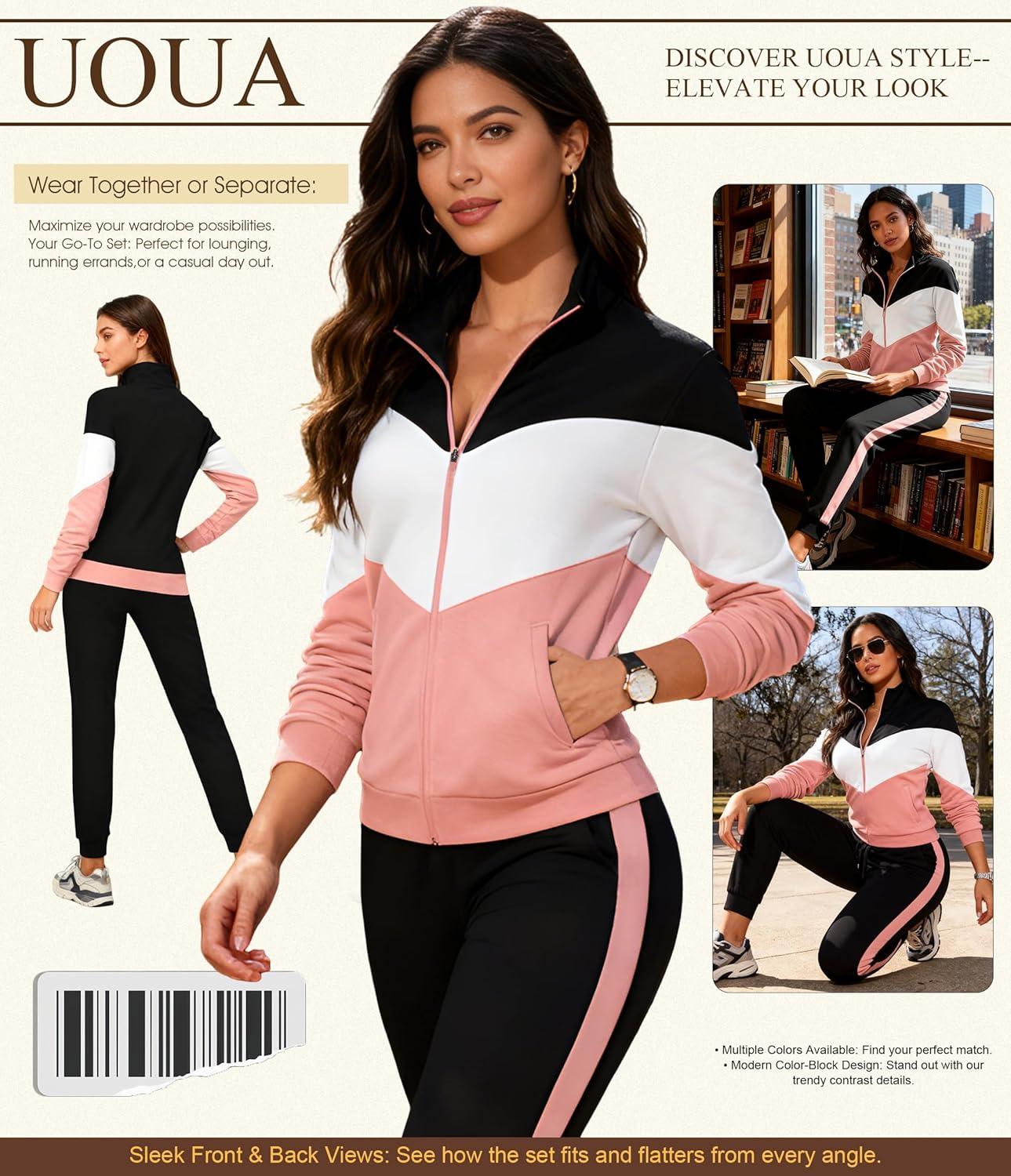 UOUA Women’s 2 Piece Set Tracksuit Long Sleeve Zip Jacket & Jogger Pants Workout Lounge Casual Outfit Sweatsuits(Pink)