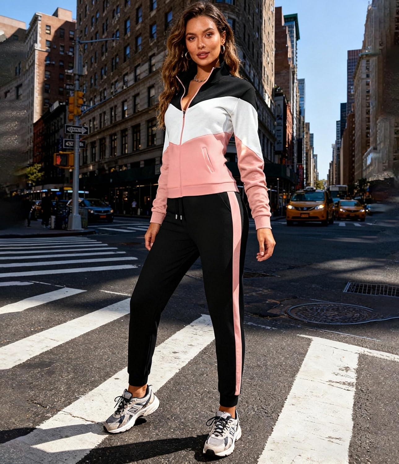 UOUA Women's 2 Piece Set Tracksuit Long Sleeve Zip Jacket & Jogger Pants Workout Lounge Casual Outfit Sweatsuits(Pink)