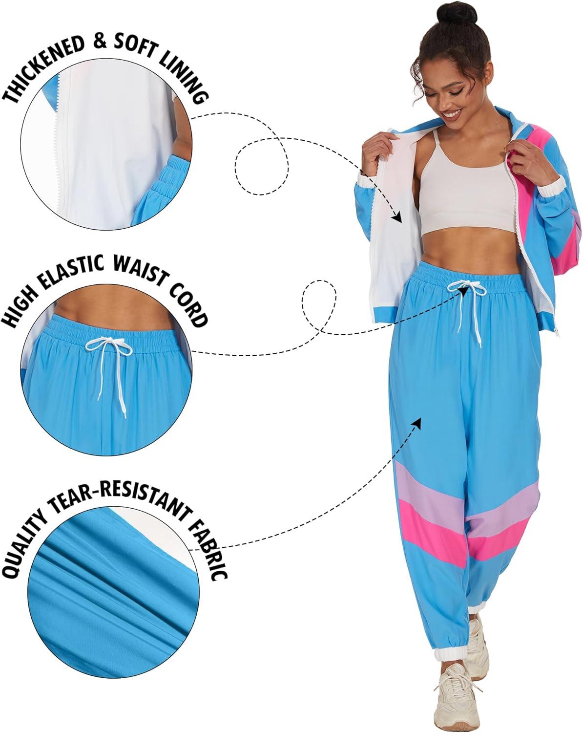 UOUA Women's Color Block 2 Piece 80s 90s Outfits Long Sleeve Windbreaker Jacket Tracksuit Set(80sprint)