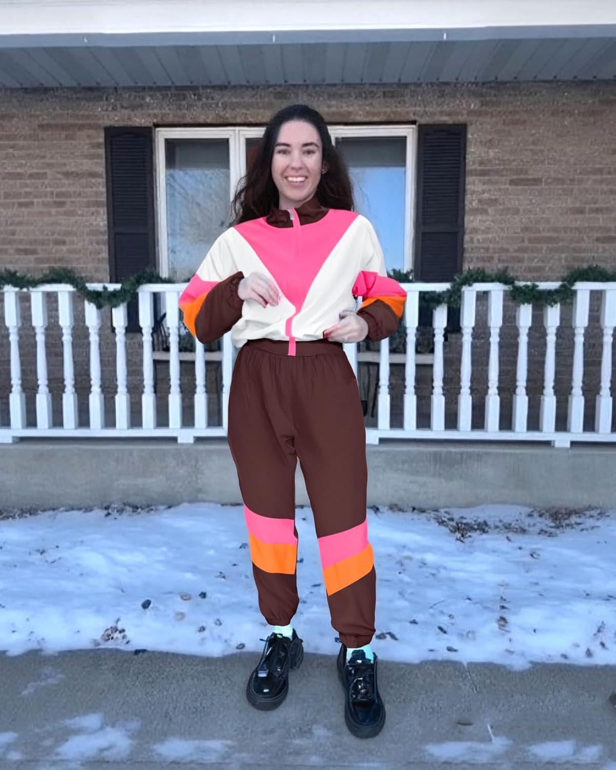 UOUA Women’s Color Block 2 Piece 80s 90s Outfits Long Sleeve Windbreaker Jacket Tracksuit Set(Brown White)