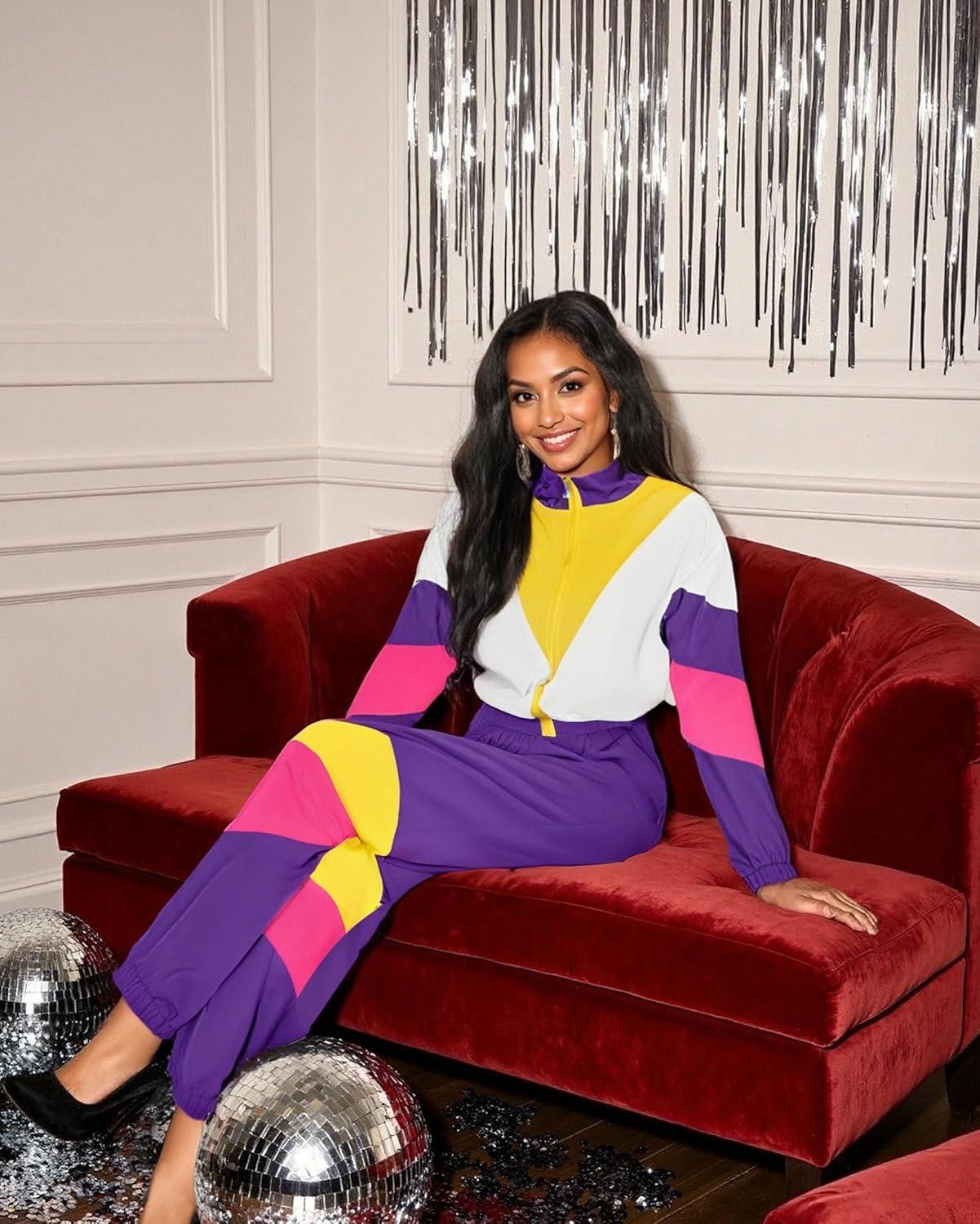 imageUOUA Womens Color Block 2 Piece 80s 90s Outfits Long Sleeve Windbreaker Jacket Tracksuit SetPurple White