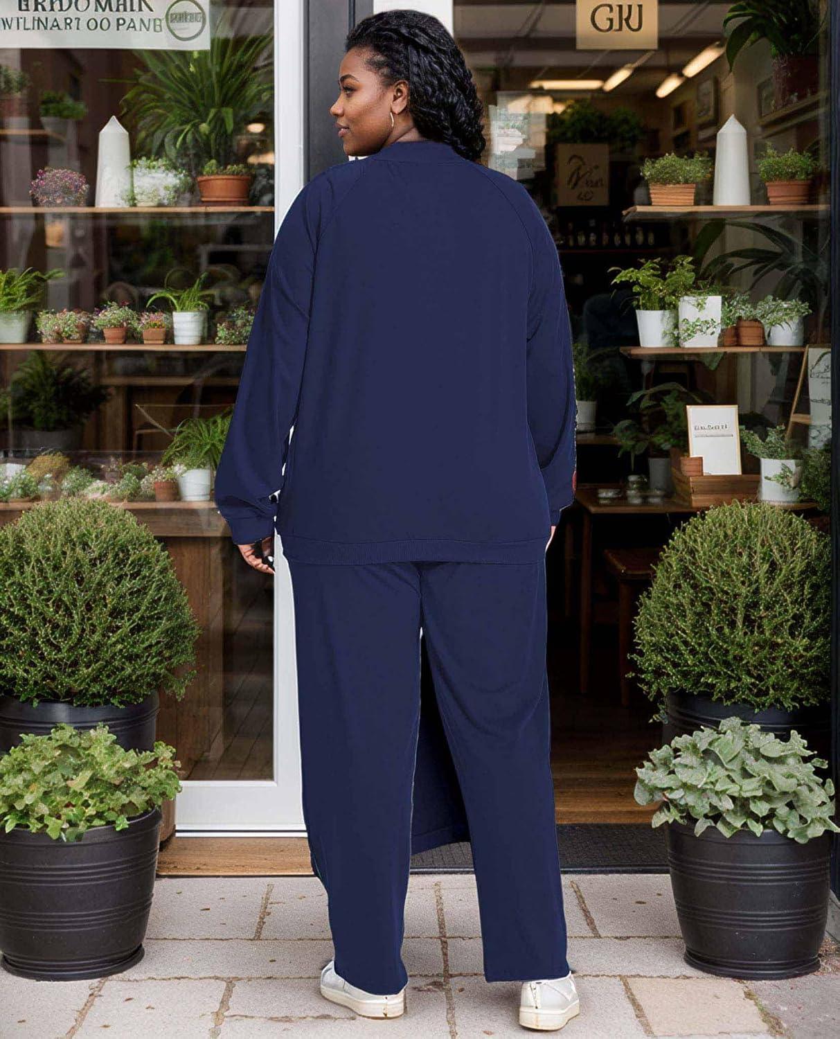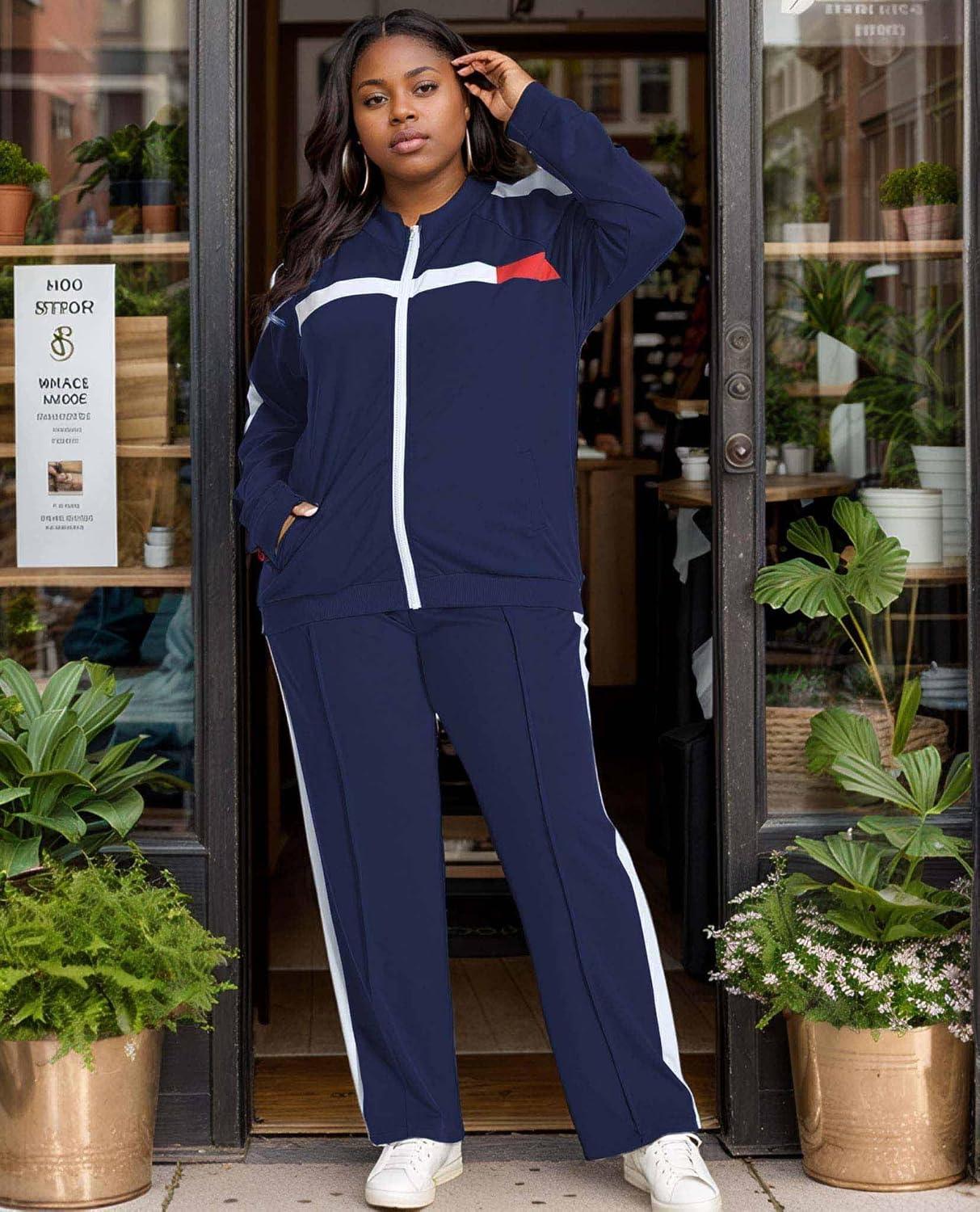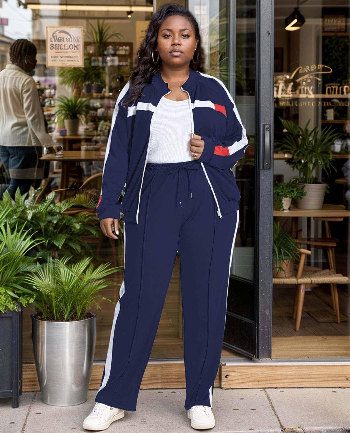 UOUA Women's Plus Size Jogging Suit 2 Piece Sweatsuit Long Sleeve Jacket & Pants Two Piece Track Set Outfit(Patchwork Navy)