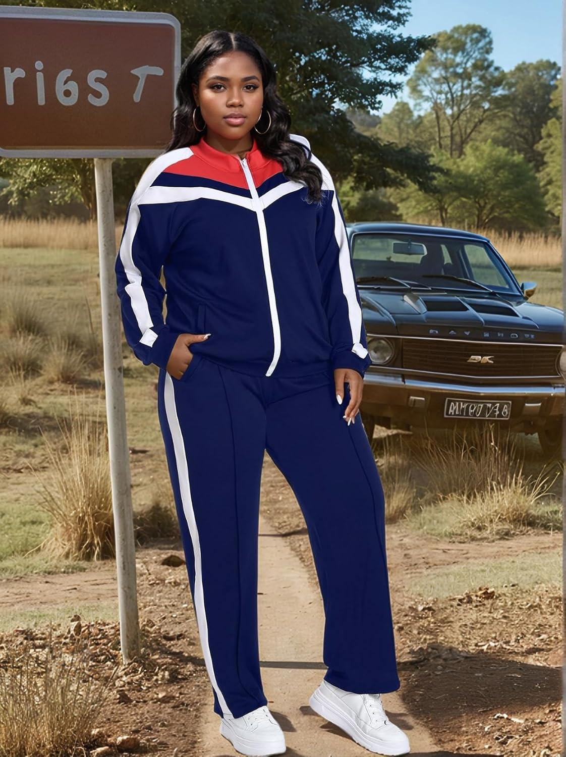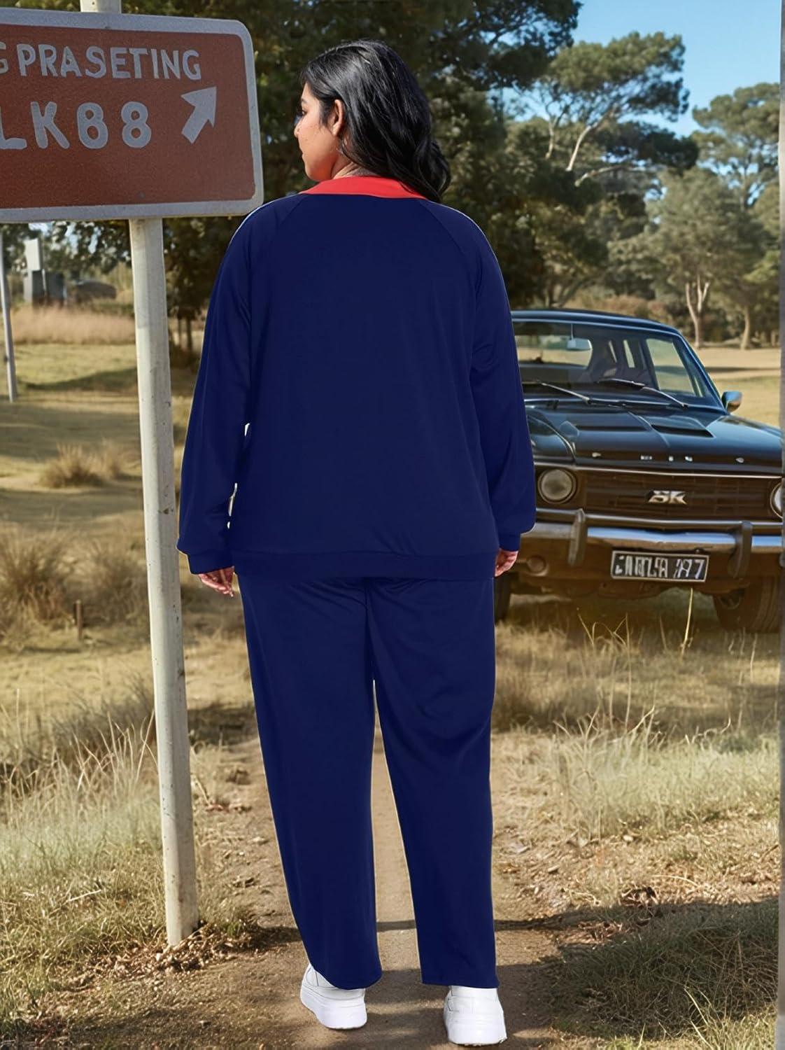 UOUA Women's Plus Size Jogging Suit 2 Piece Sweatsuit Long Sleeve Jacket & Pants Two Piece Track Set Outfit(Retro Navy)