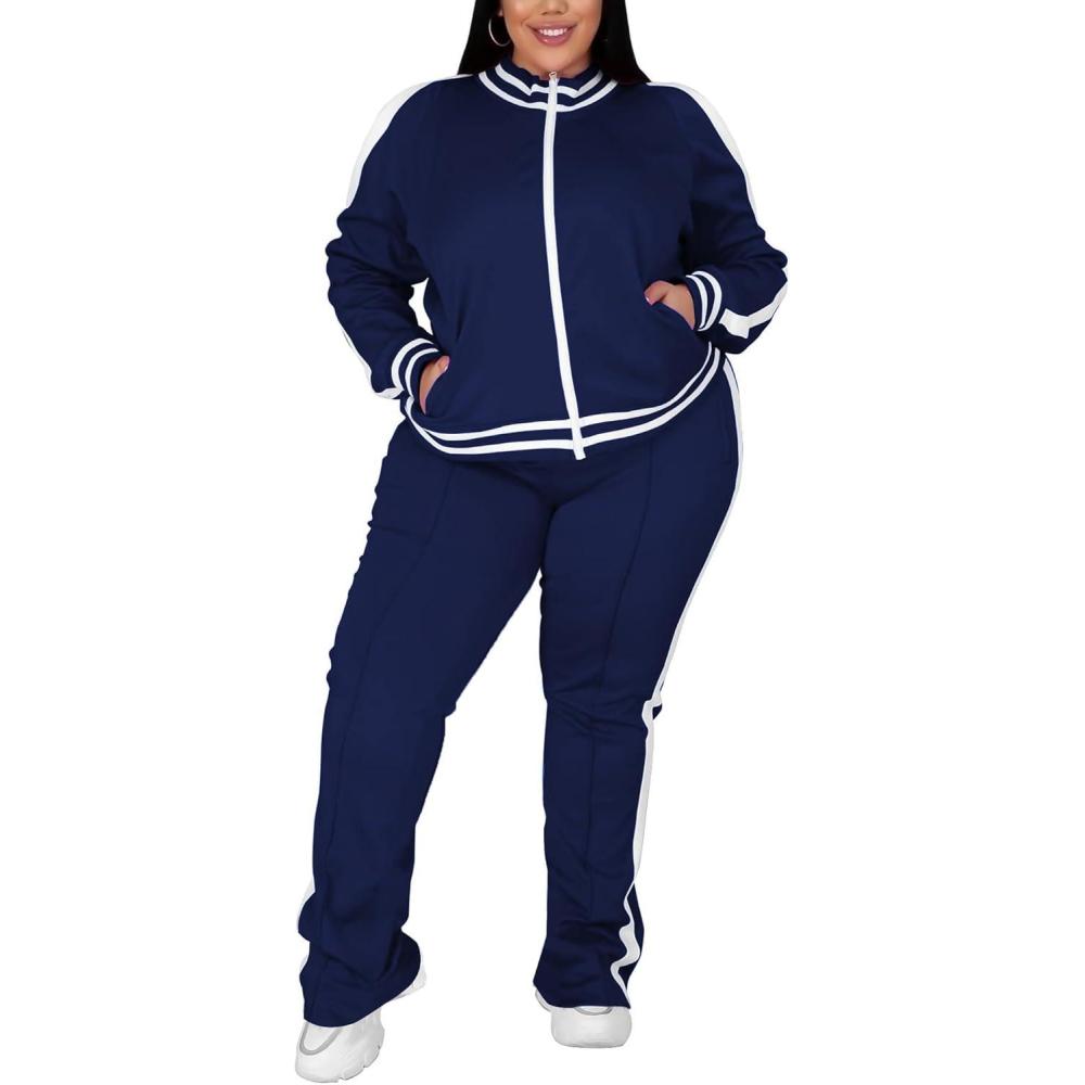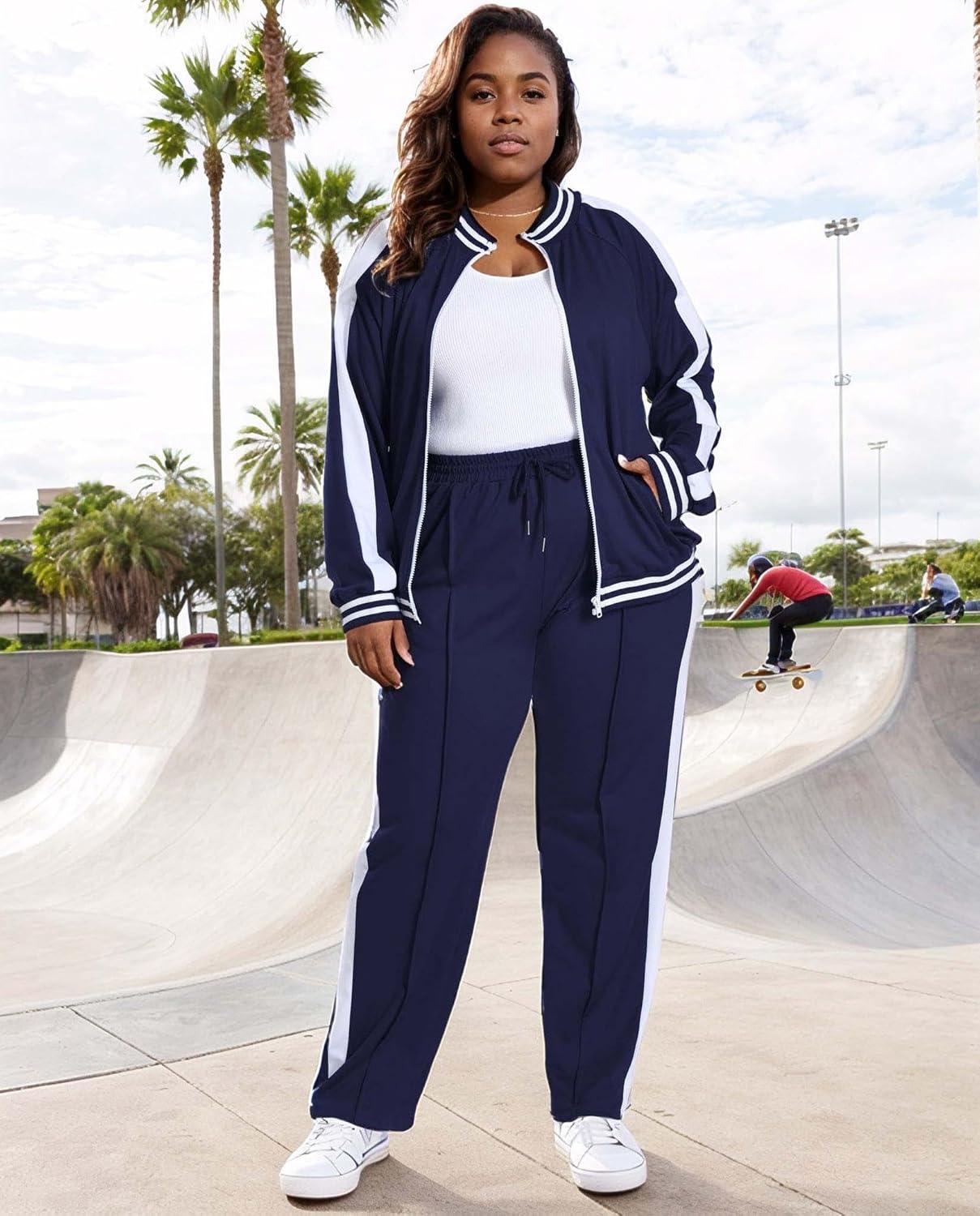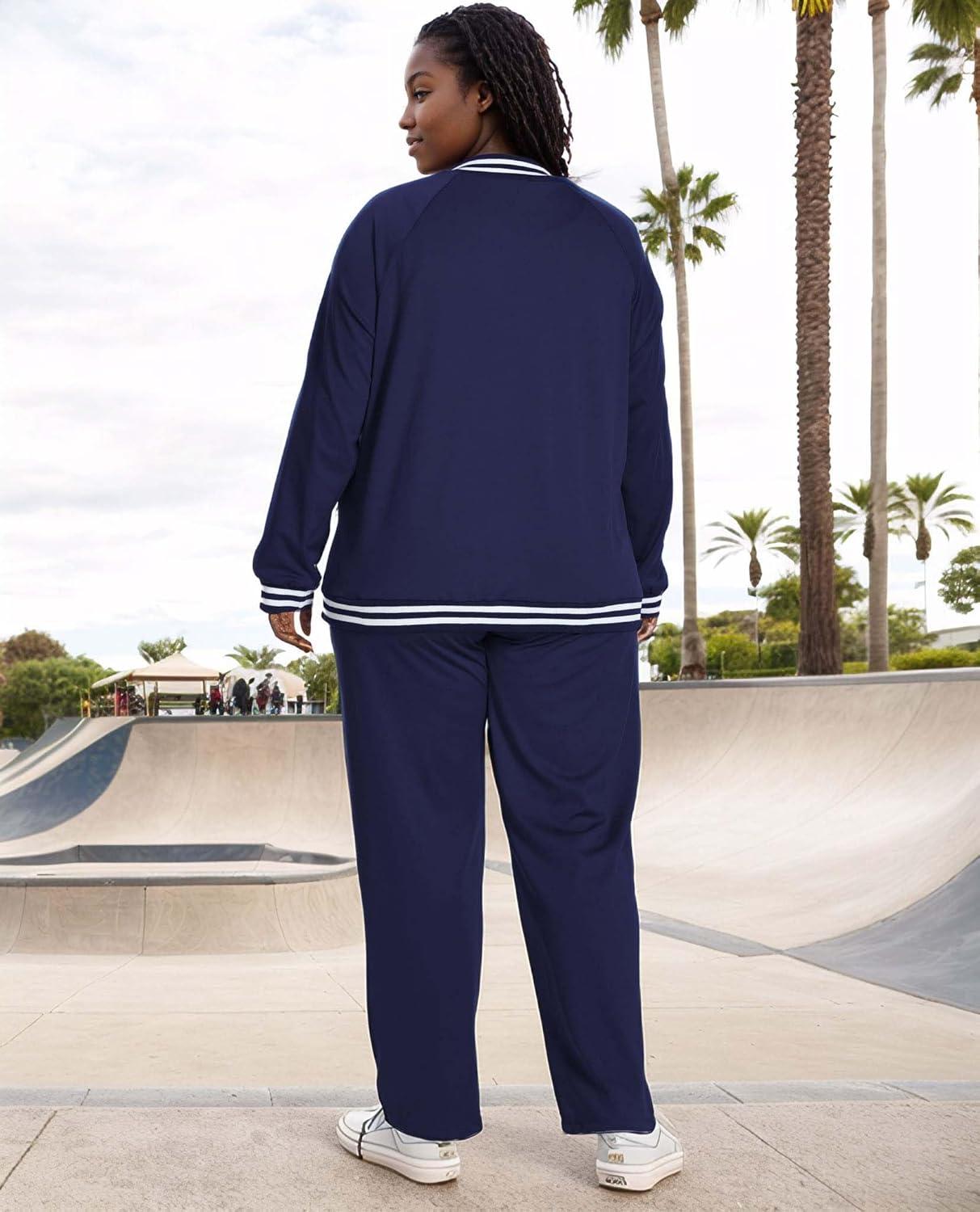 UOUA Women's Plus Size Jogging Suit 2 Piece Sweatsuit Long Sleeve Jacket & Pants Two Piece Track Set Outfit(Stripe Navy)