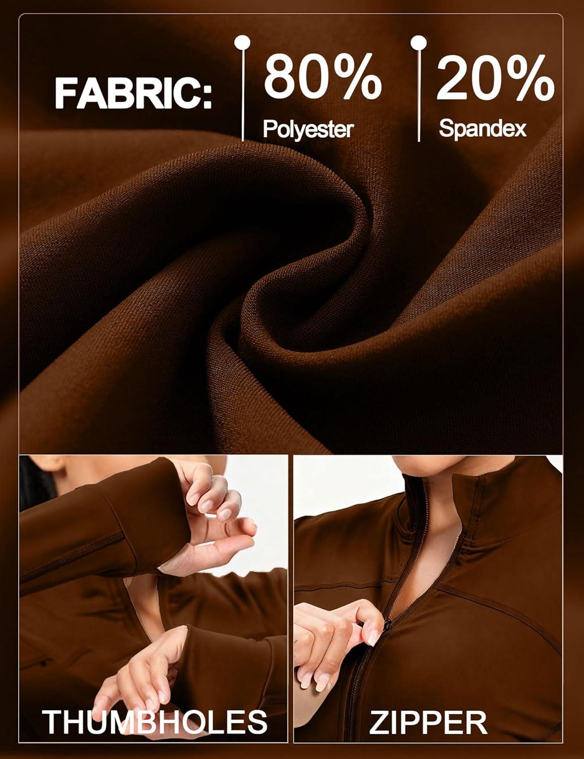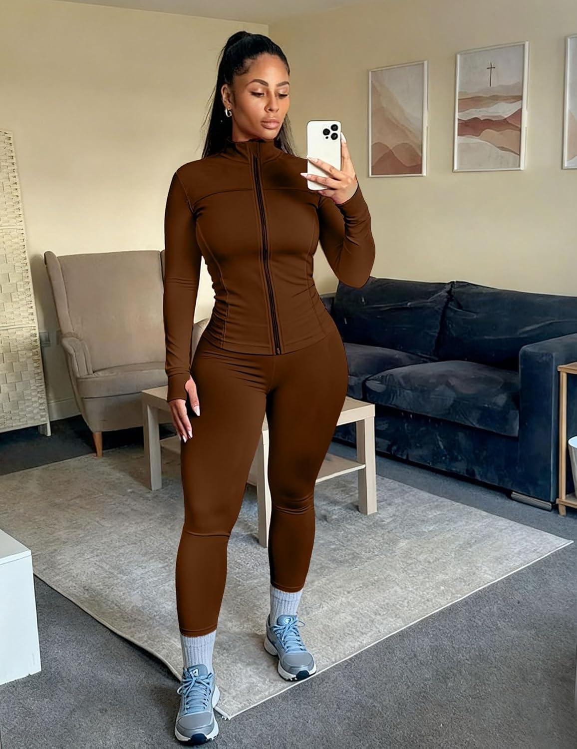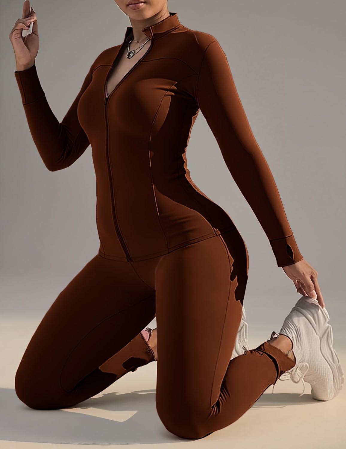UOUA Womens Workout Set Two Piece Outfits Bodycon Long Sleeve Zipper Jacket & Leggings for Gym Tracksuit(Brown)