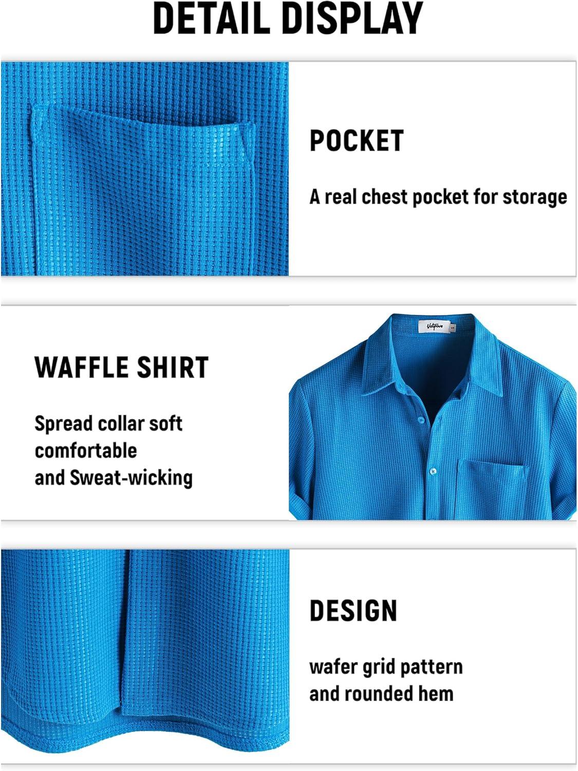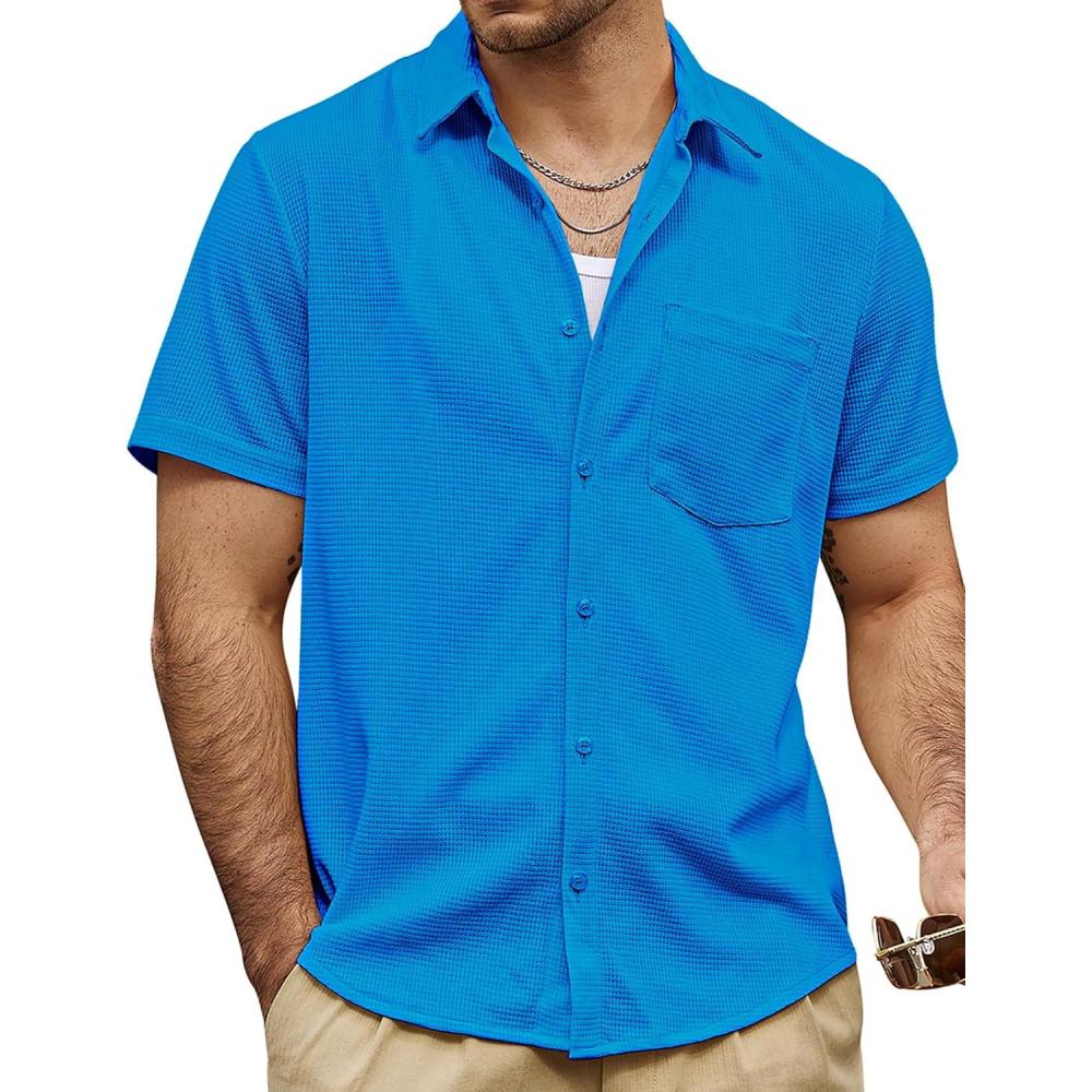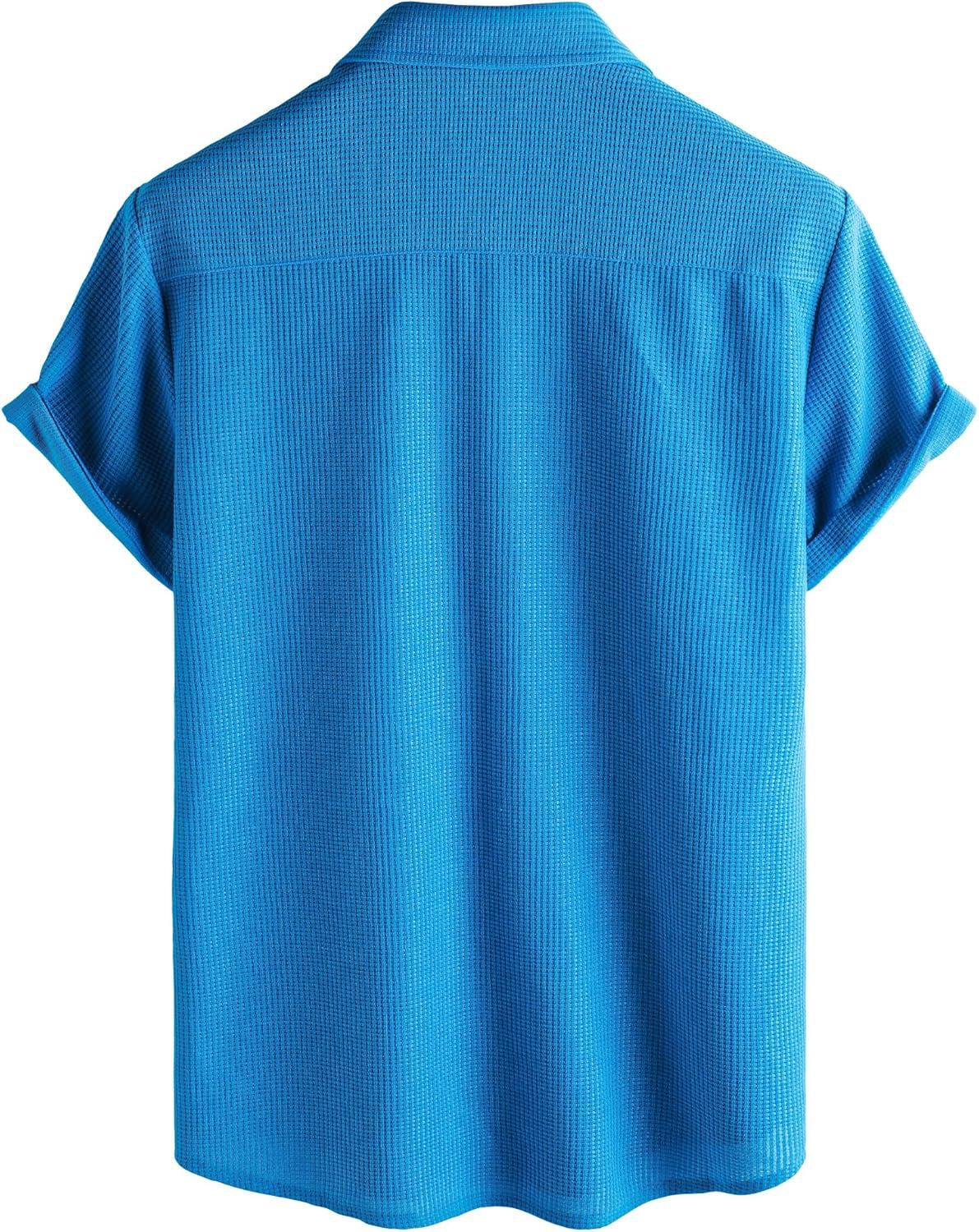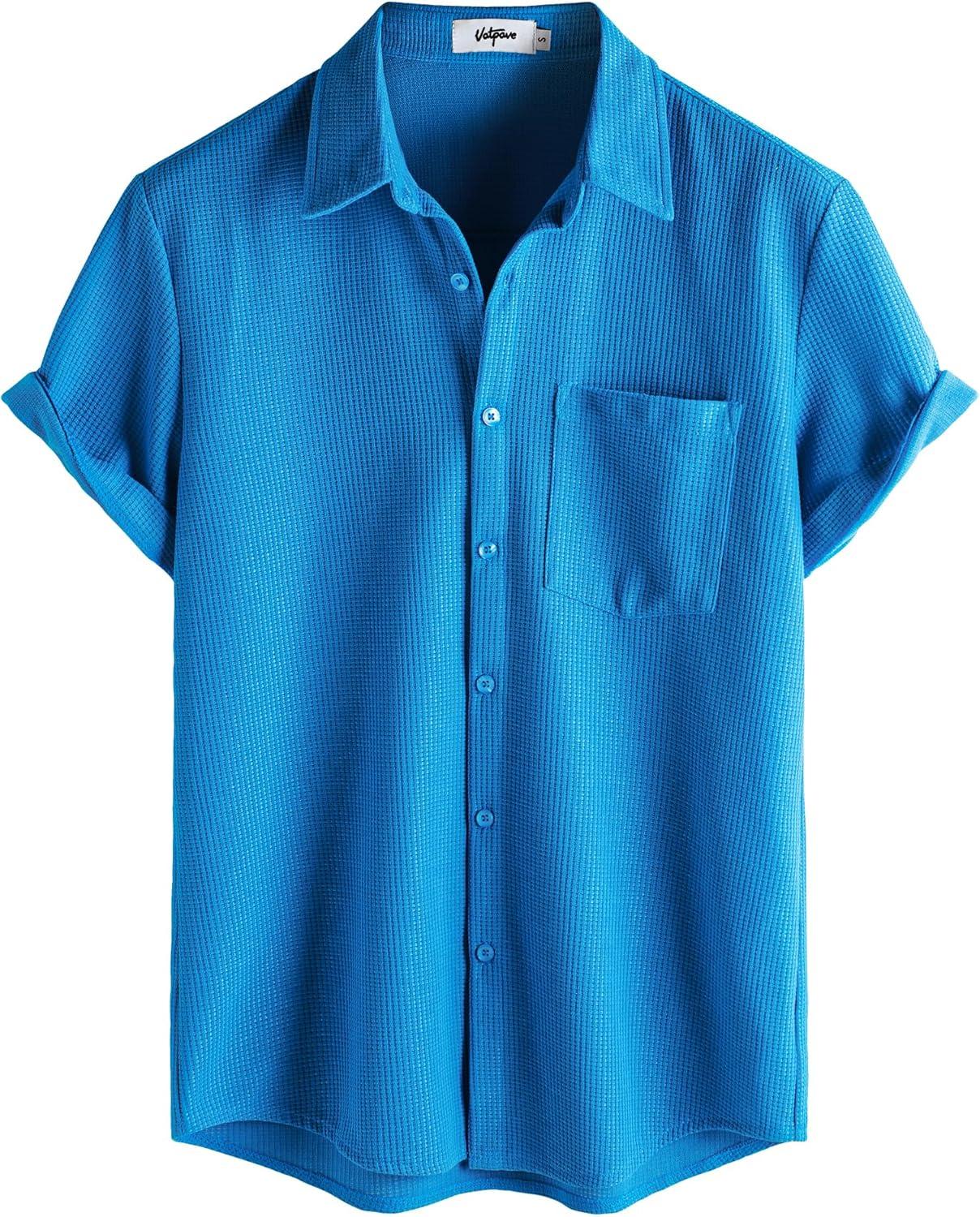 VATPAVE Mens Casual Waffle Shirt Short Sleeve Button Down Summer Shirts Loose Fit Beach Shirts(Royalblue)