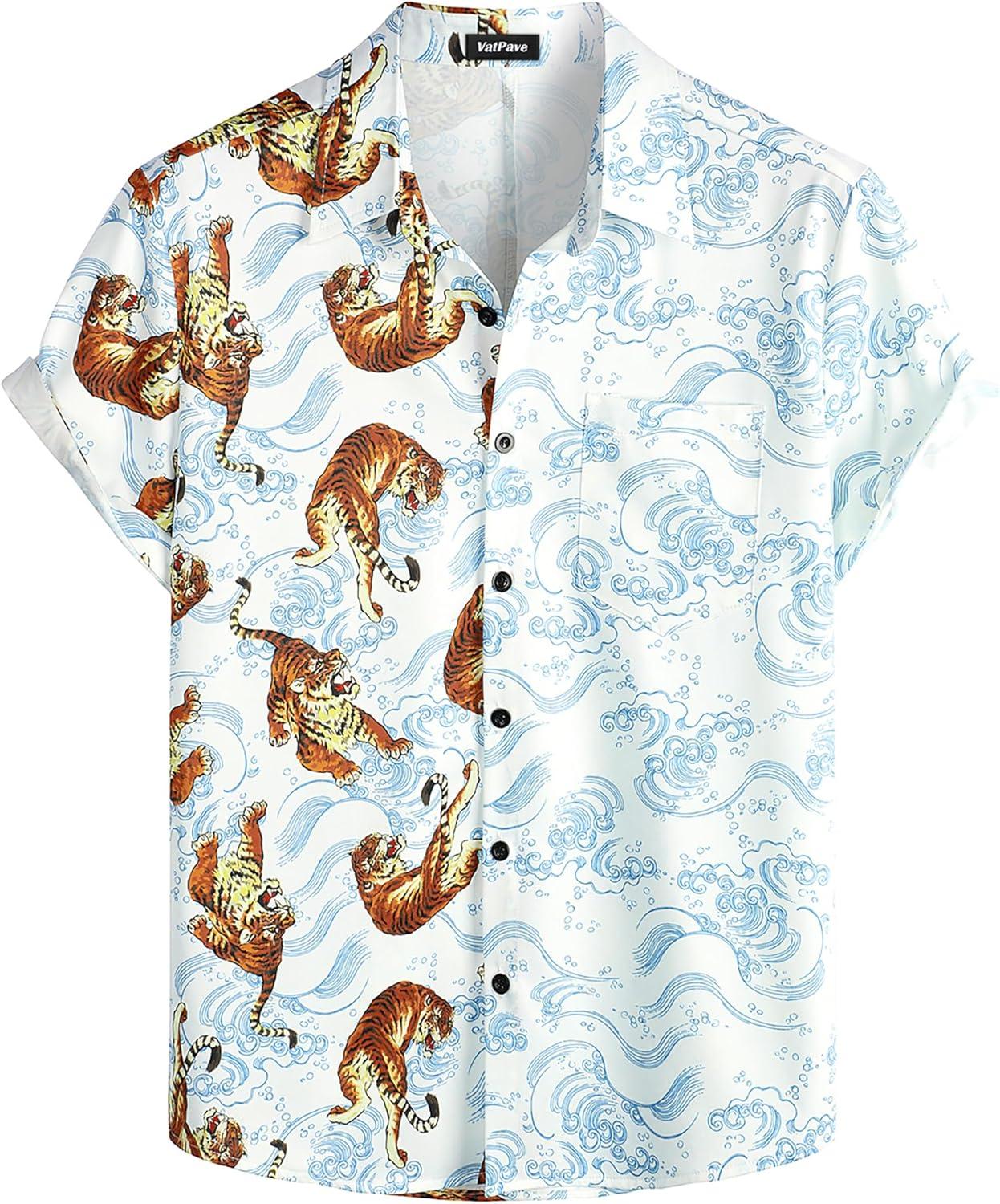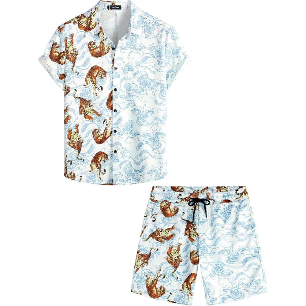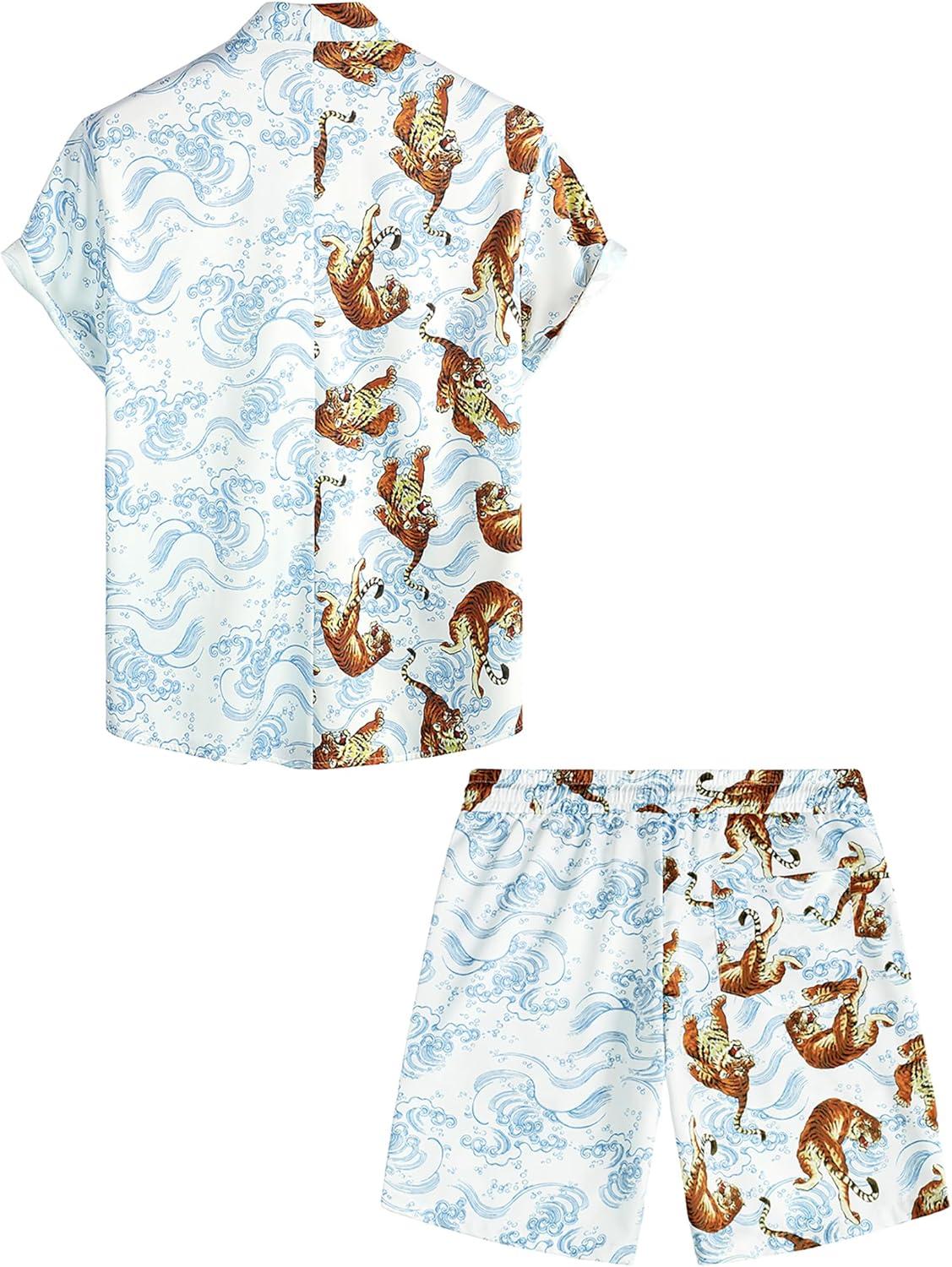 VATPAVE Mens Flamingo Hawaiian Sets Casual Short Sleeve Button Down Shirts Beach Outfits(White Tiger)