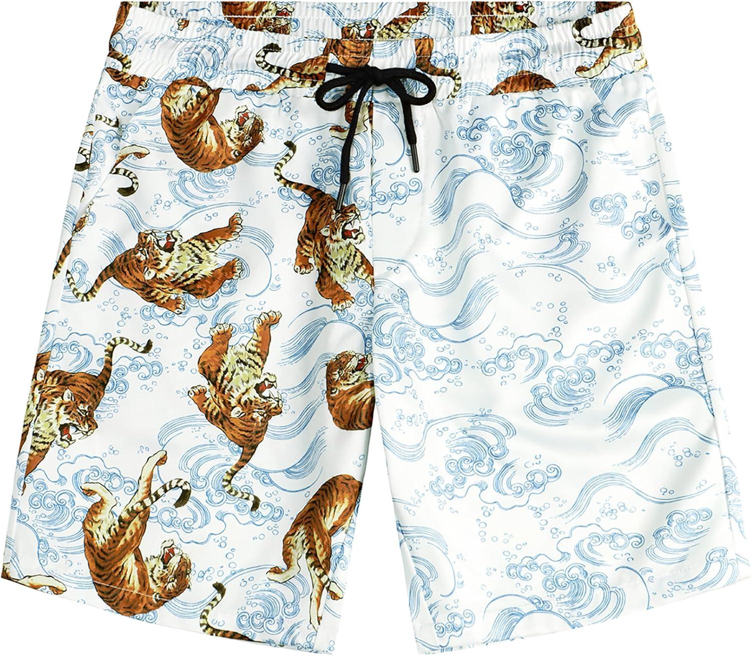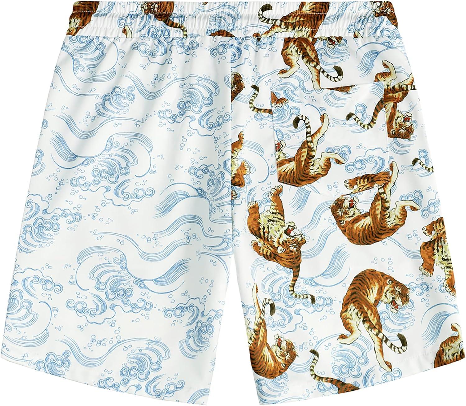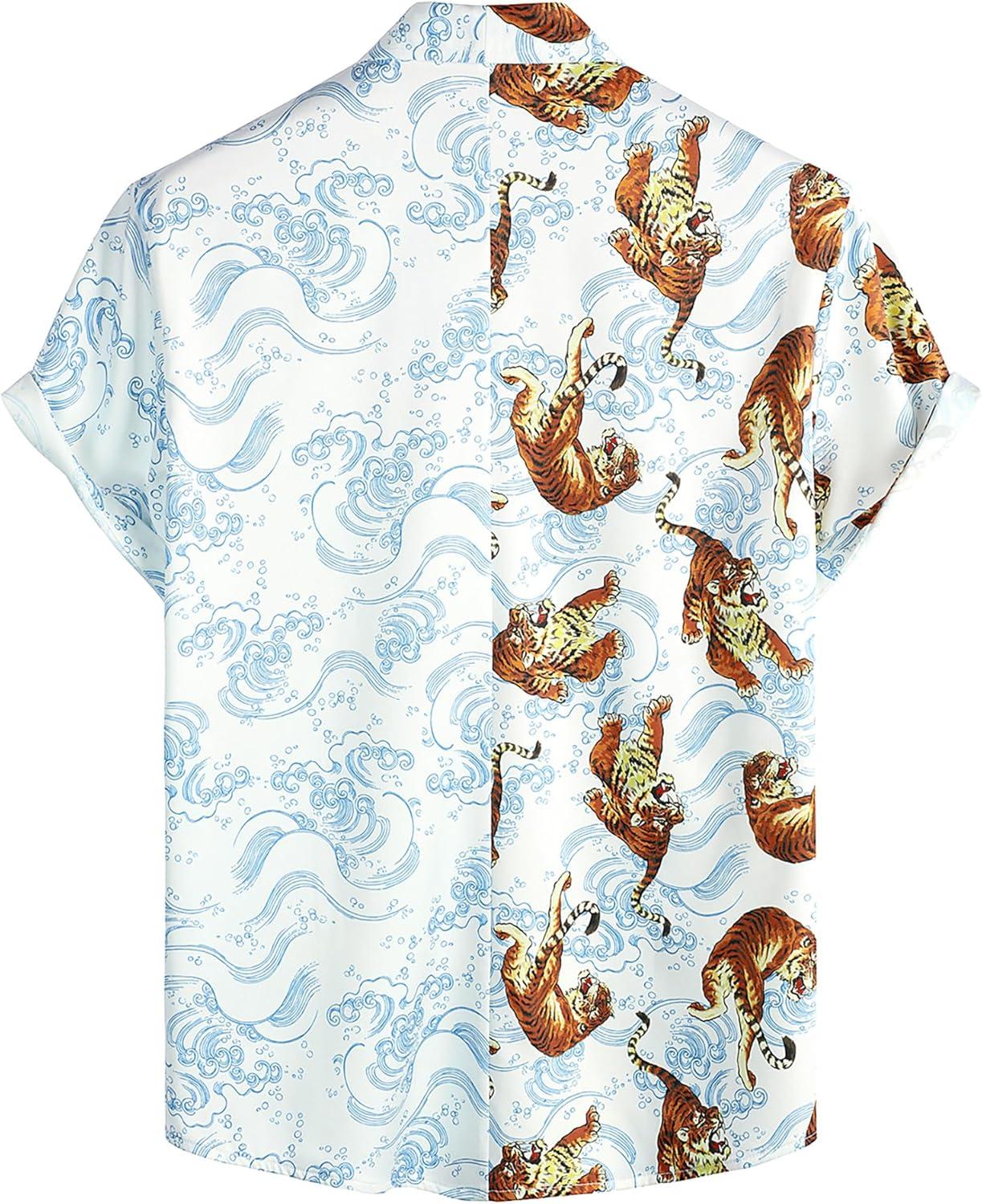 VATPAVE Mens Flamingo Hawaiian Sets Casual Short Sleeve Button Down Shirts Beach Outfits(White Tiger)