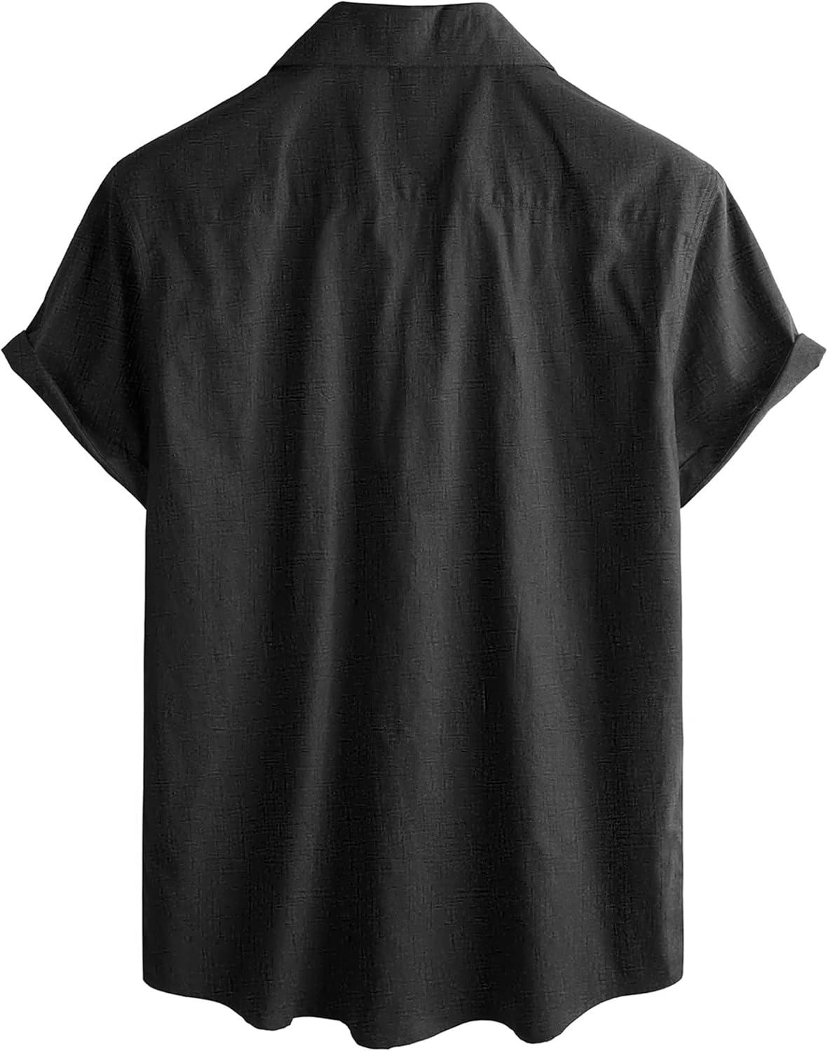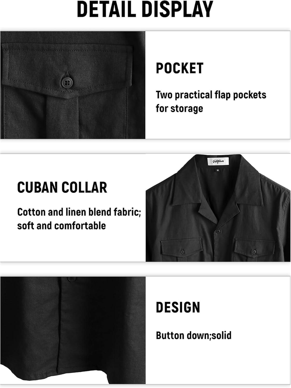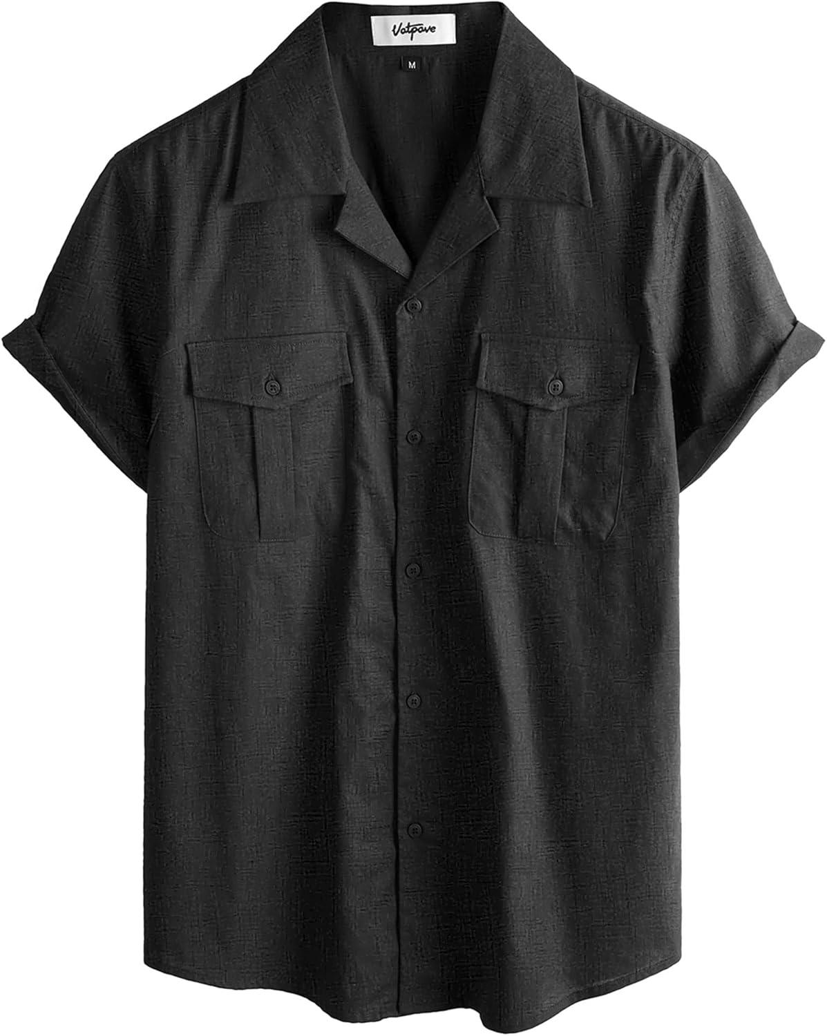 VATPAVE Mens Hawaiian Cotton Linen Shirts Short Sleeve Button Down Summer Shirts Cuban Beach Tops with Pockets(Black)