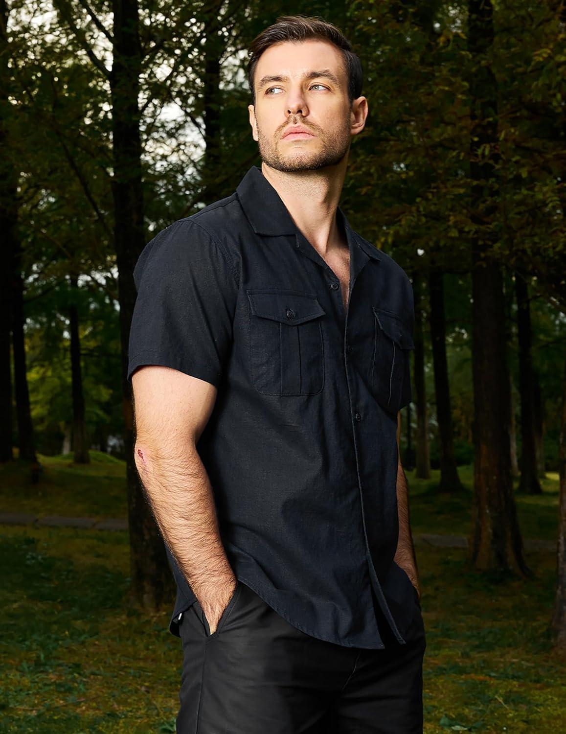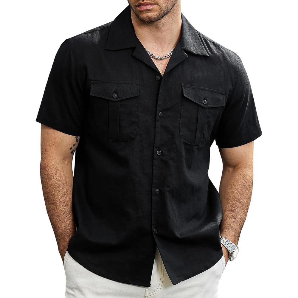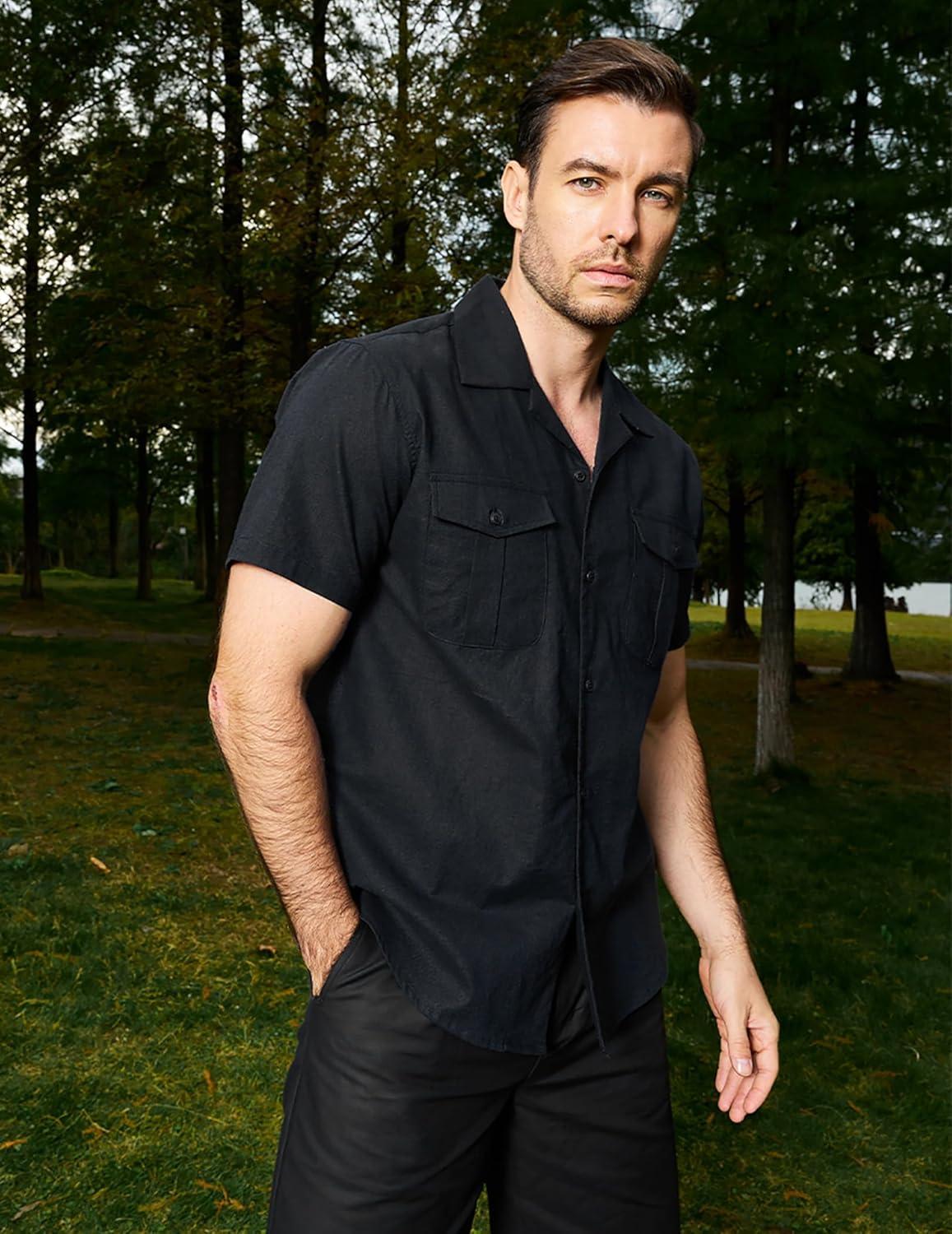 VATPAVE Mens Hawaiian Cotton Linen Shirts Short Sleeve Button Down Summer Shirts Cuban Beach Tops with Pockets(Black)