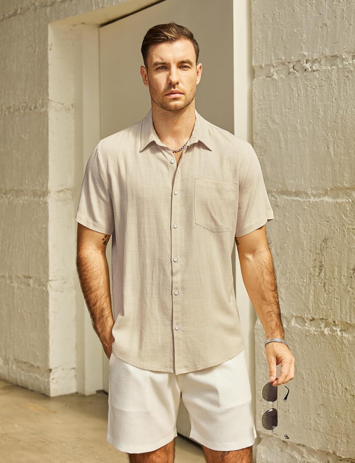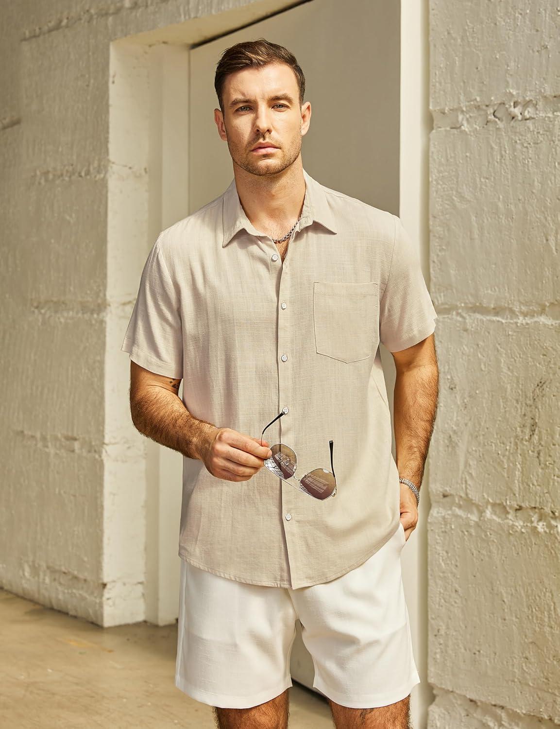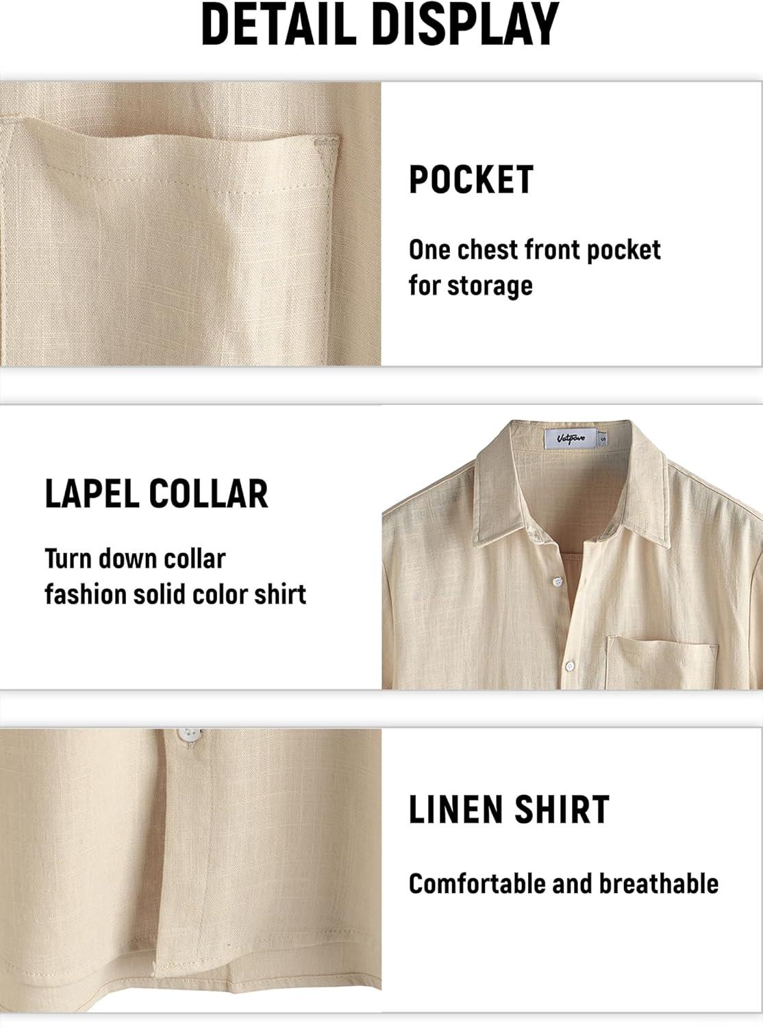 VATPAVE Mens Hawaiian Floral Shirts Cotton Linen Casual Button Down Short Sleeve Beach Shirts(Khaki)