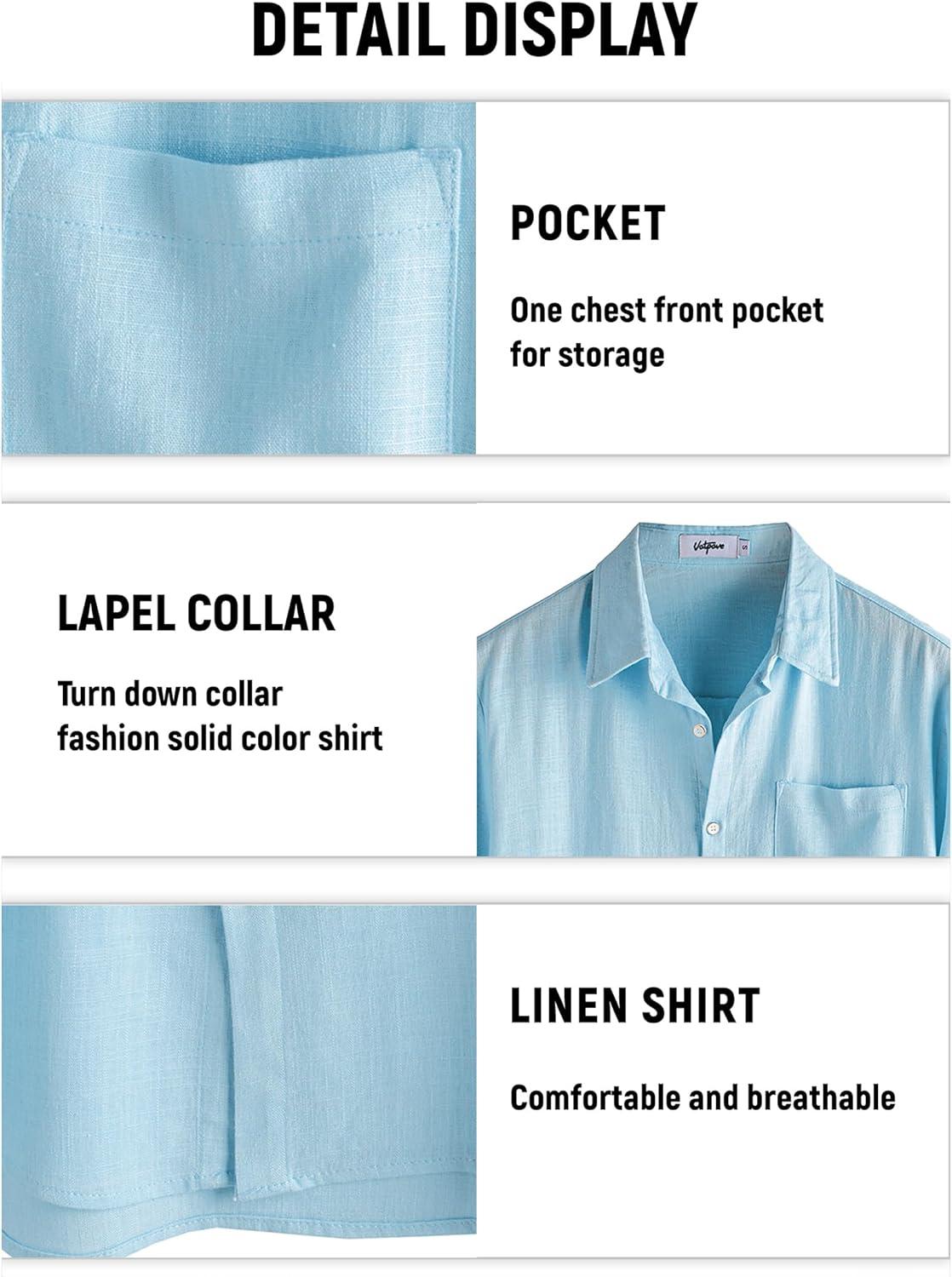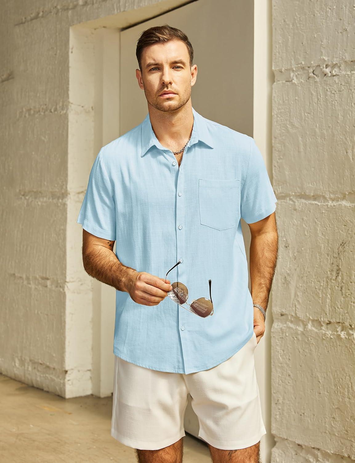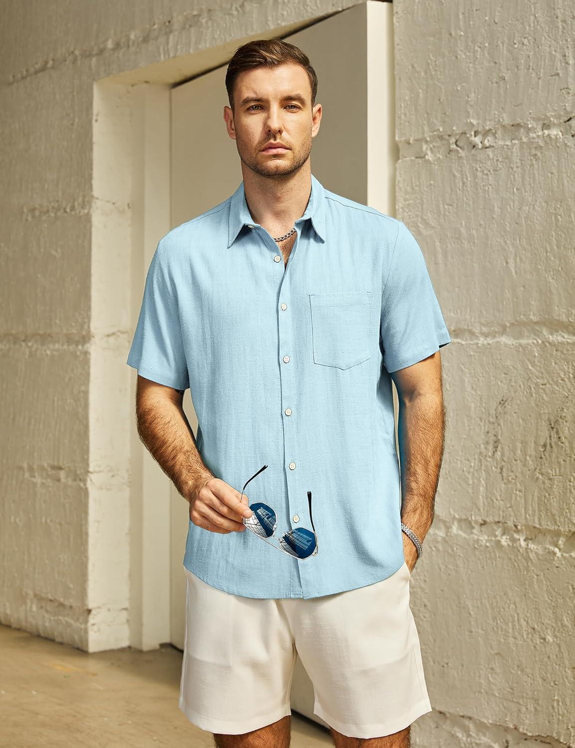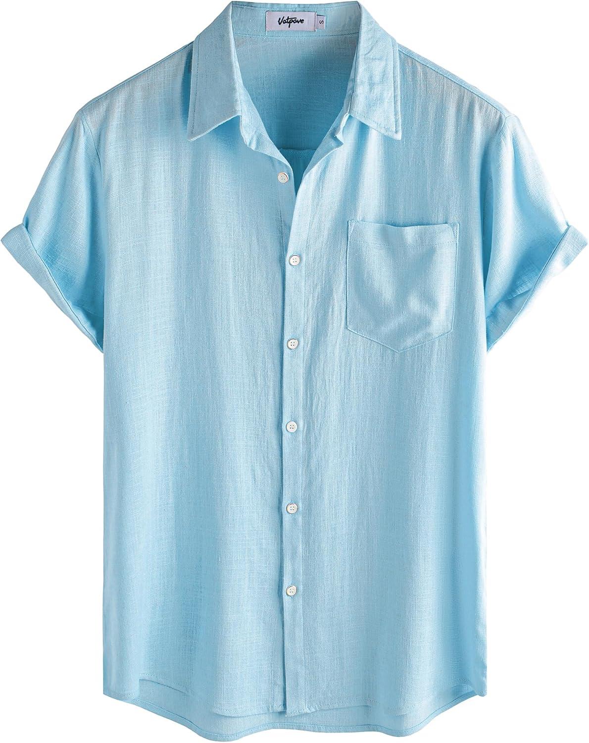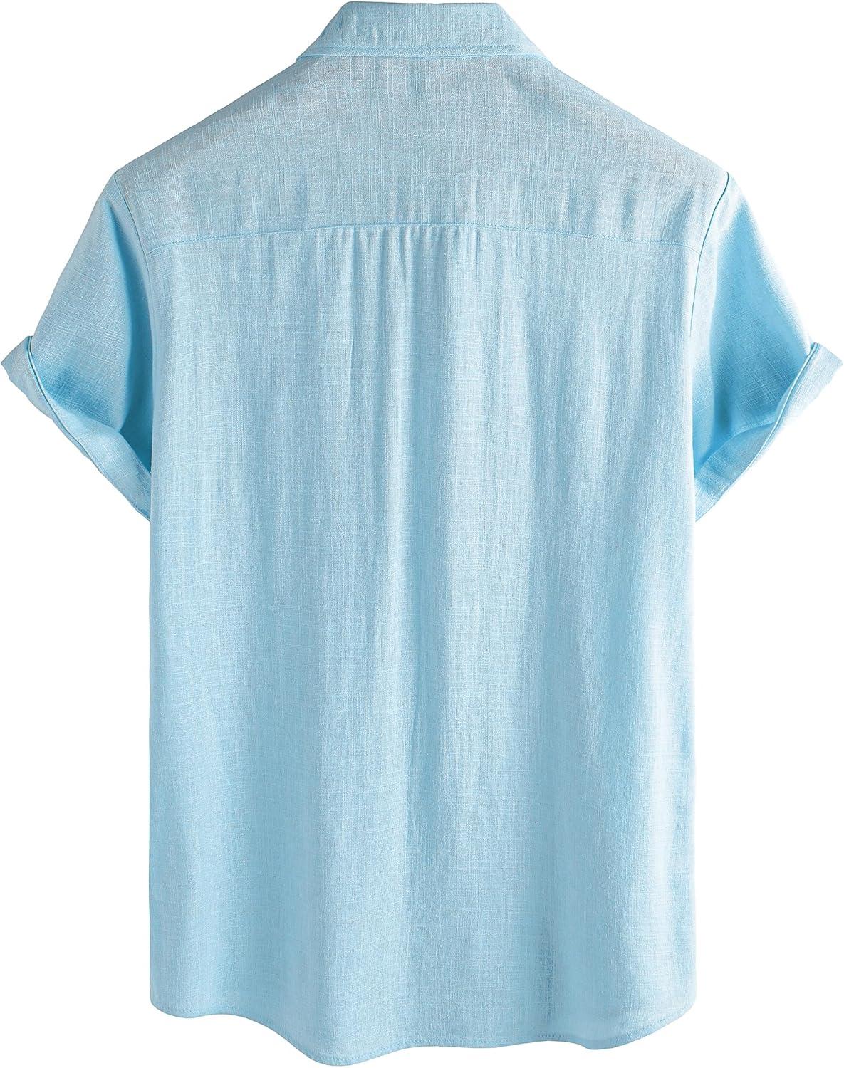 VATPAVE Mens Hawaiian Floral Shirts Cotton Linen Casual Button Down Short Sleeve Beach Shirts(Pure Lightblue)