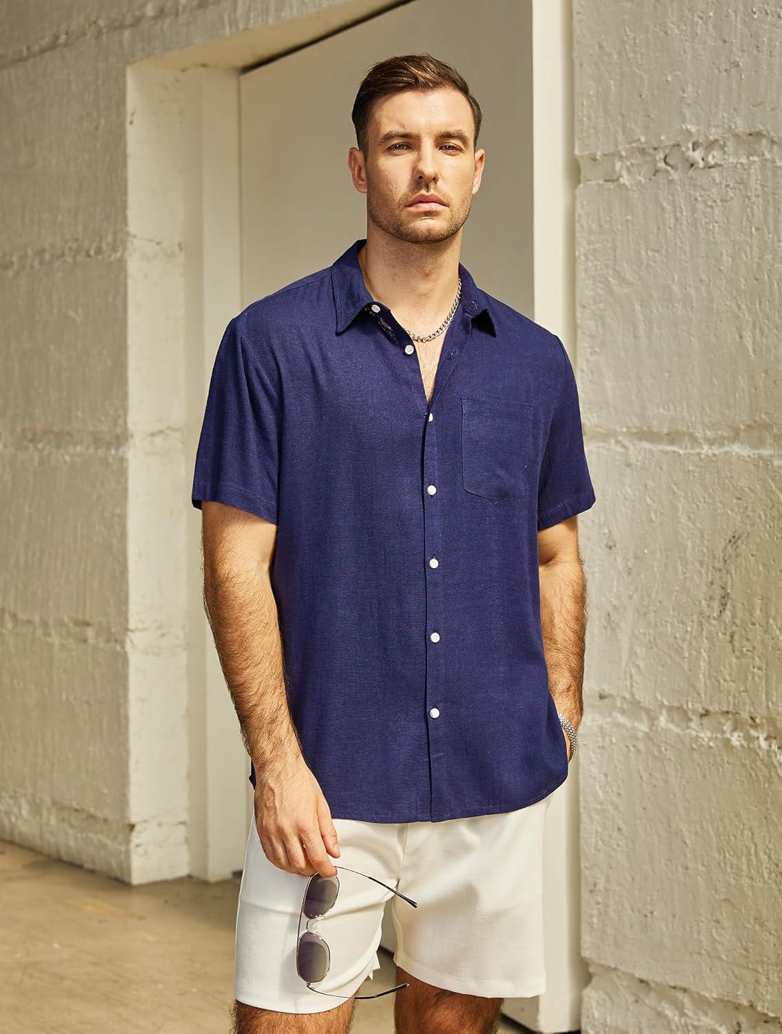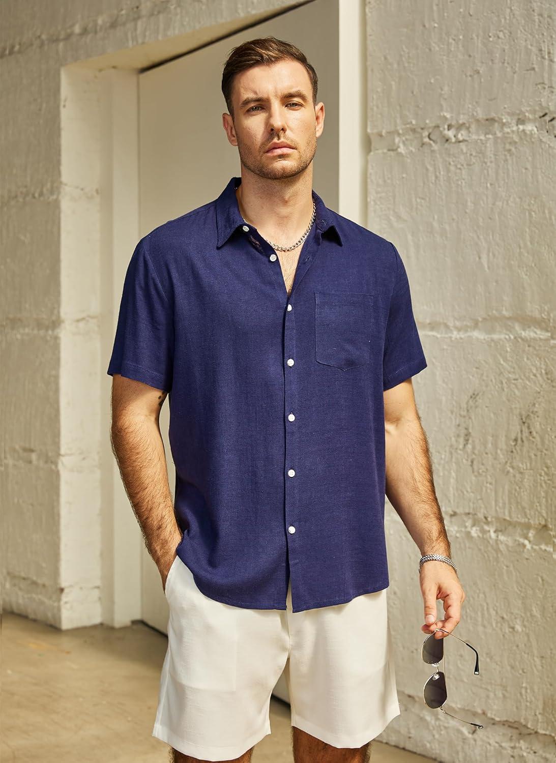 VATPAVE Mens Hawaiian Floral Shirts Cotton Linen Casual Button Down Short Sleeve Beach Shirts(Pure Royalblue)