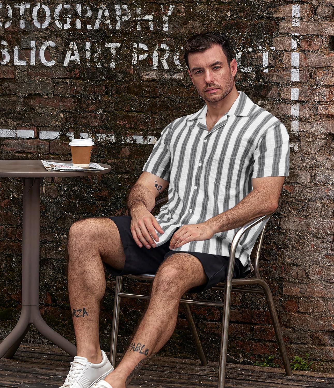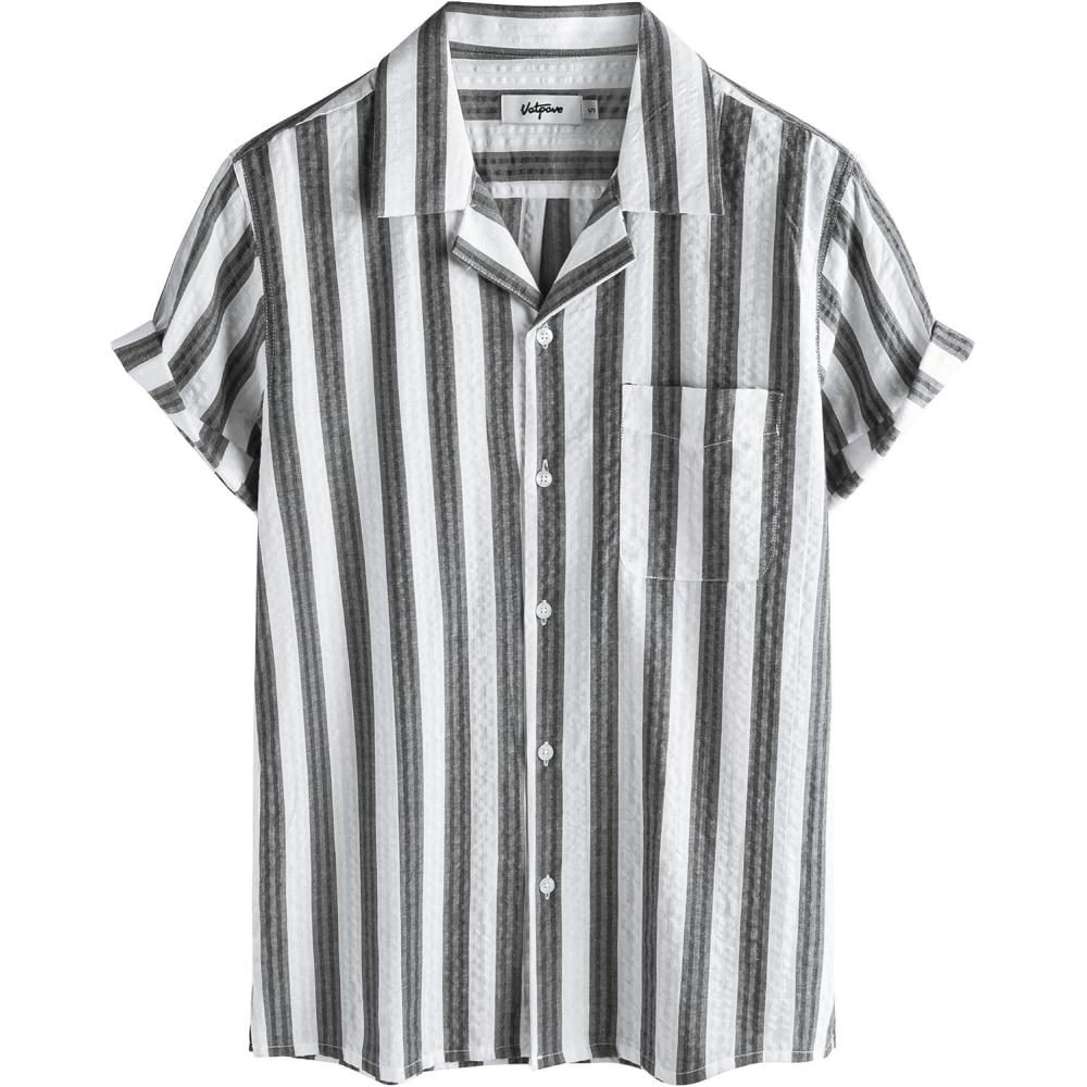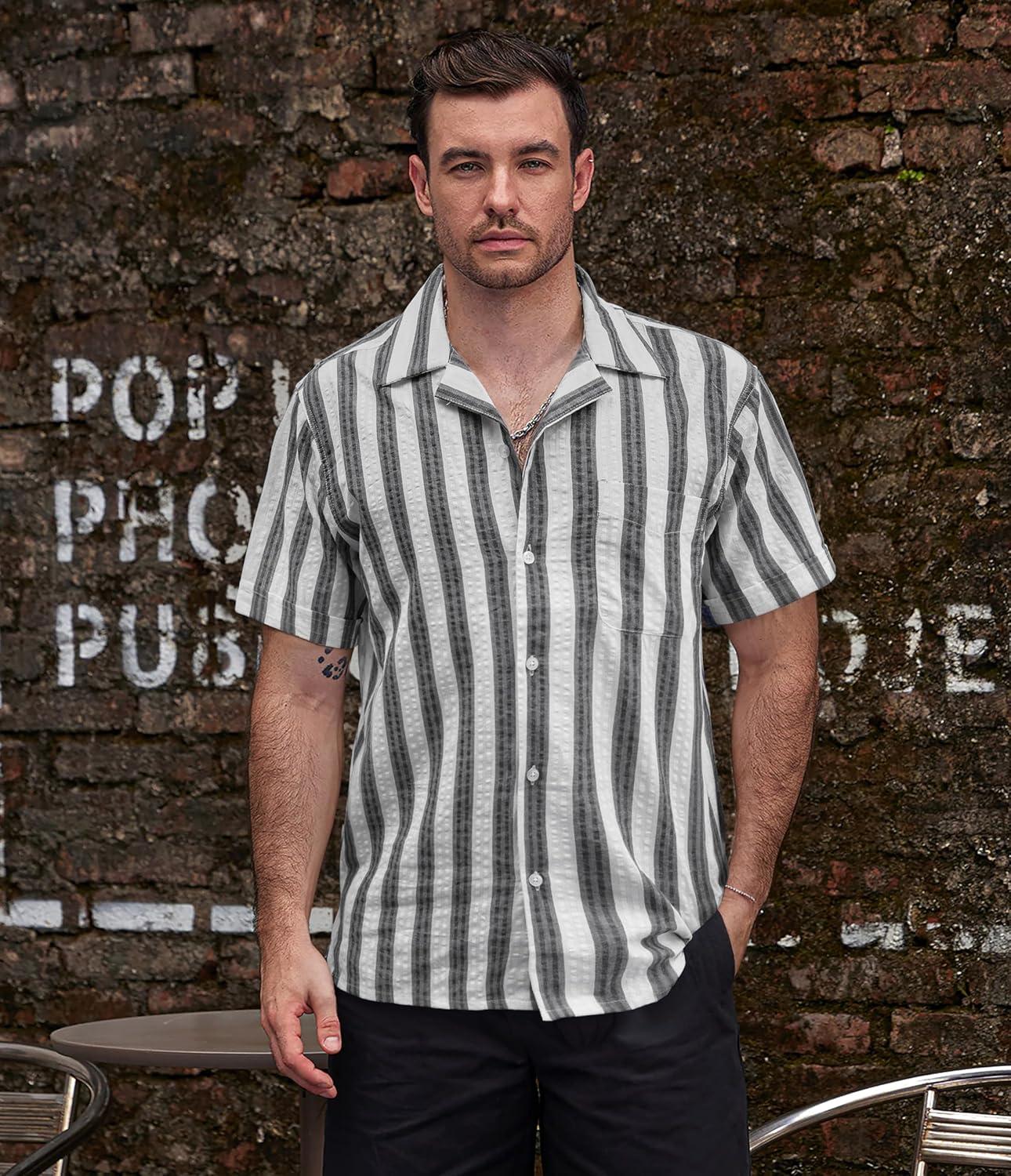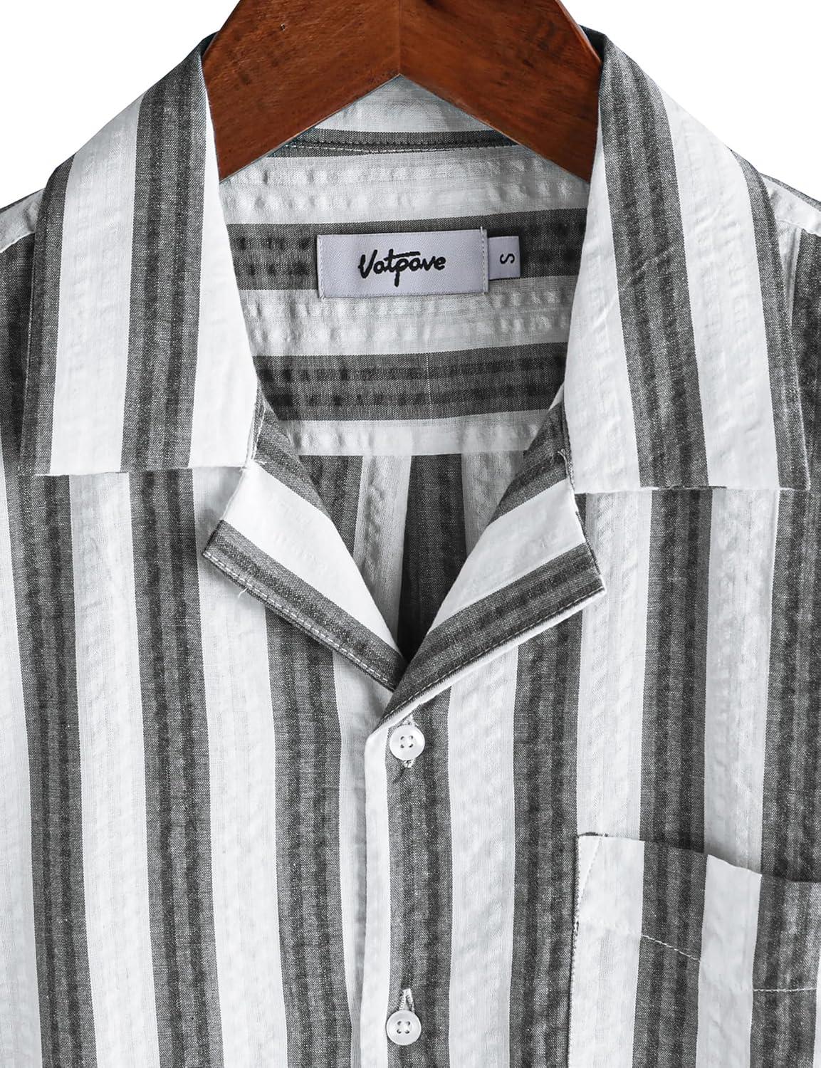 VATPAVE Mens Striped Summer Shirt Casual Button Down Short Sleeve Beach Shirts Cotton Shirts for Men(Black Gray)