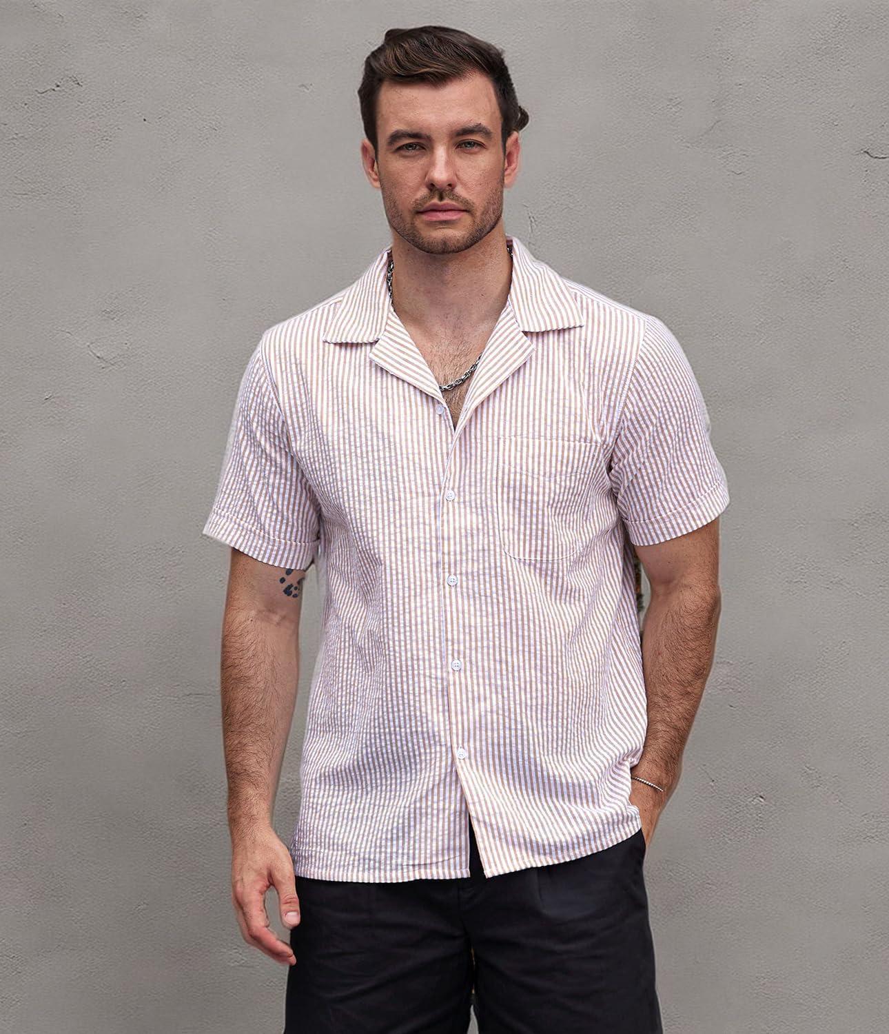 VATPAVE Mens Striped Summer Shirt Casual Button Down Short Sleeve Beach Shirts Cotton Shirts for Men(Khaki Brown)